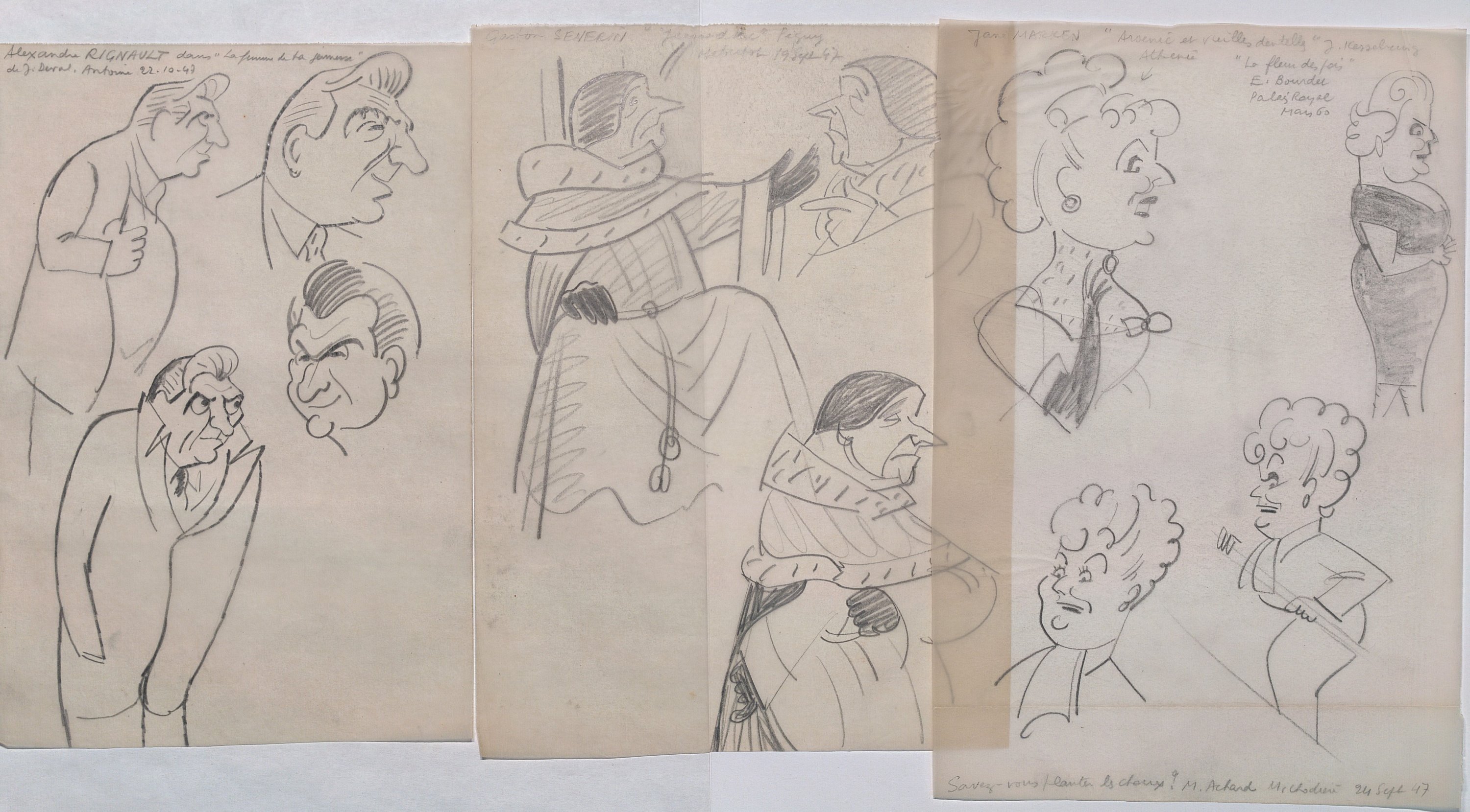 La plupart des croquis caricaturent des comédien/nes en représentation dans les théâtres parisiens (Michodière, Vieux Colombier, Capucines, La Coupole, Madeleine, Marigny, Renaissance, Folies bergères, Montparnasse, Mathurins, Athénée, etc).