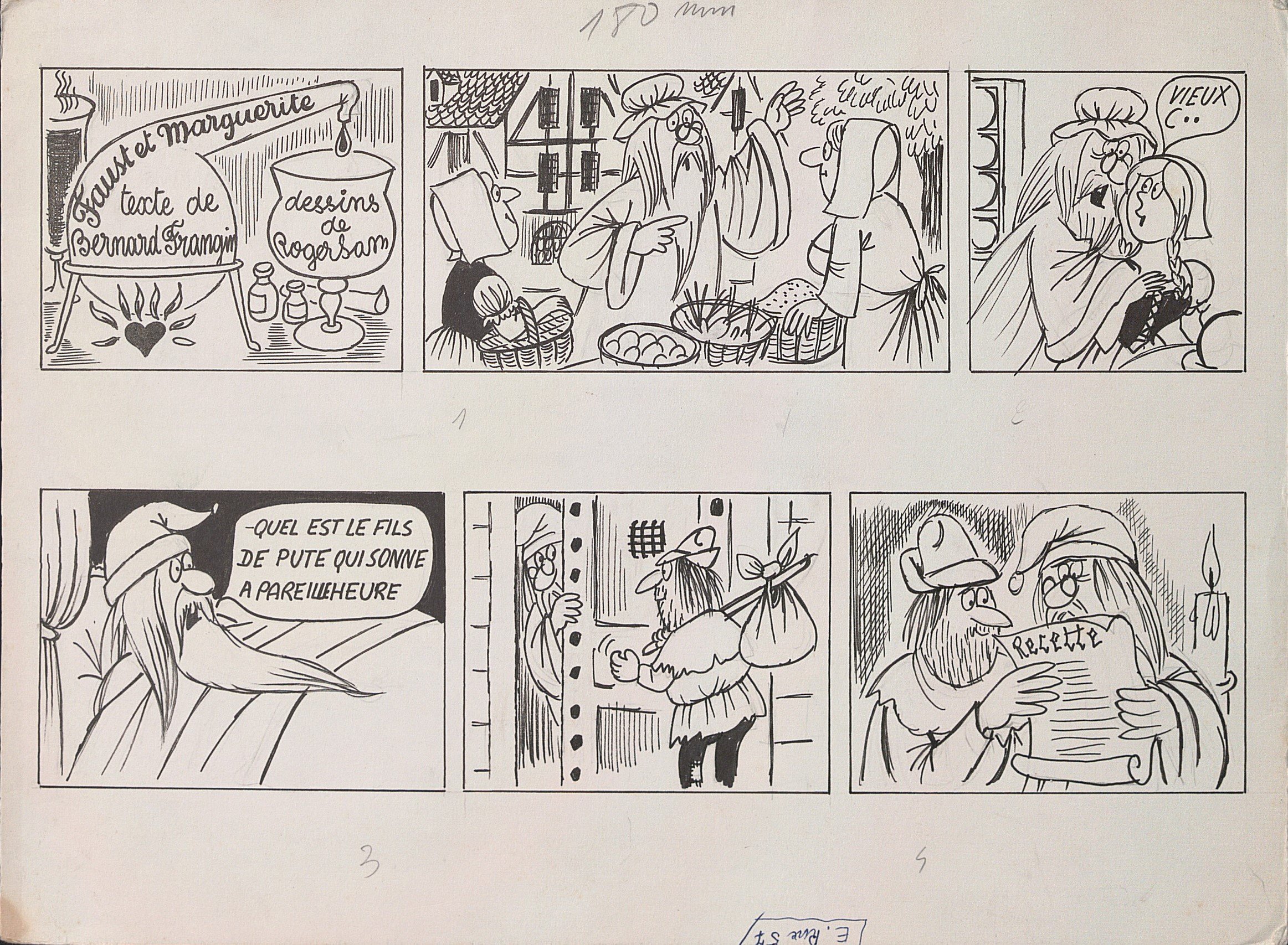 Faust et Marguerite, 3 planches de strips, encre, texte de Bernard Frangin, 24 x 32 cm ;
