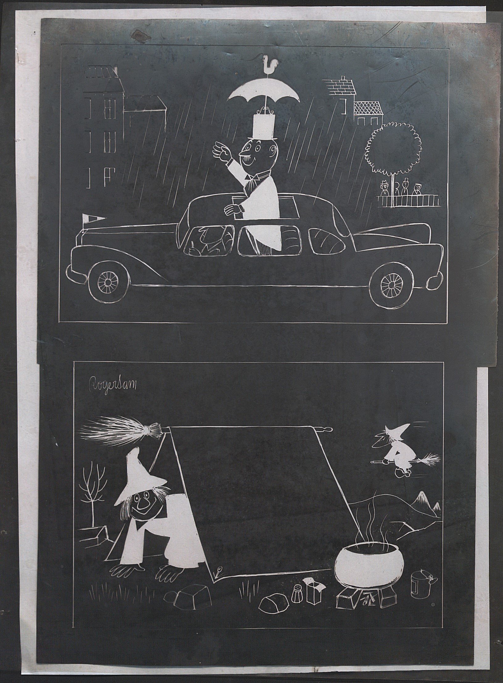 Les cloches, encre, signé en bas à droite, légendé au crayon « Elle veut se faire prendre pour un spoutnik », 24 x 32 cm ;