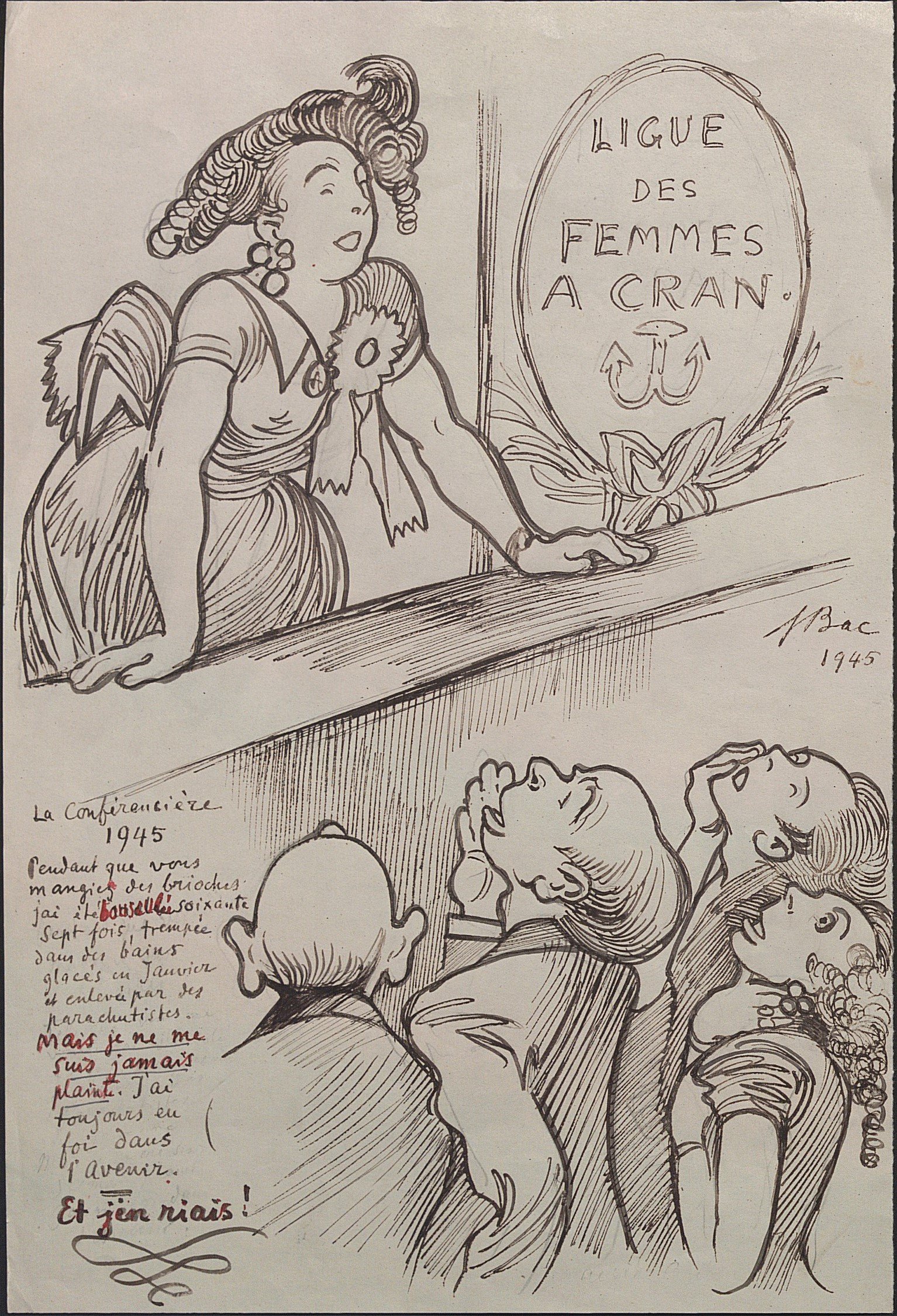 La conférencière, encre, sur papier, signé à droite et daté 1945, légendé, 31 x 21 cm ;