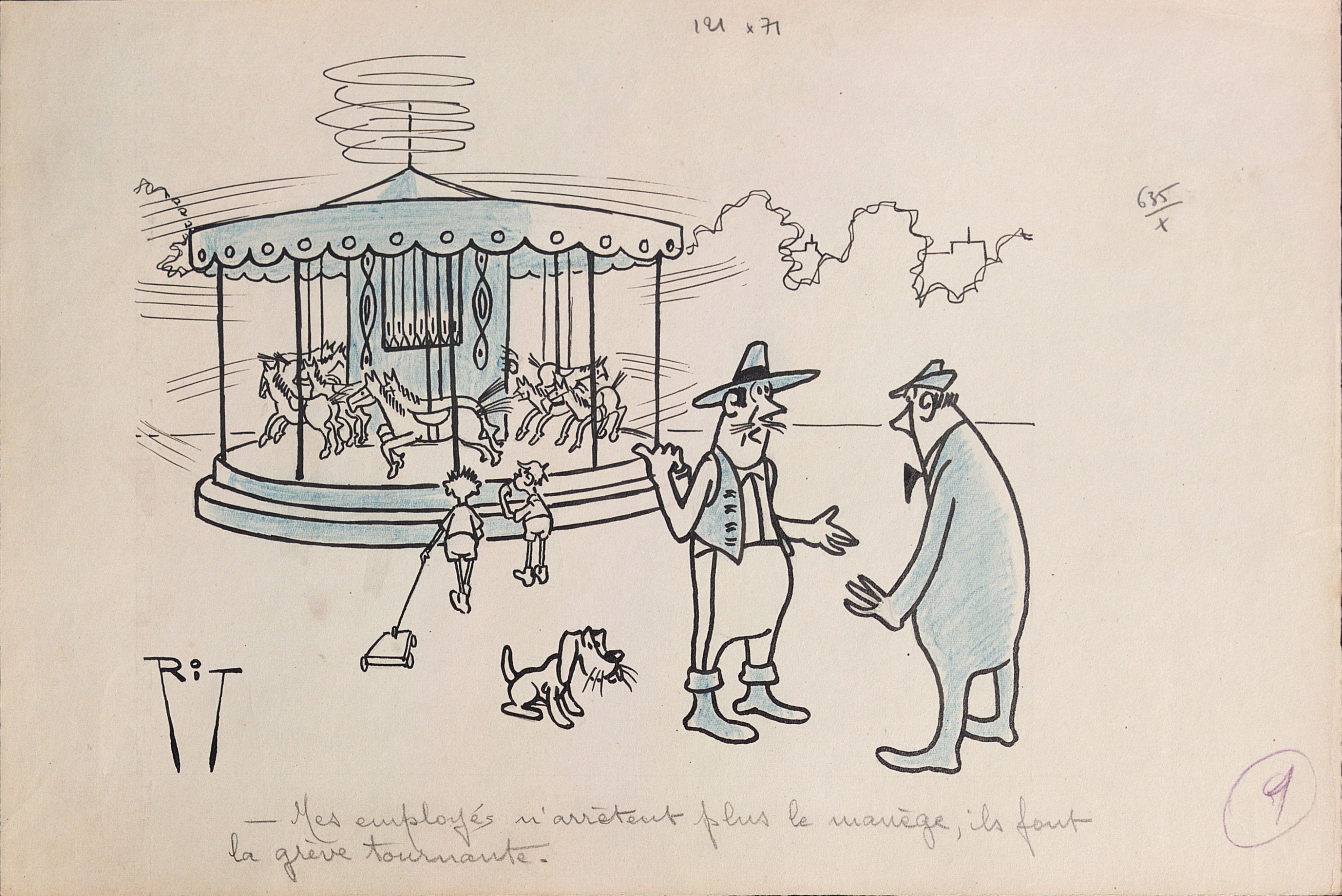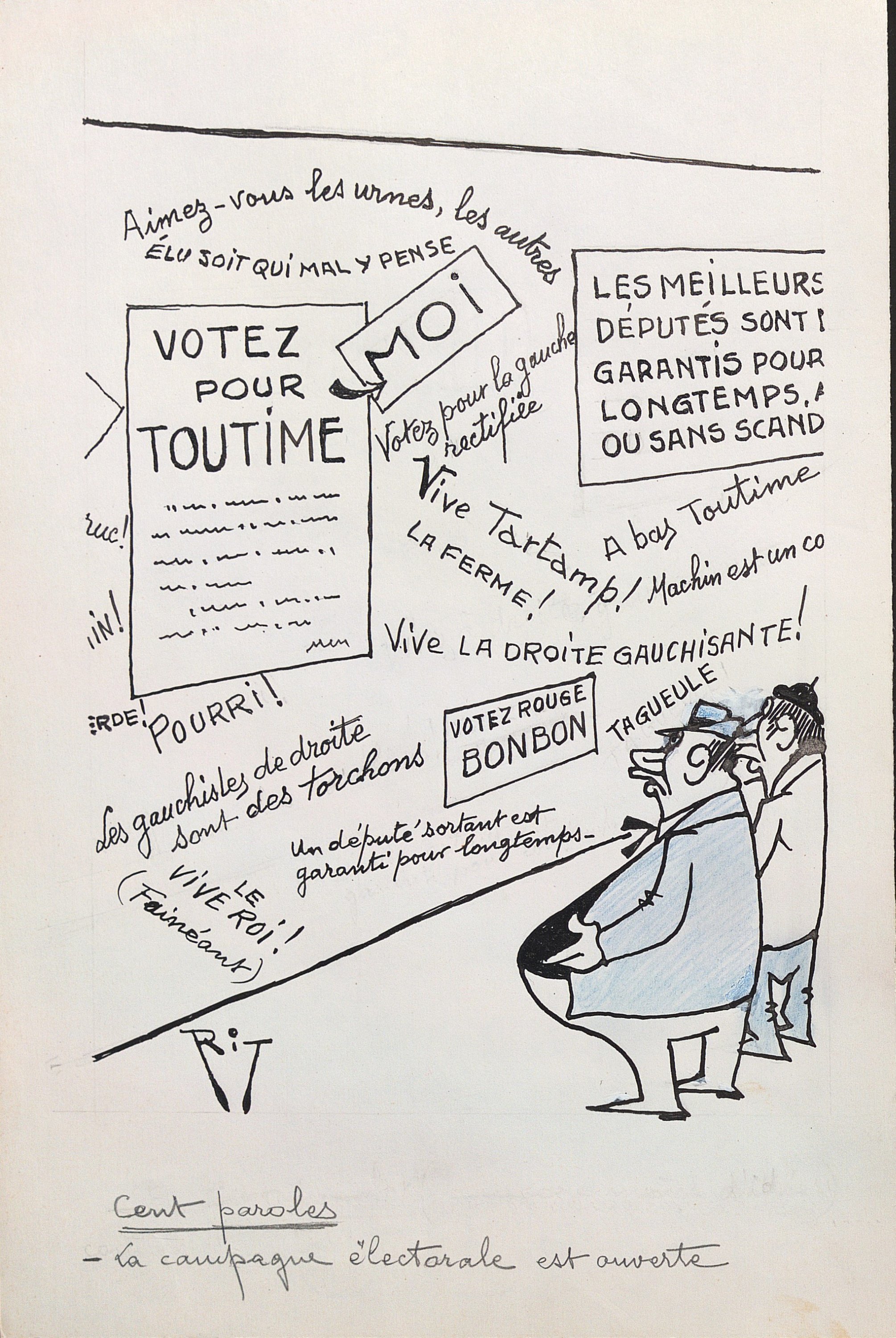 Maquettes destinées à la publication dans la presse satirique et humoristique tel que le journal « Franc-Rire » édité à partir de 1957 par André Rouff, dont : Au cirque ; La bouche de l’innocence ; Bonnet blanc et blanc bonnet ; Cent paroles ; Géométrie ; etc.