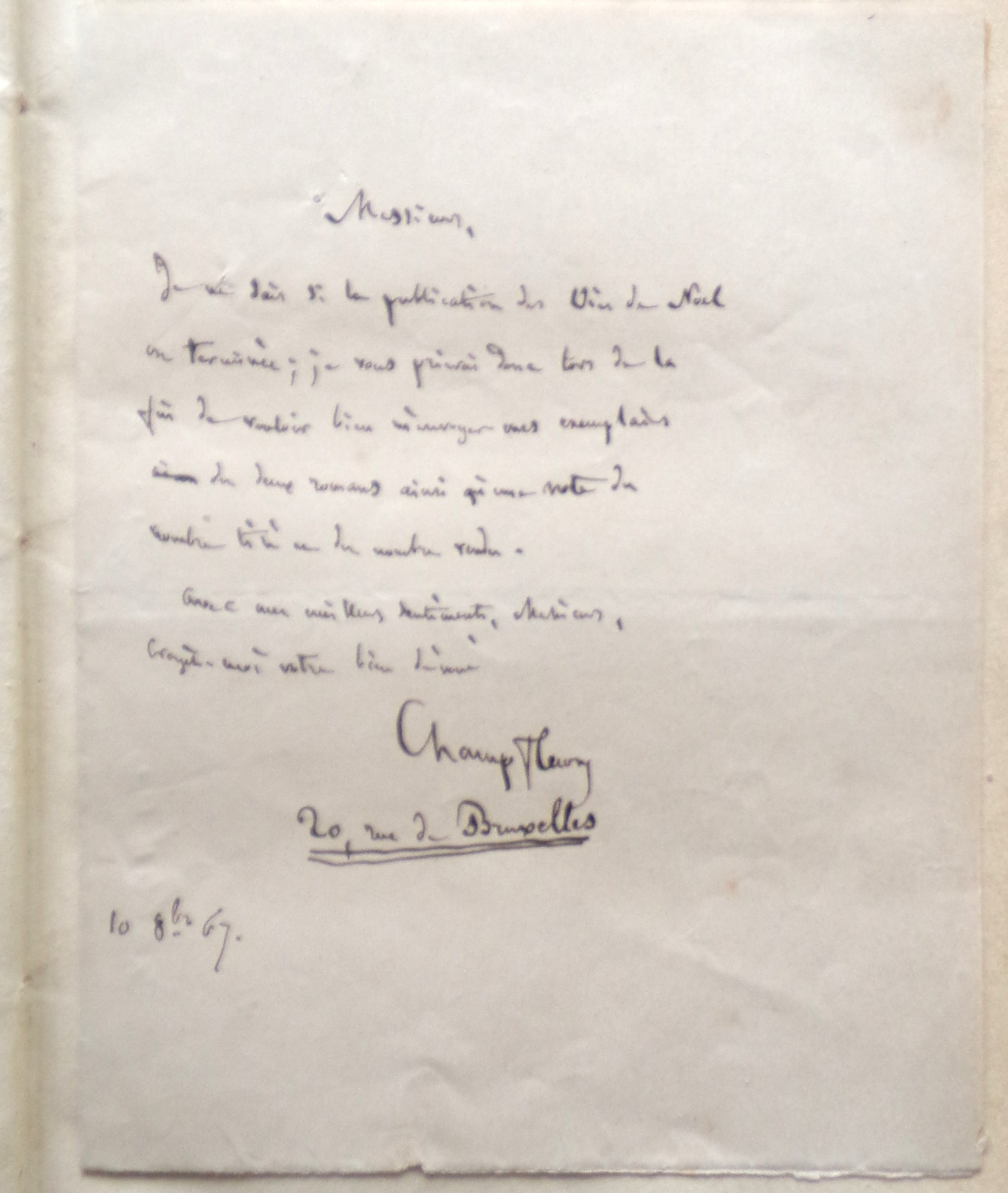 Champfleury, Histoire de la caricature sous la République, l’Empire et la Restauration. 2e édition très augmentée. Paris, Dentu, [1849]. In-8 rel. ½ maroquin, 363 pp. Avec L.A.S. du 10 octobre 1867, 1 page in-12 ;