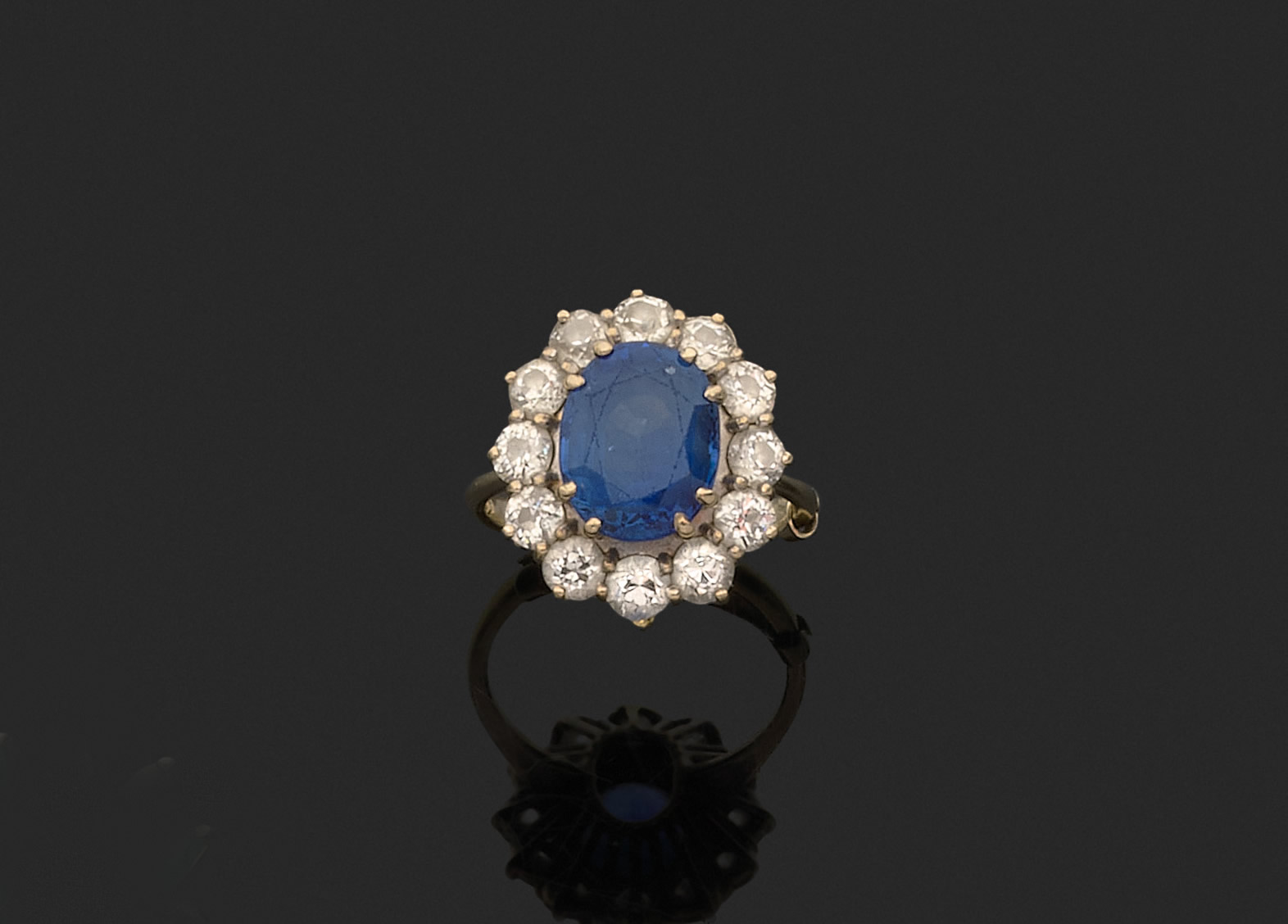 Or gris 750 millièmes, ornée au centre d'un saphir ovale d'environ 4 à 5 cts dans un entourage de douze diamants ronds de taille brillant ou de taille ancienne d'environ 1,00 à 1,30 cts au total.