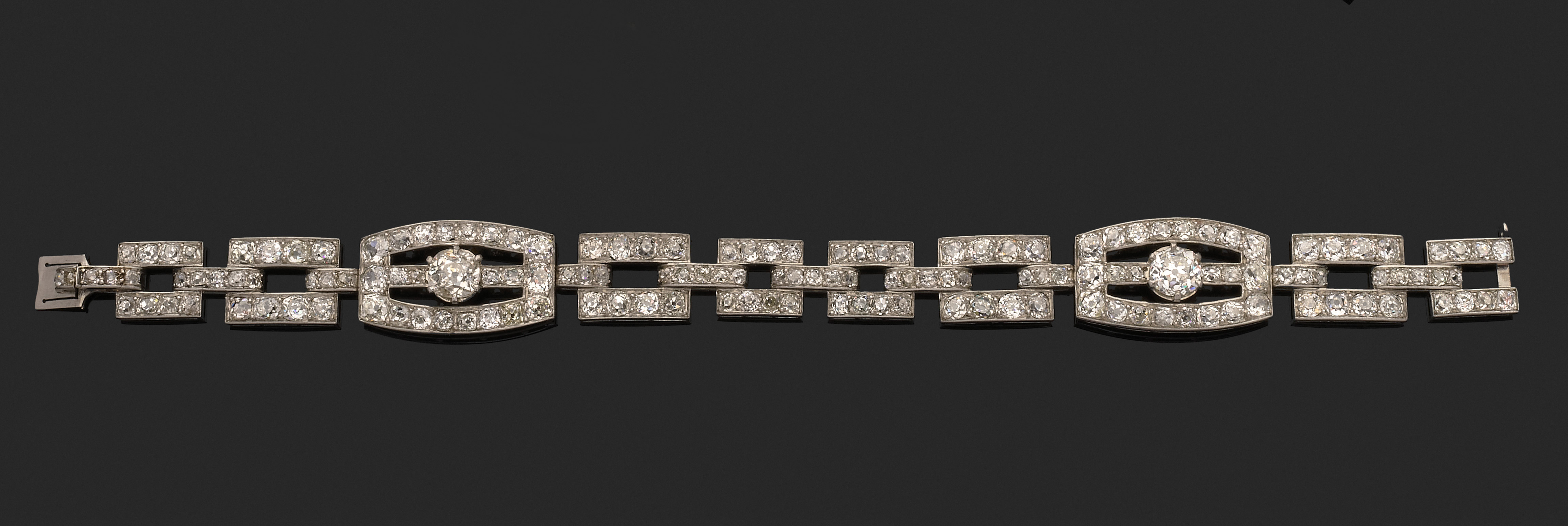 Platine 850 millièmes, les maillons ajourés à décor géométrique entièrement sertis de diamants ronds de taille ancienne, deux plus importants d'environ 0.80 ct chacun.