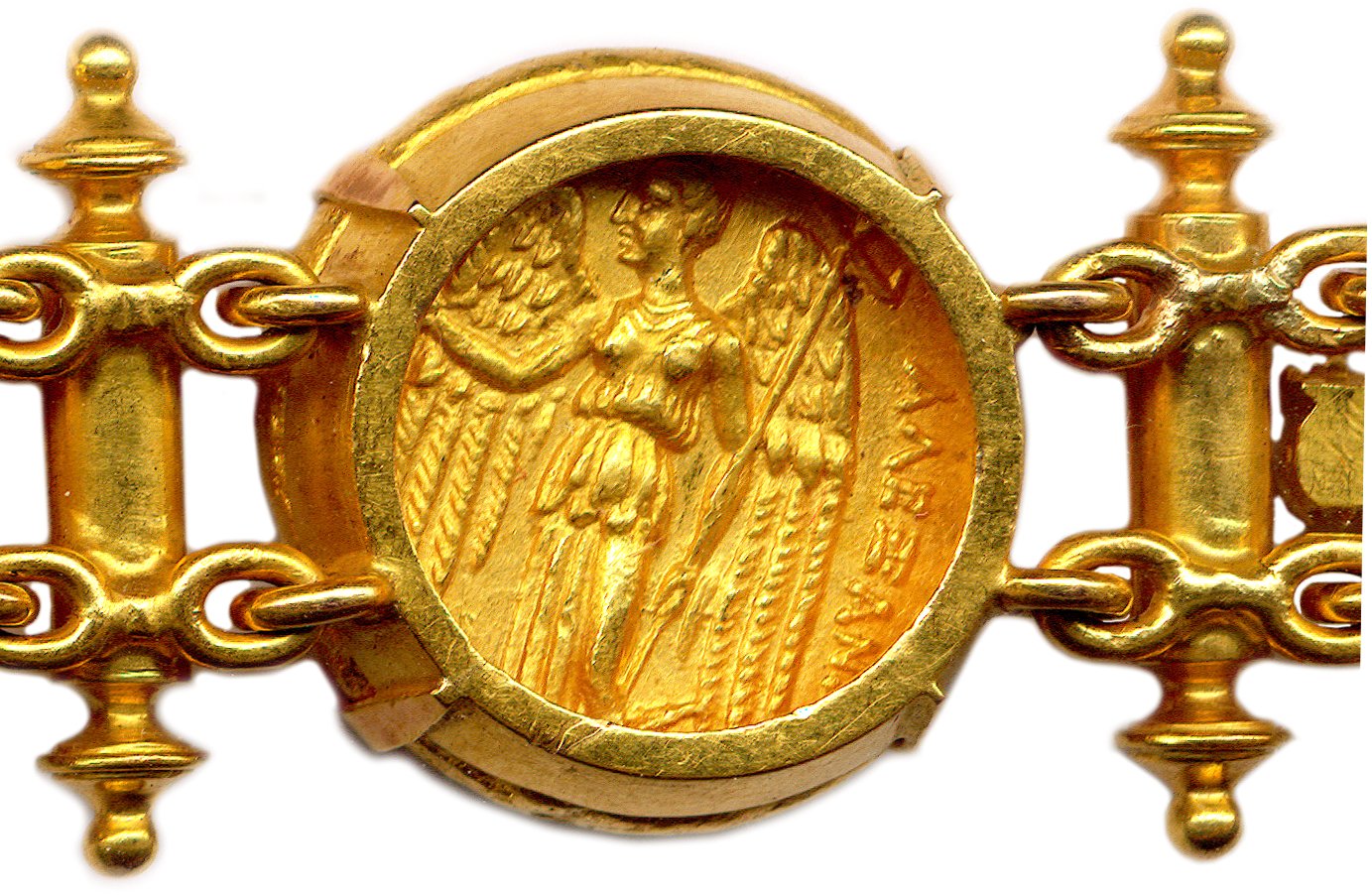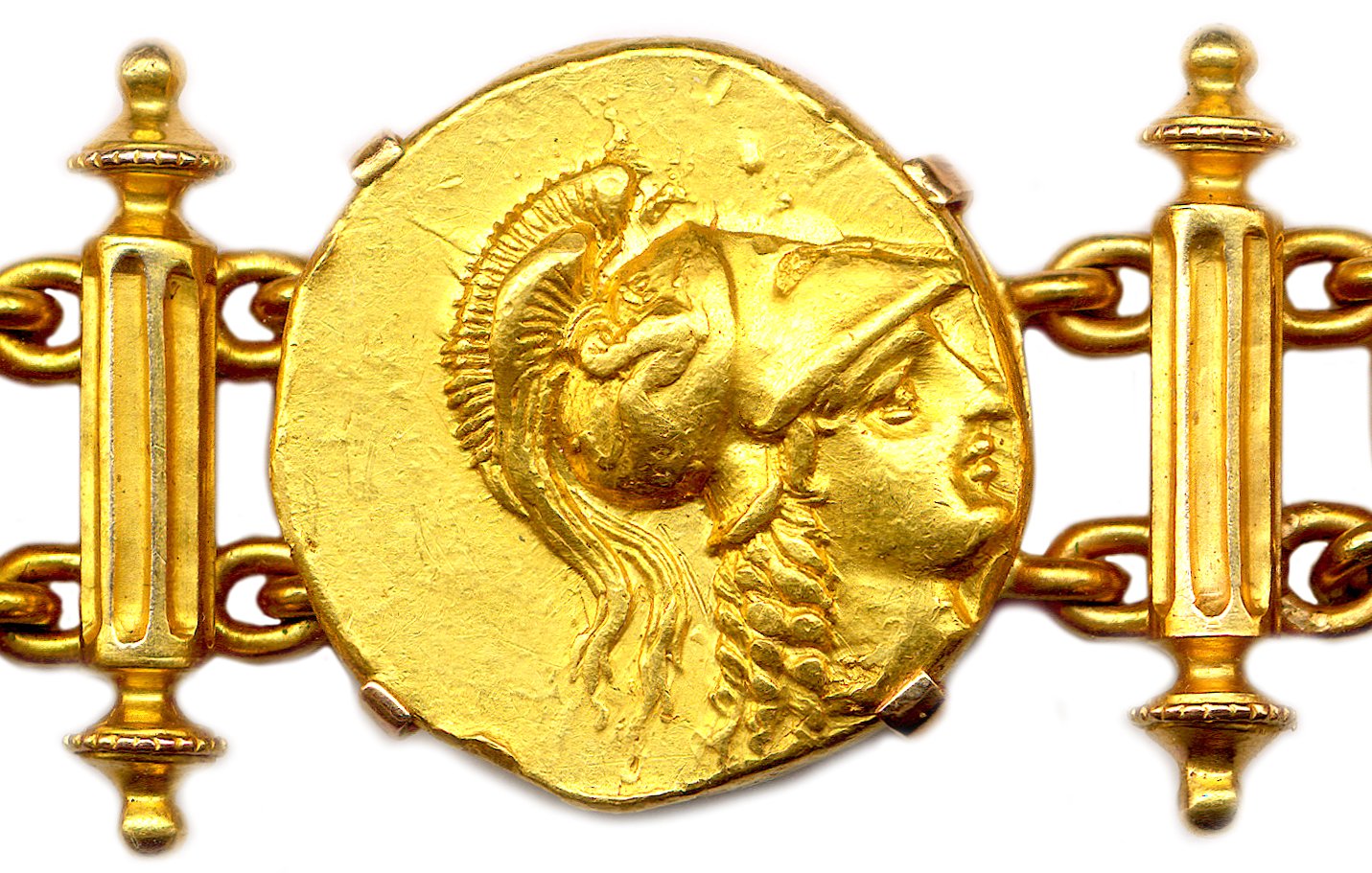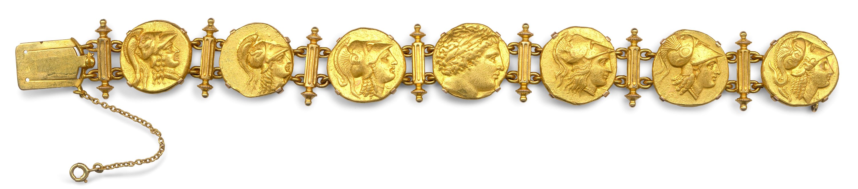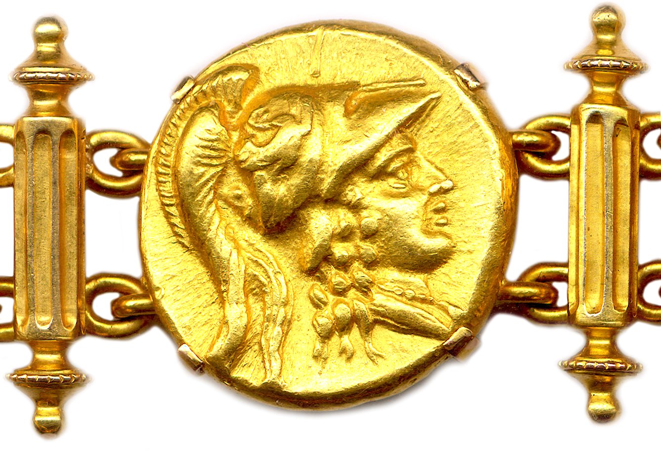A bracelet made of seven 18K gold staters from the Kingdom of Macedonia. One gold stater of Philip II of Macedon and six gold staters of his son Alexander the Great.