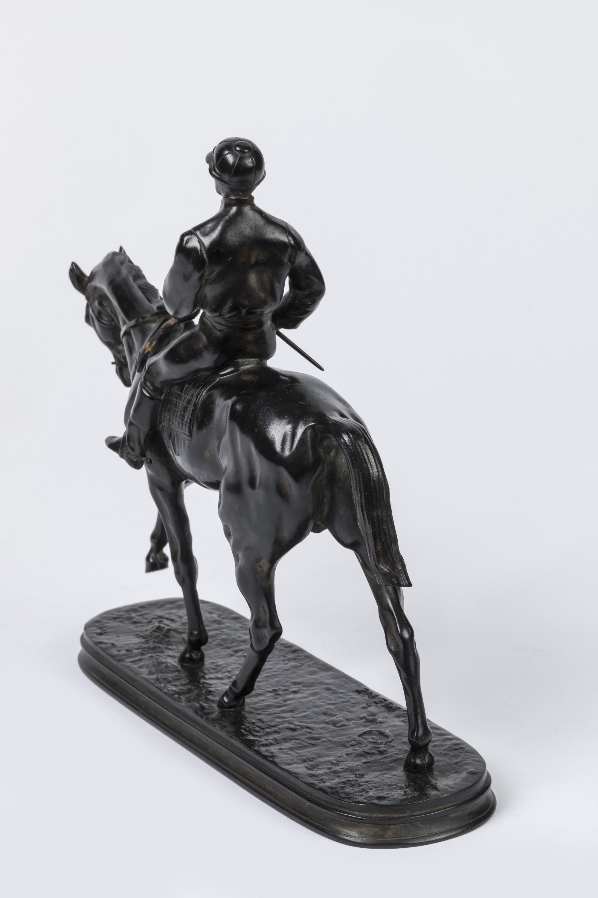 After Pierre-Jules Mène. A bronze sculpture of a jockey on horseback. Signed.