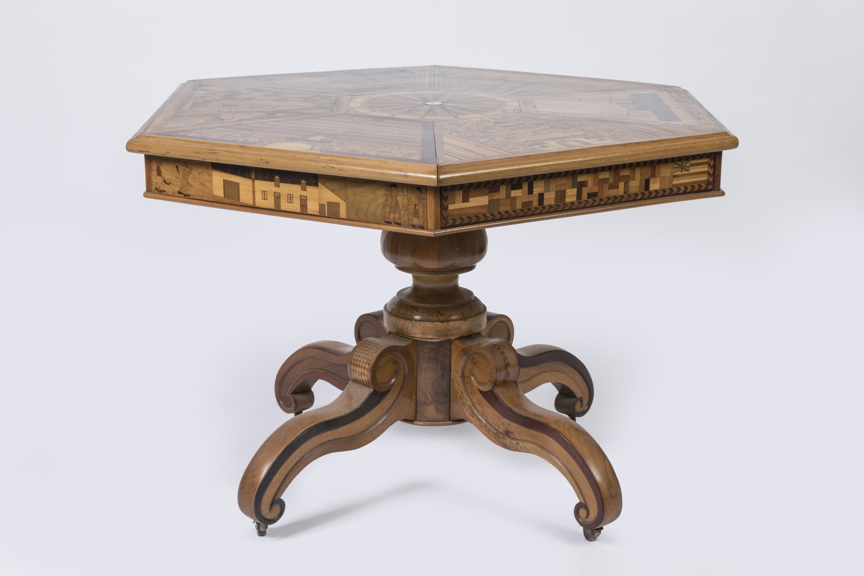 An octogonal marquetry table depicting the part played by France around the world. Made in honor of the 1889 Paris Exposition.
