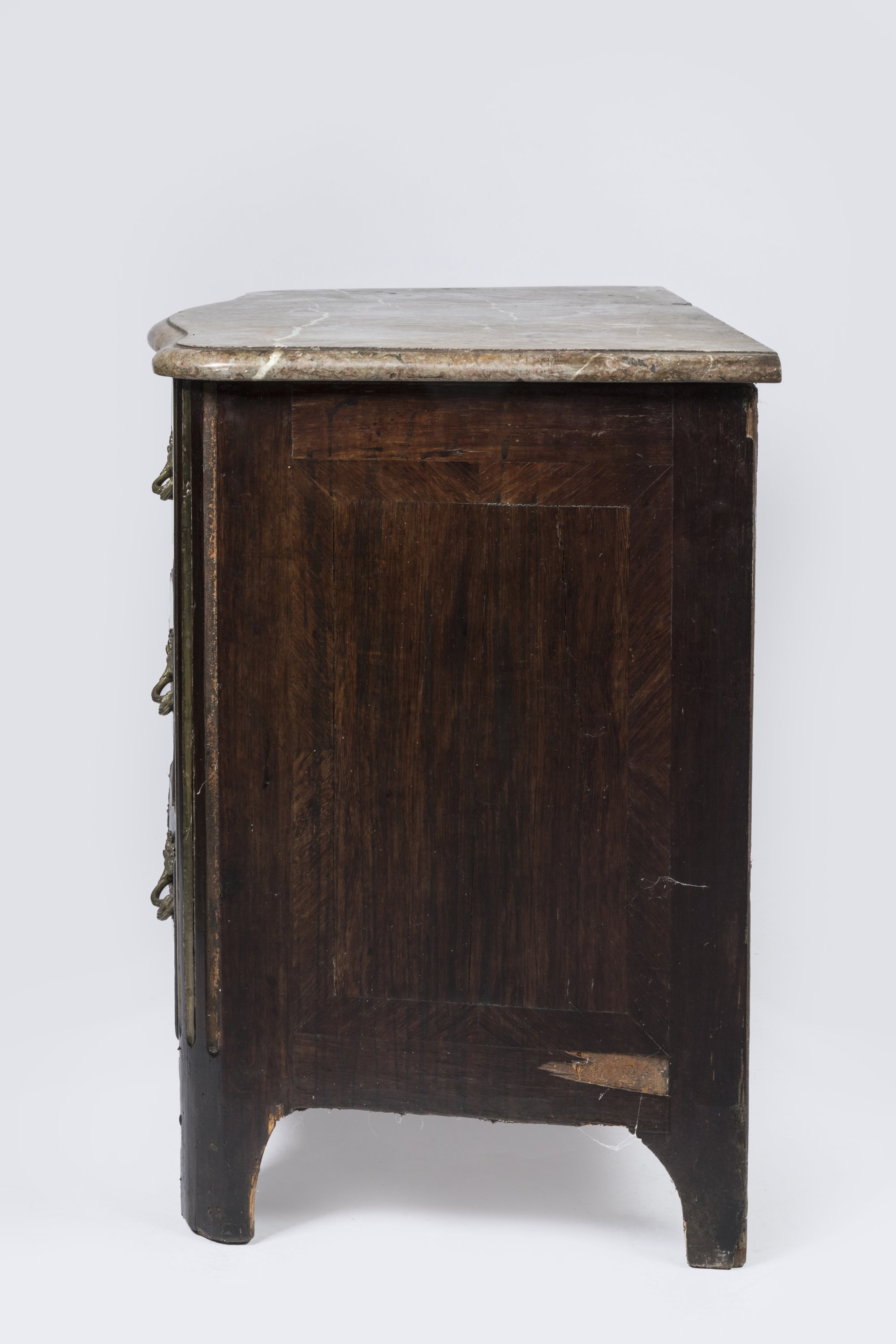 Elle ouvre par quatre tiroirs sur trois rangs séparés par des cannelures de laiton. Chacun est décoré de losanges et d'encadrements soulignés de filets en chevrons.