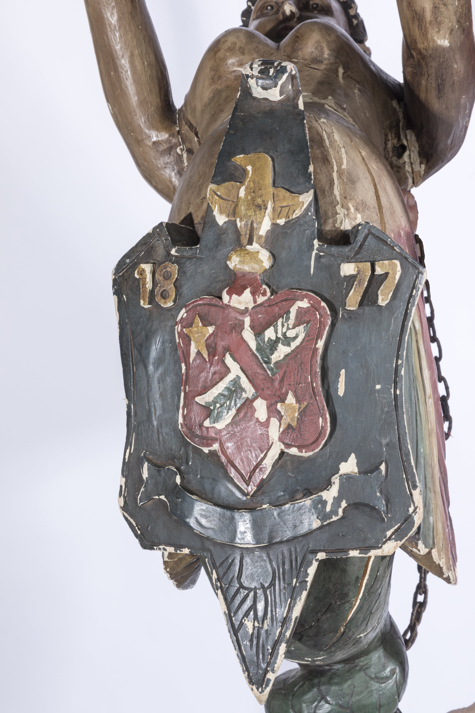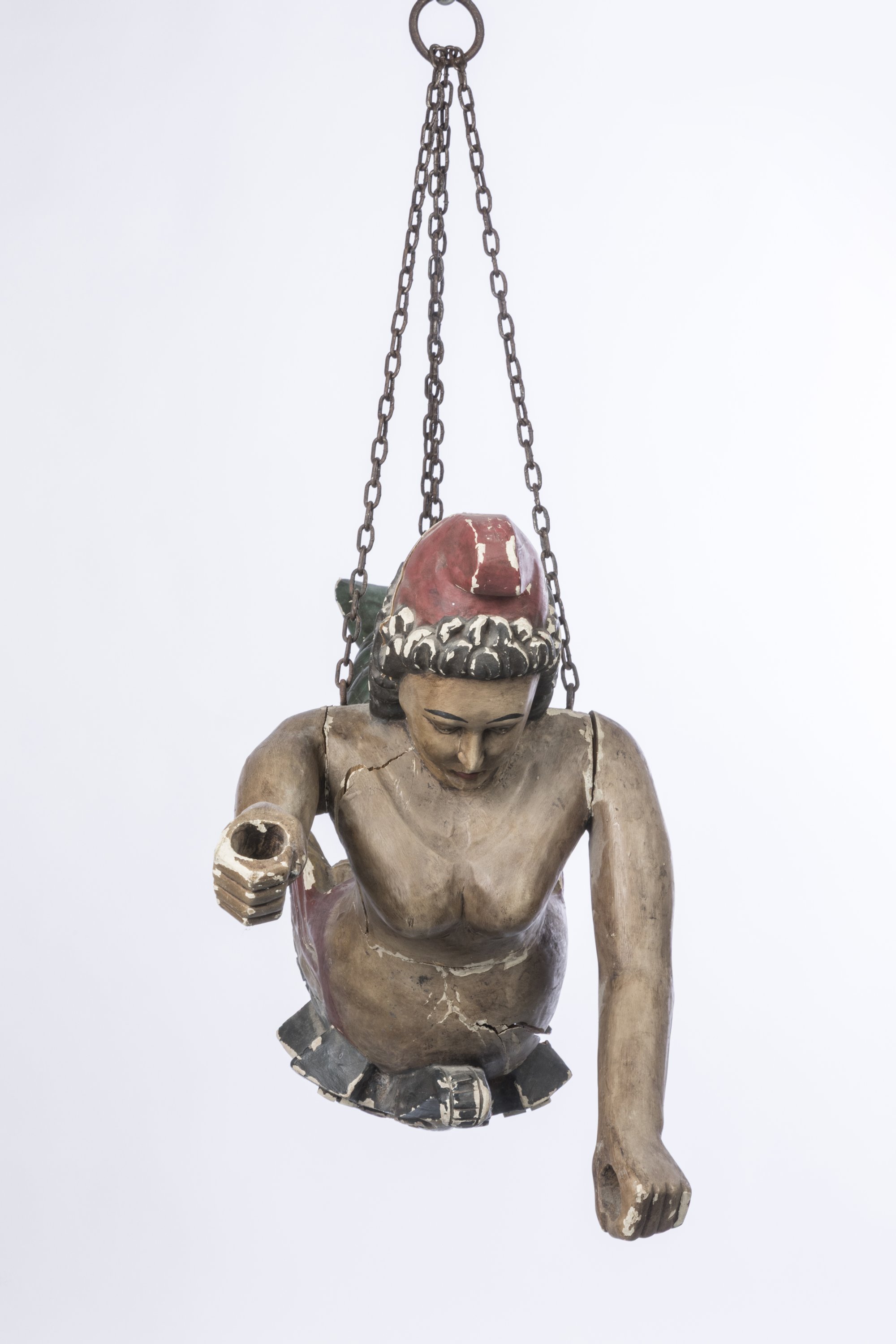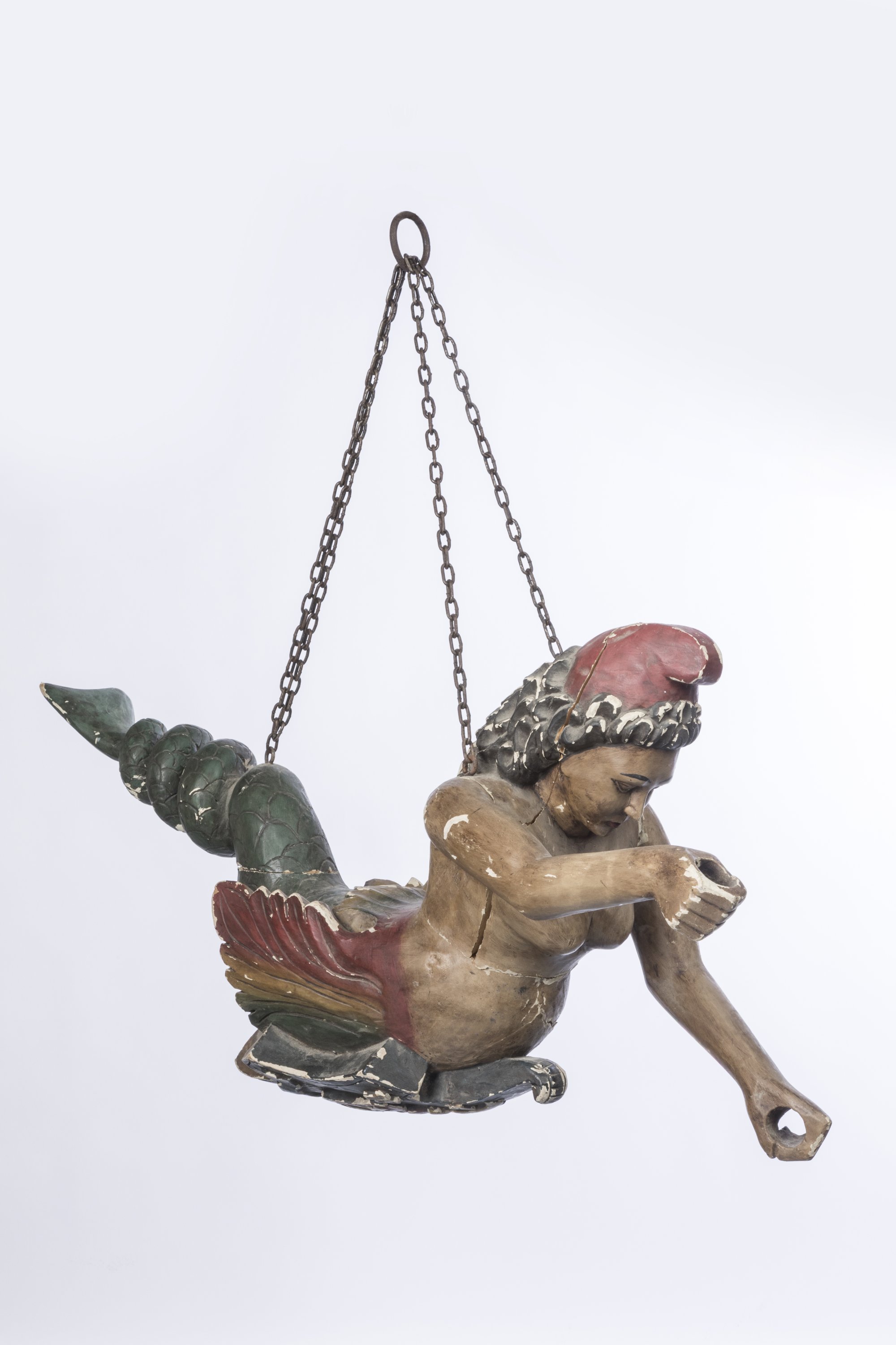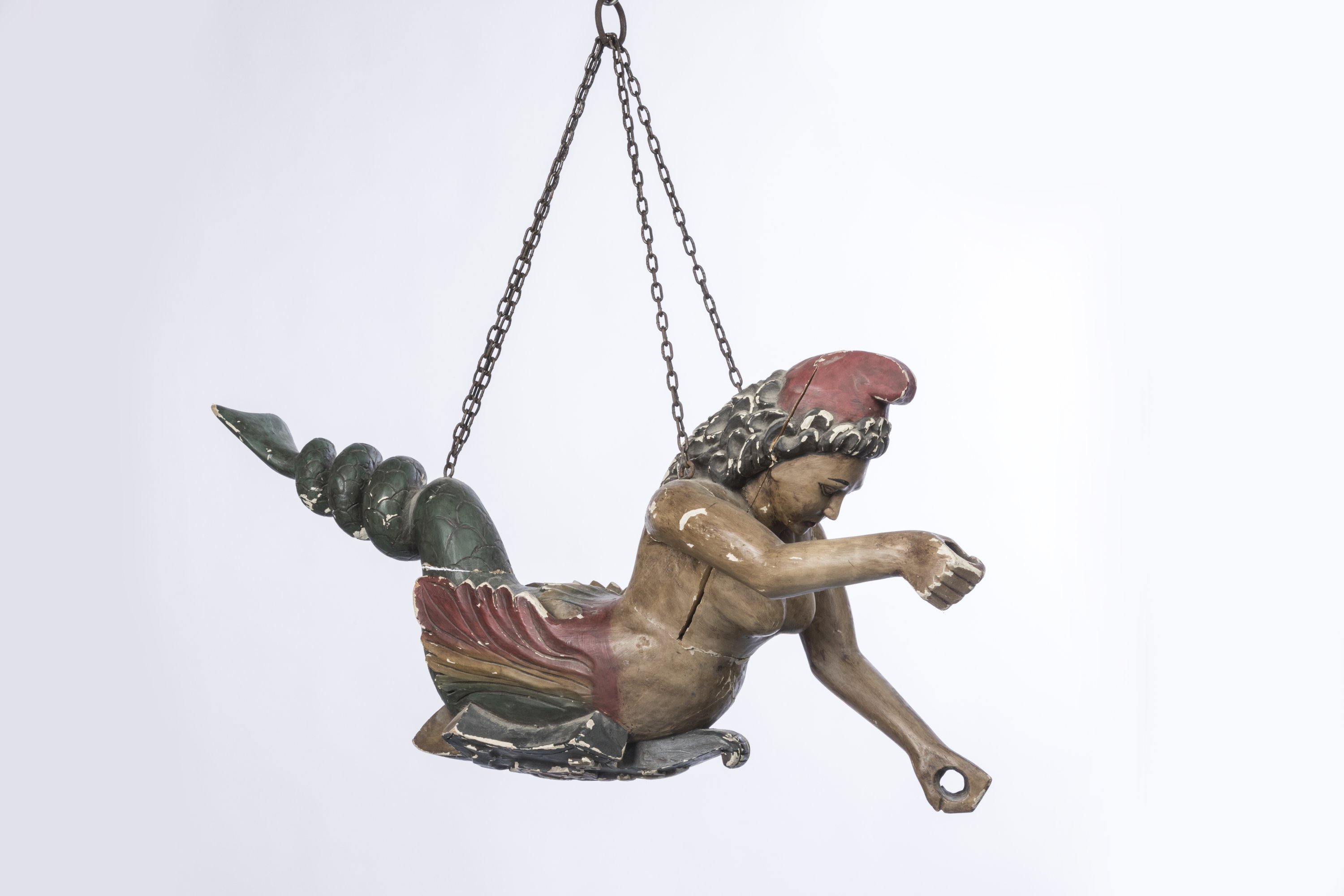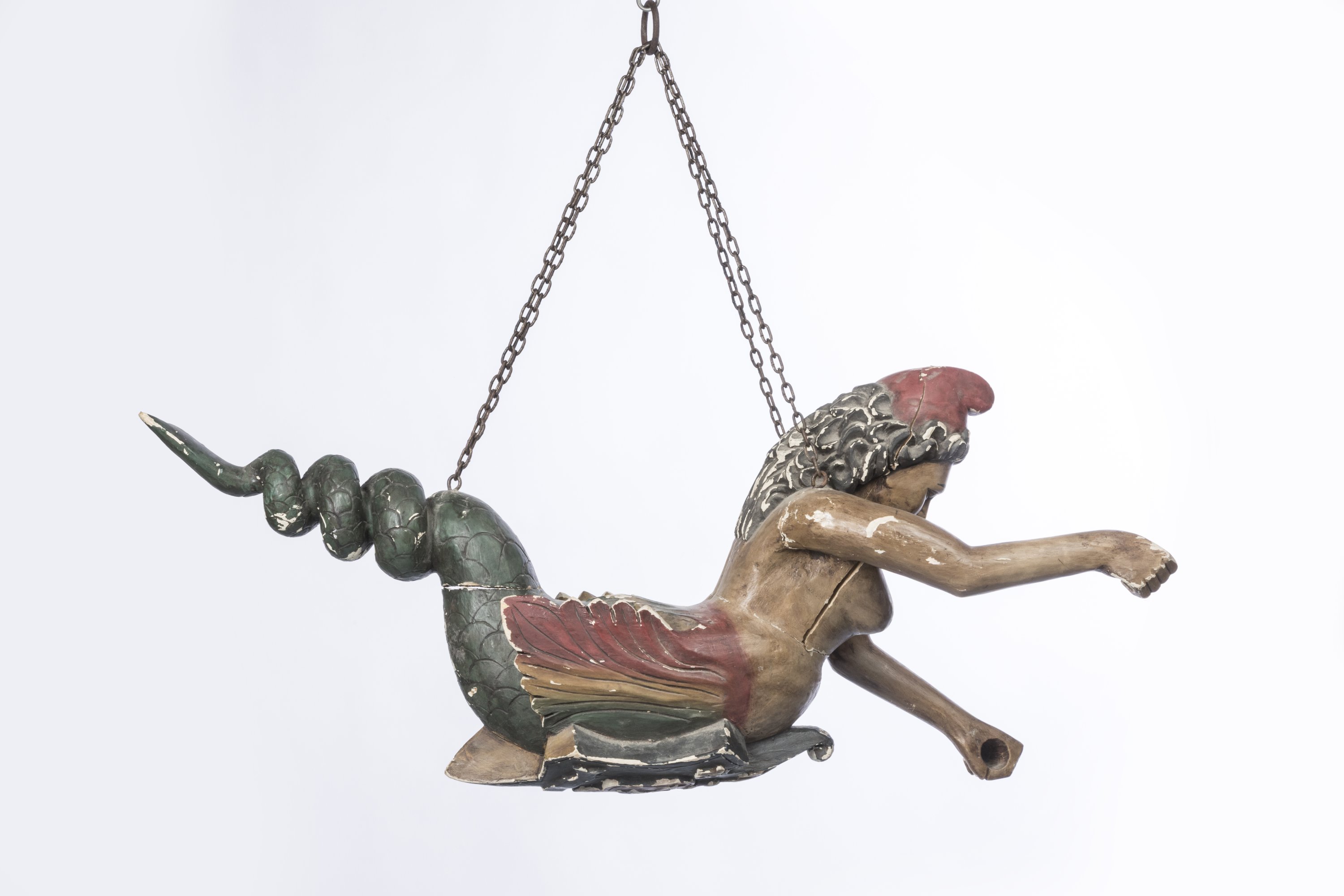 An 1877 polychrome carved wood and stucco shop sign featuring a mermaid.