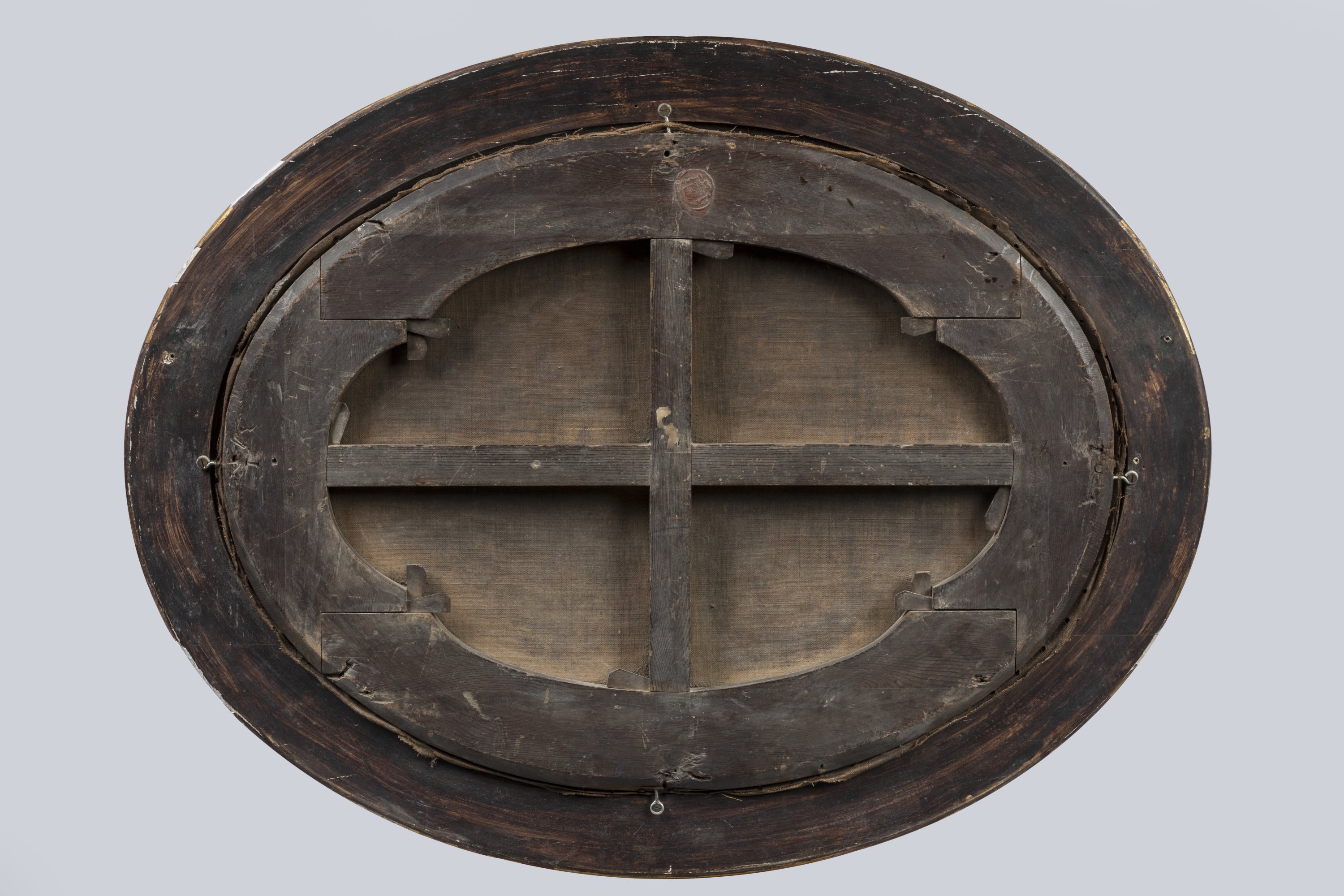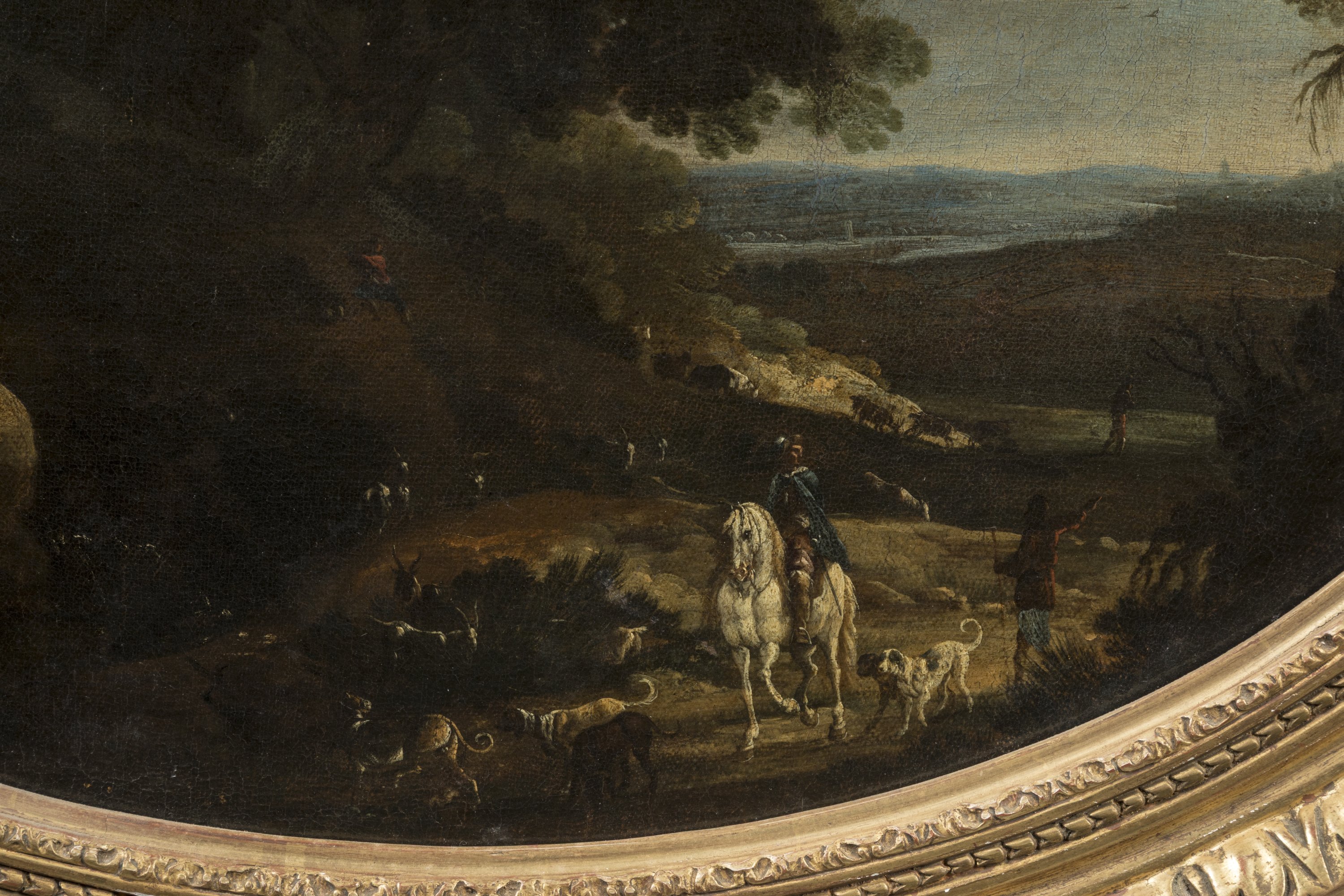 A painting of a landscape with a horserider by a follower of Filippo Napoletano. Oil on an oval canvas in a giltwood frame.