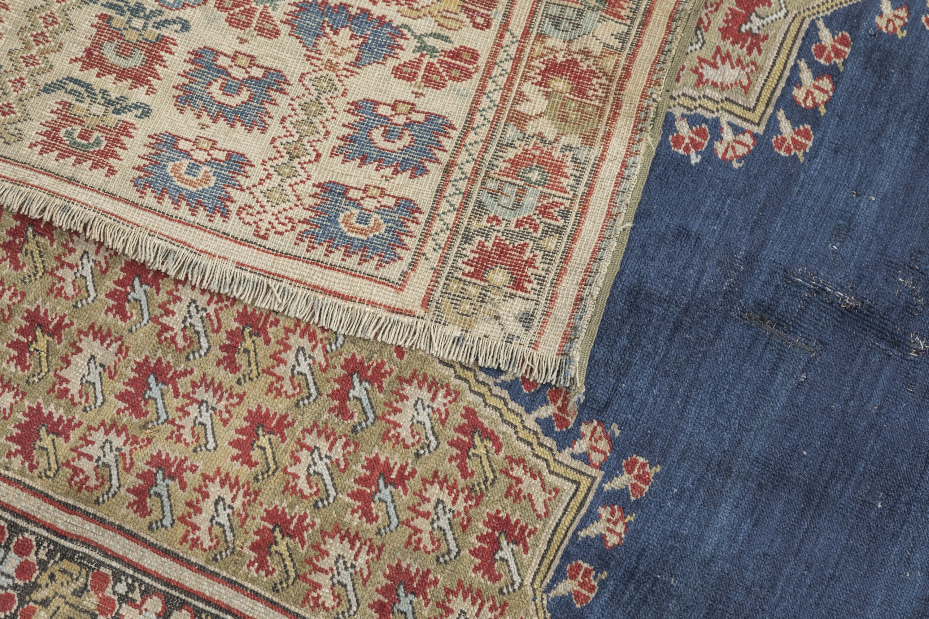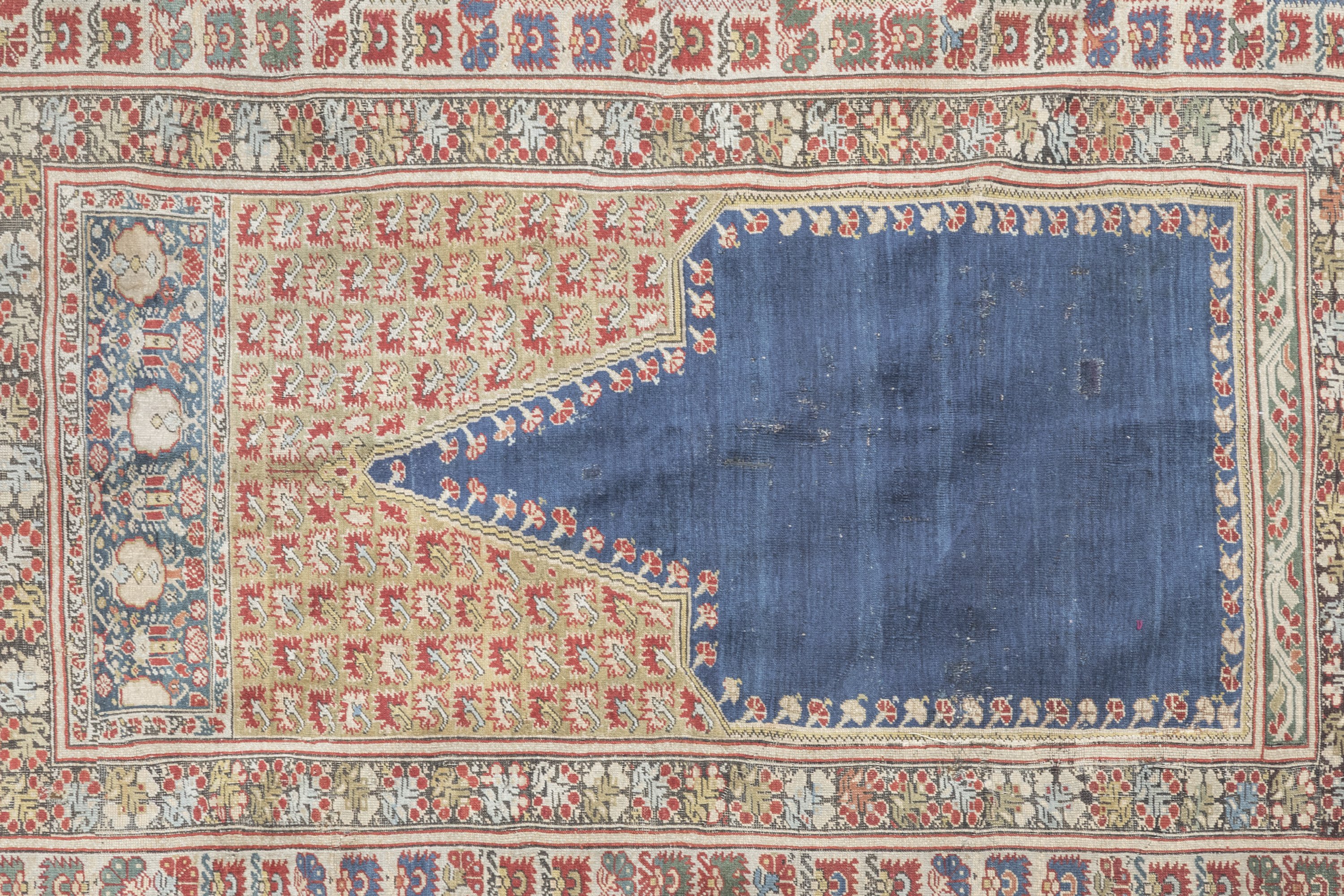 A Turkish Ghiordes prayer rug featuring a navy blue mihrab surrounded by an intricate border.