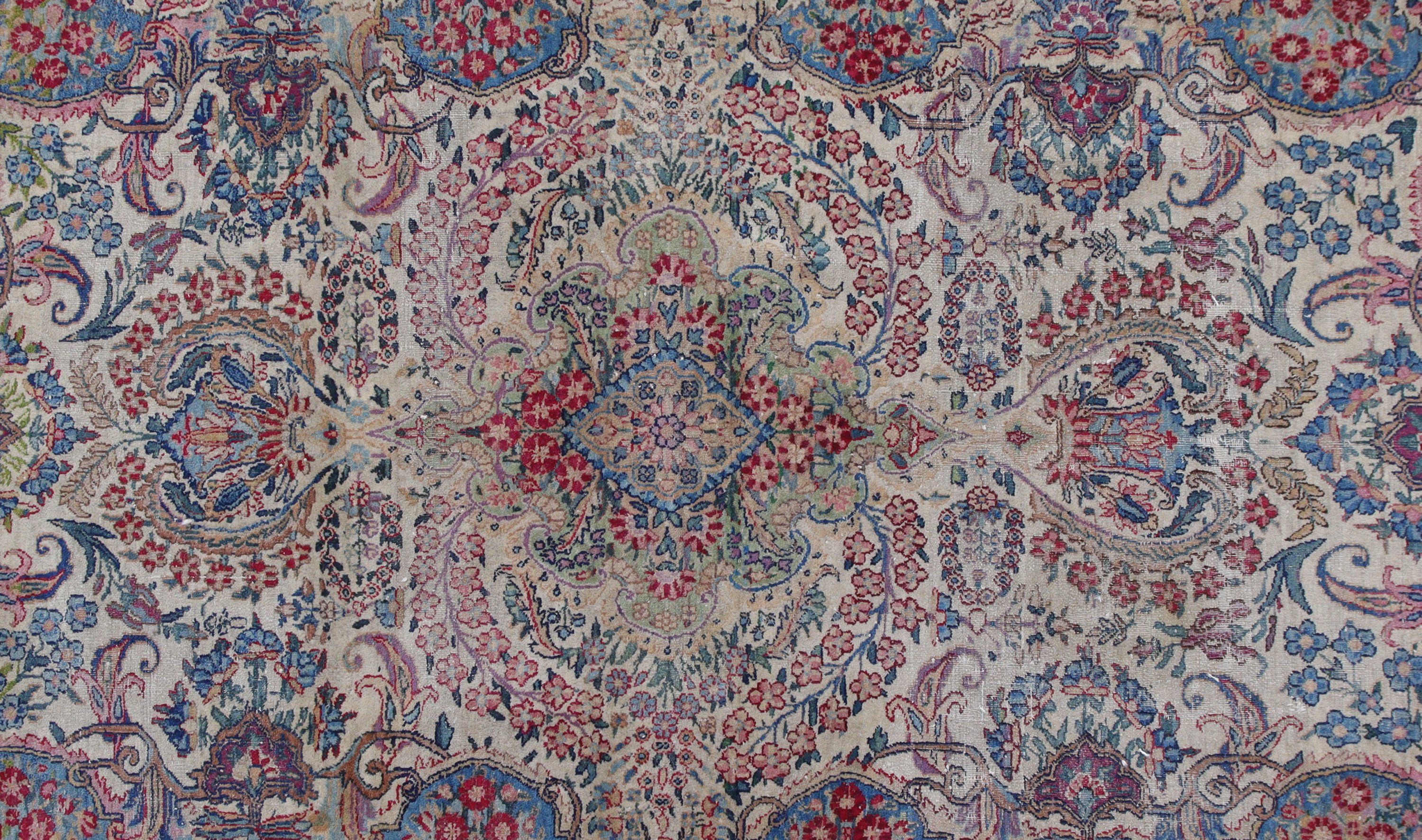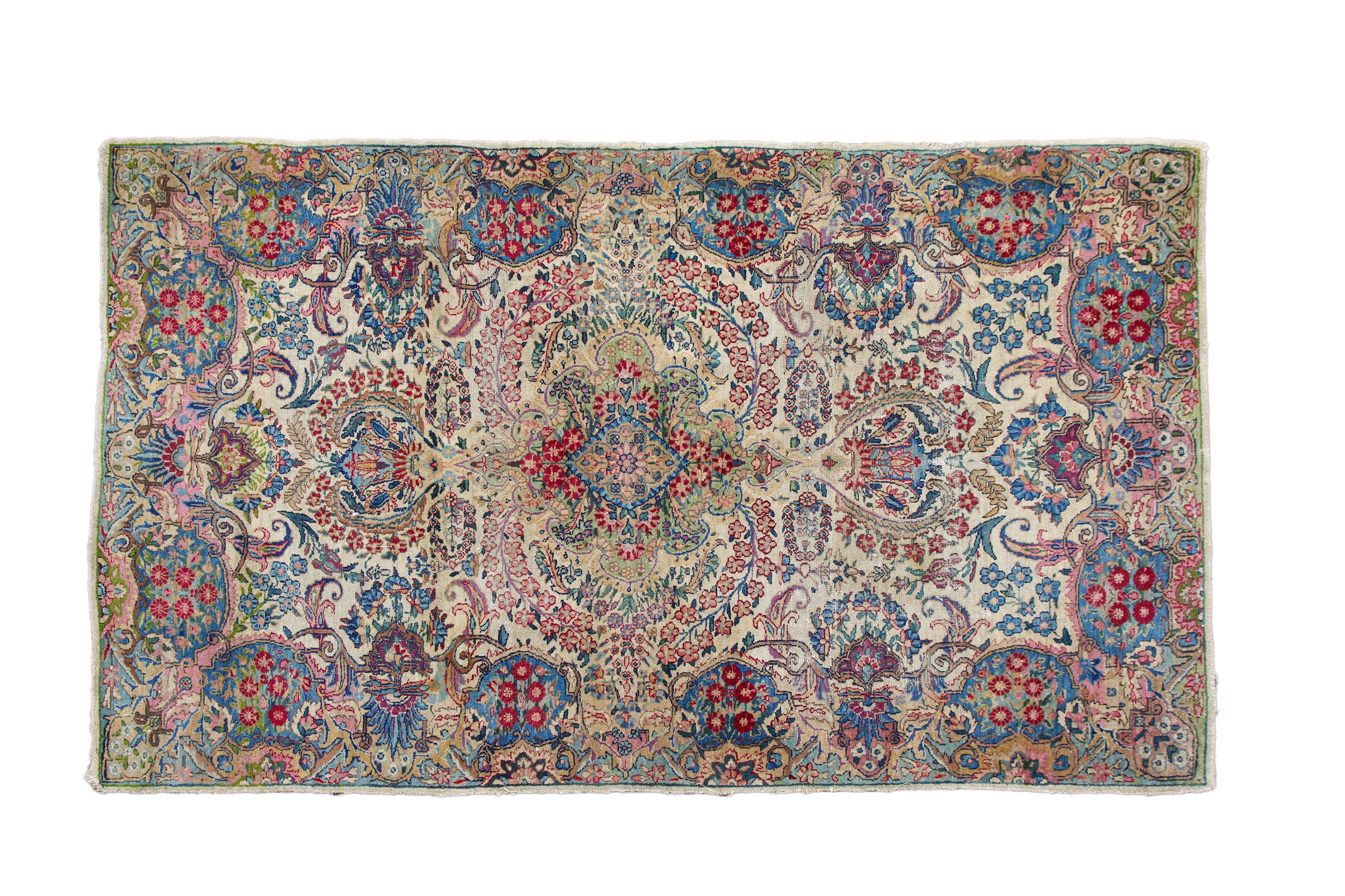 A Kerman rug featuring a floral medallion on an ivory background surrounded by flower garlands.