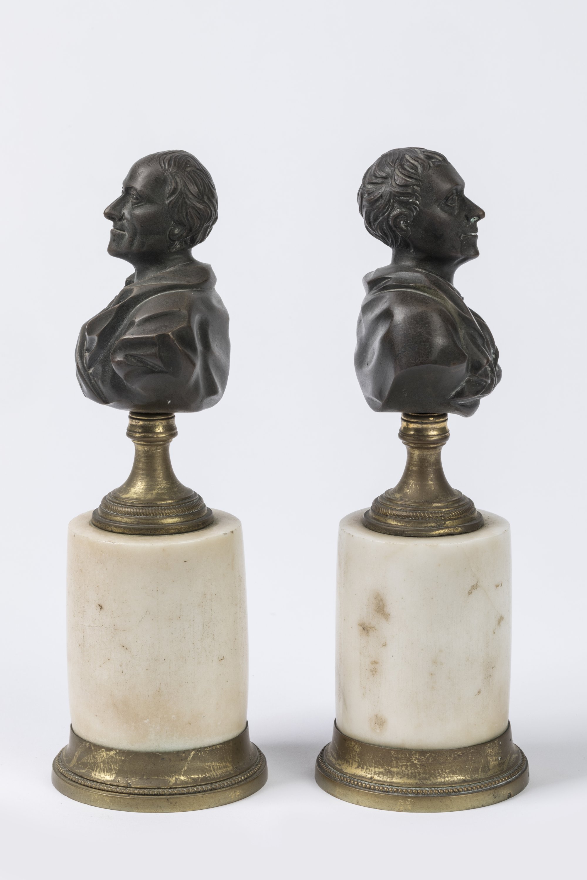 A pair of bronze busts of Voltaire and Montesquieu after François-Marie Rosset. Brass-mounted white marble bases.