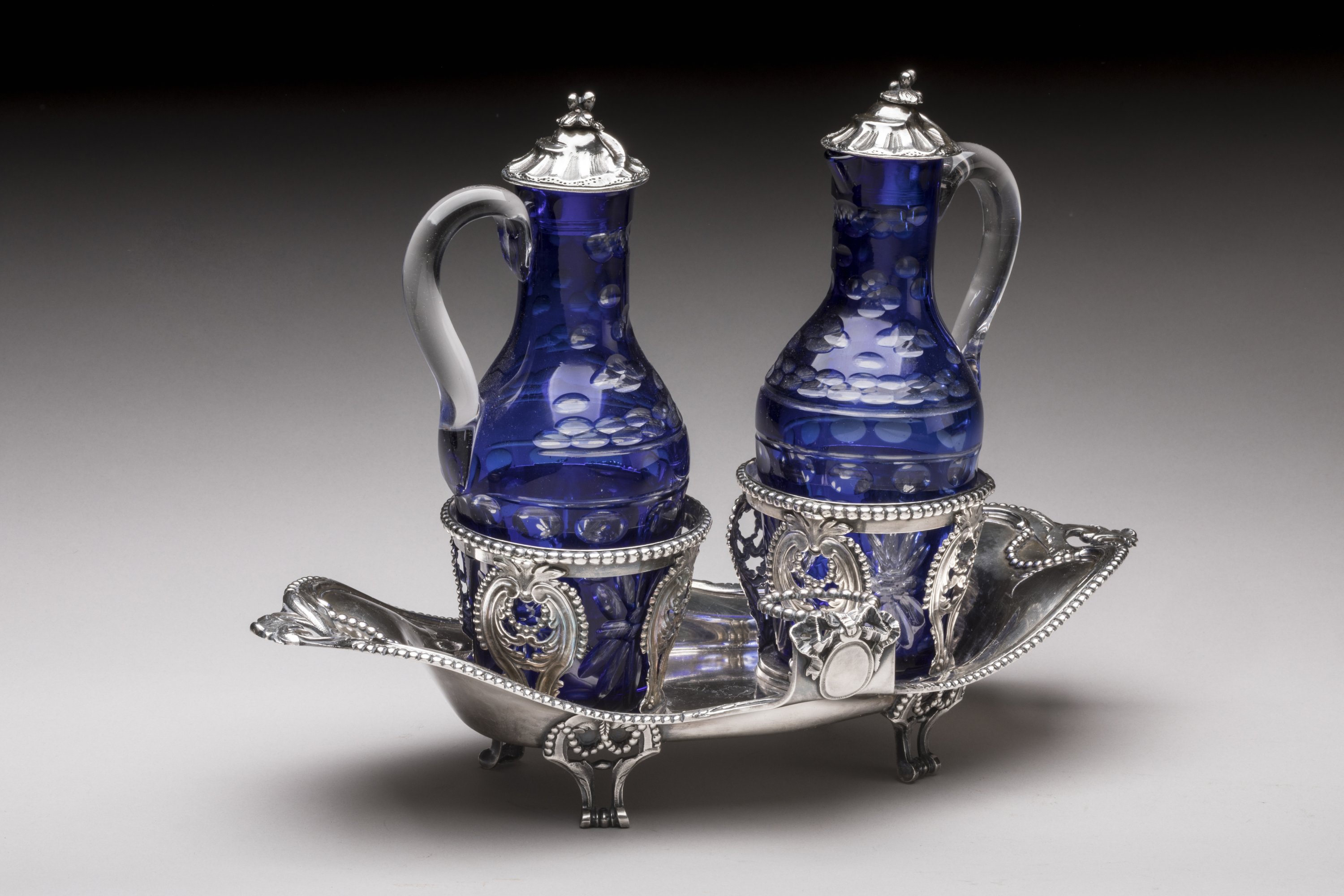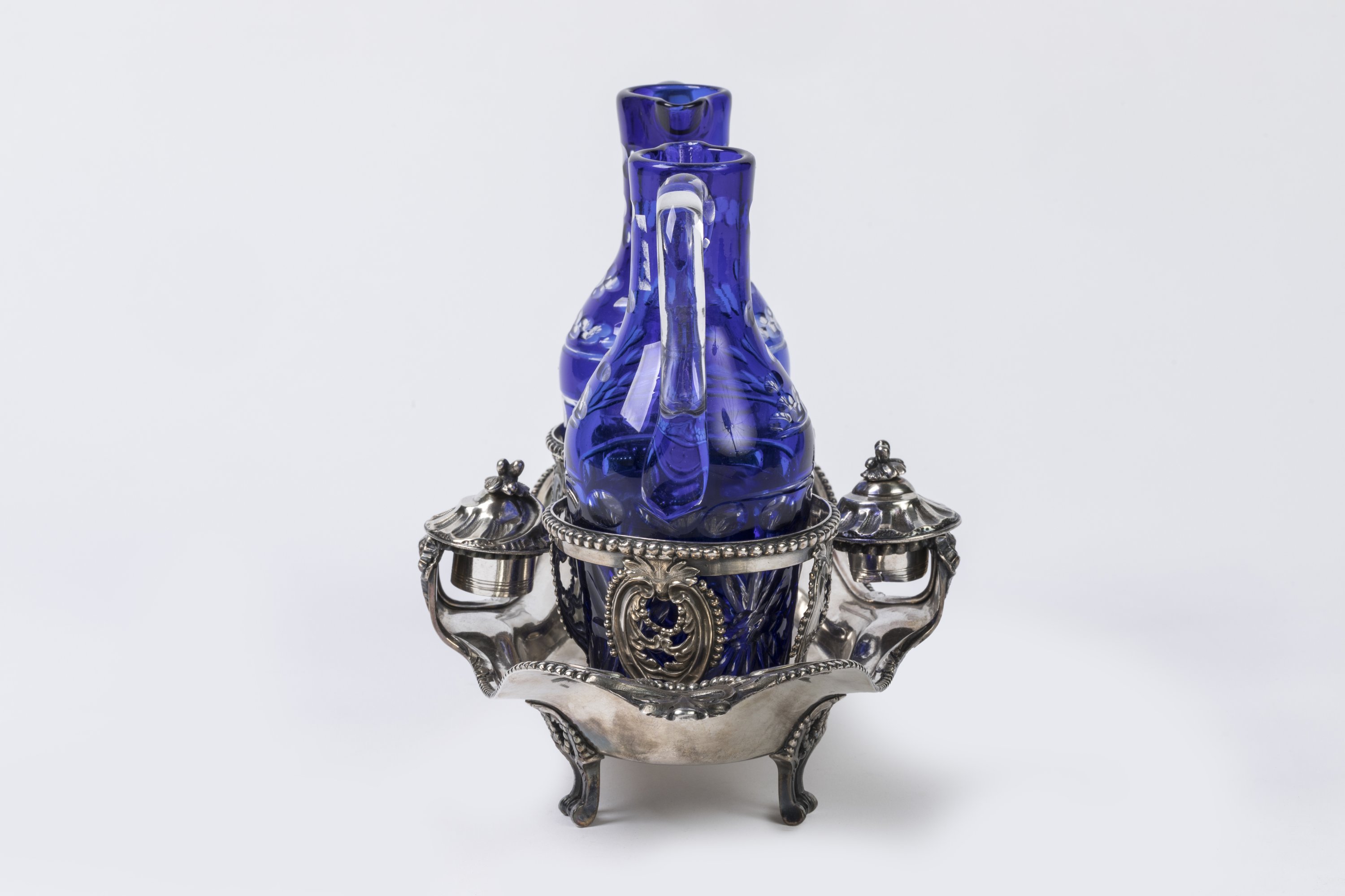 De forme mouvementée, la bordure est soulignée d'un rang de perles et se termine par deux anses à décor de feuilles d'acanthe. Les supports des bouchons sont surmontés de noeuds et médaillons. Il repose sur quatre pieds en enroulements.