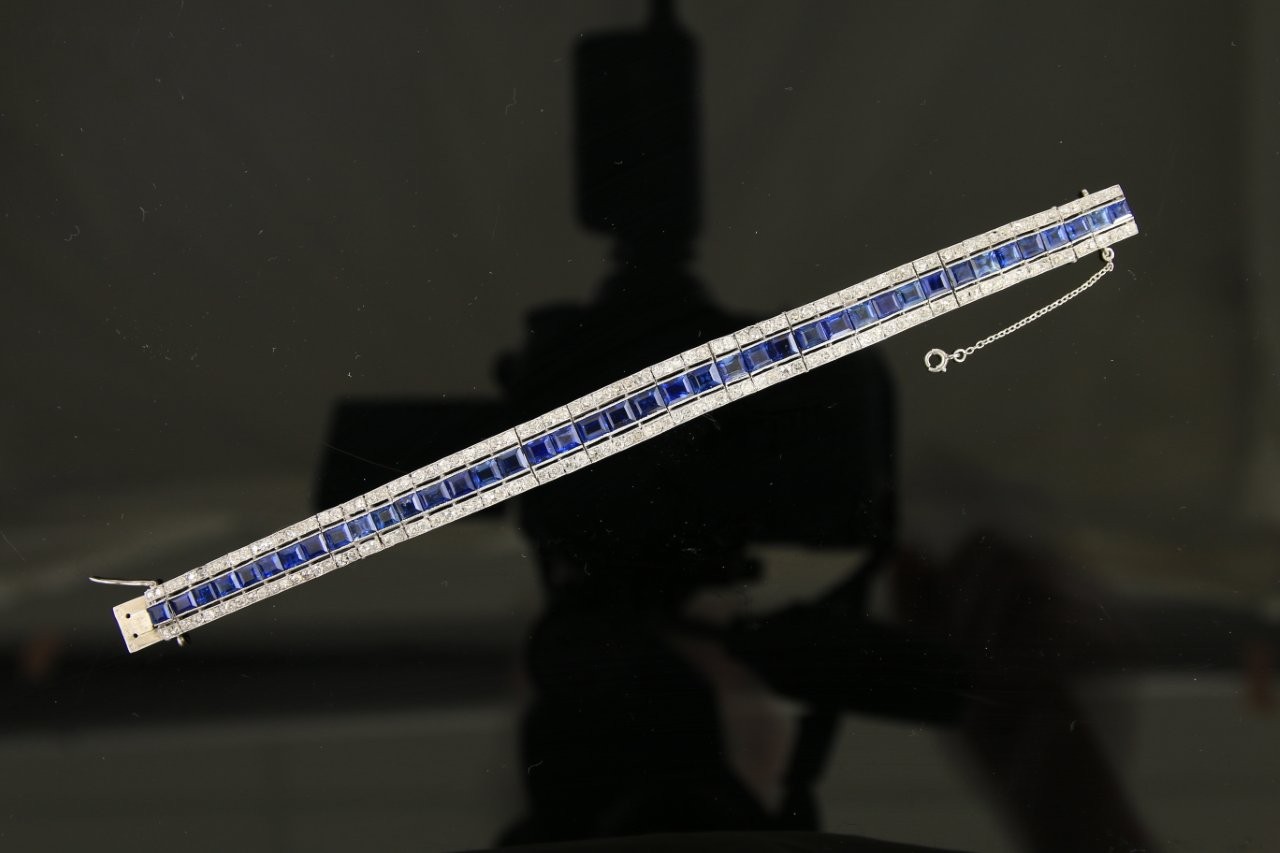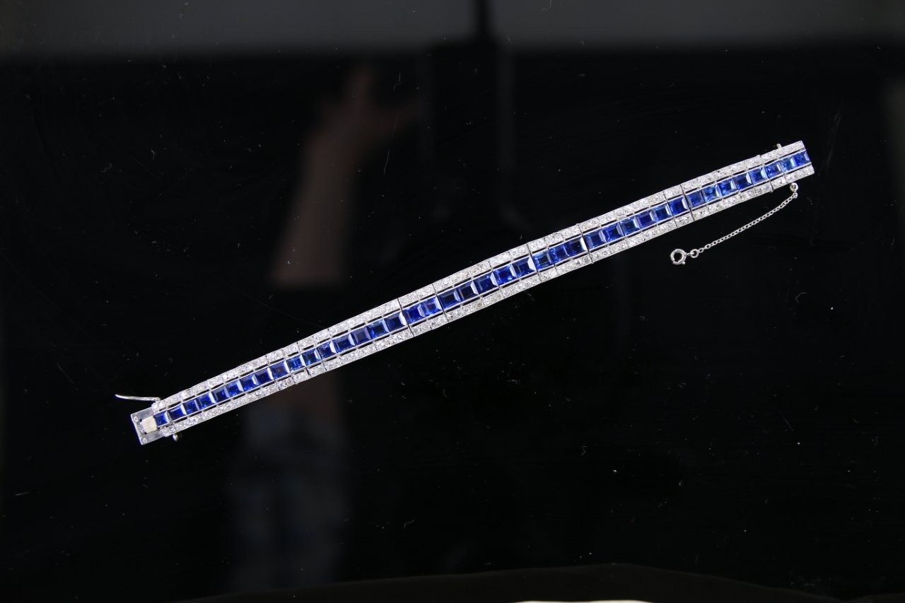 Or gris 750 millièmes entièrement serti d'une ligne de saphirs rectangulaires légèrement en chute entre deux lignes de diamants ronds de taille ancienne.