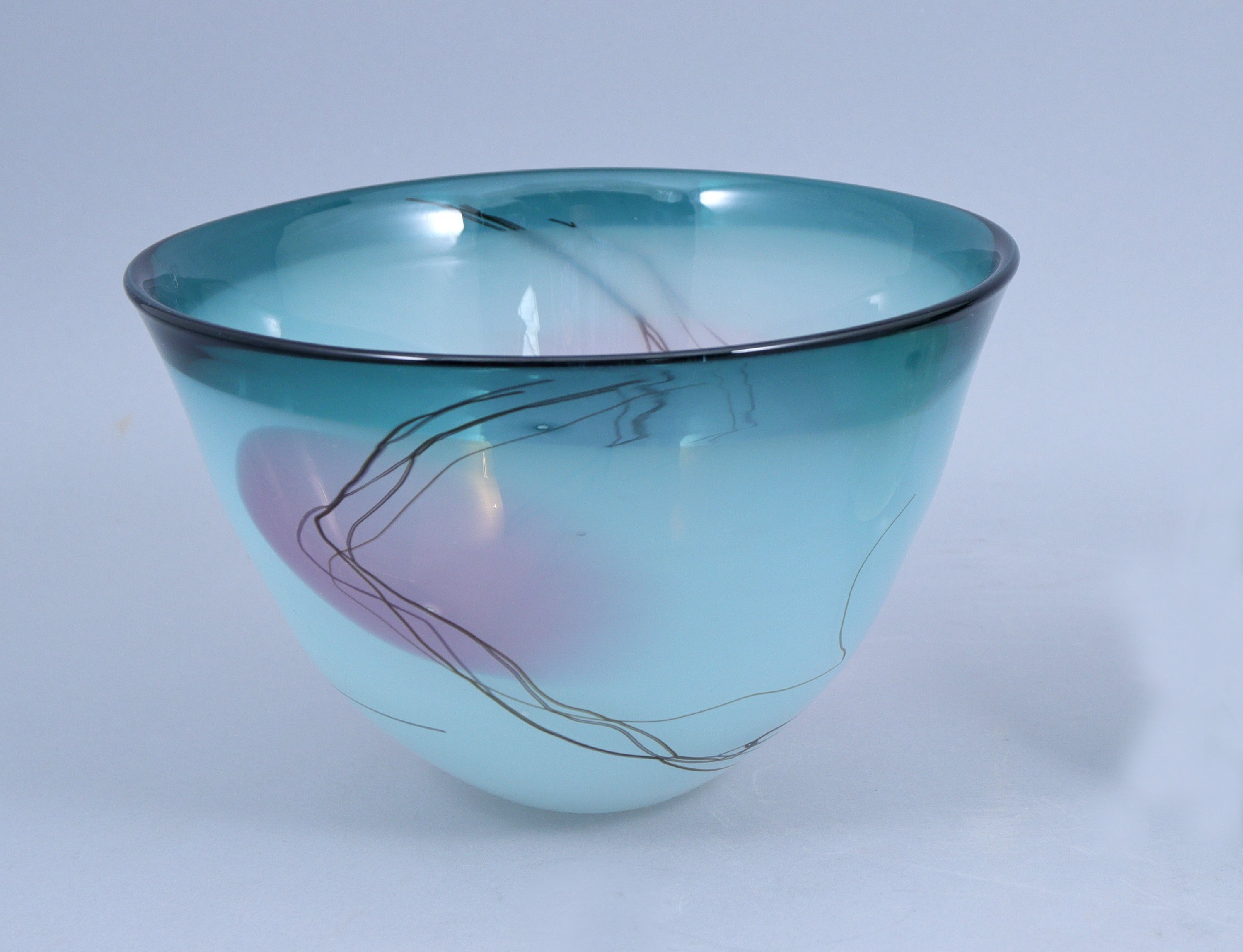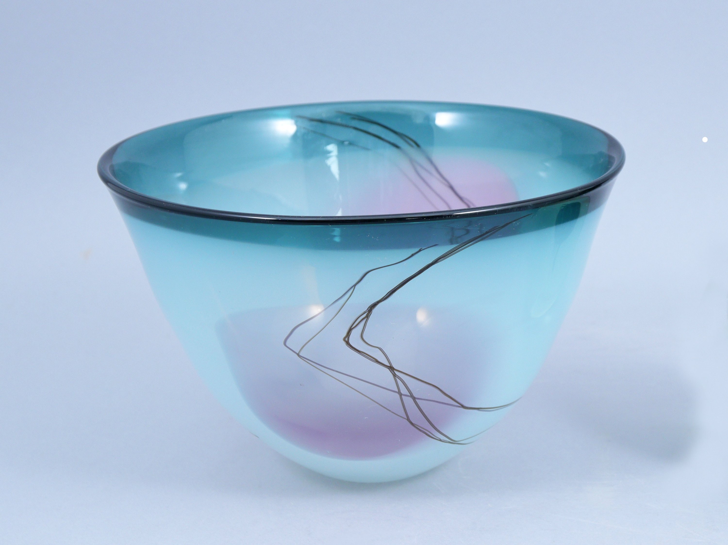 Verre teinté céladon et rose et décor de lignes libres en émail peint.