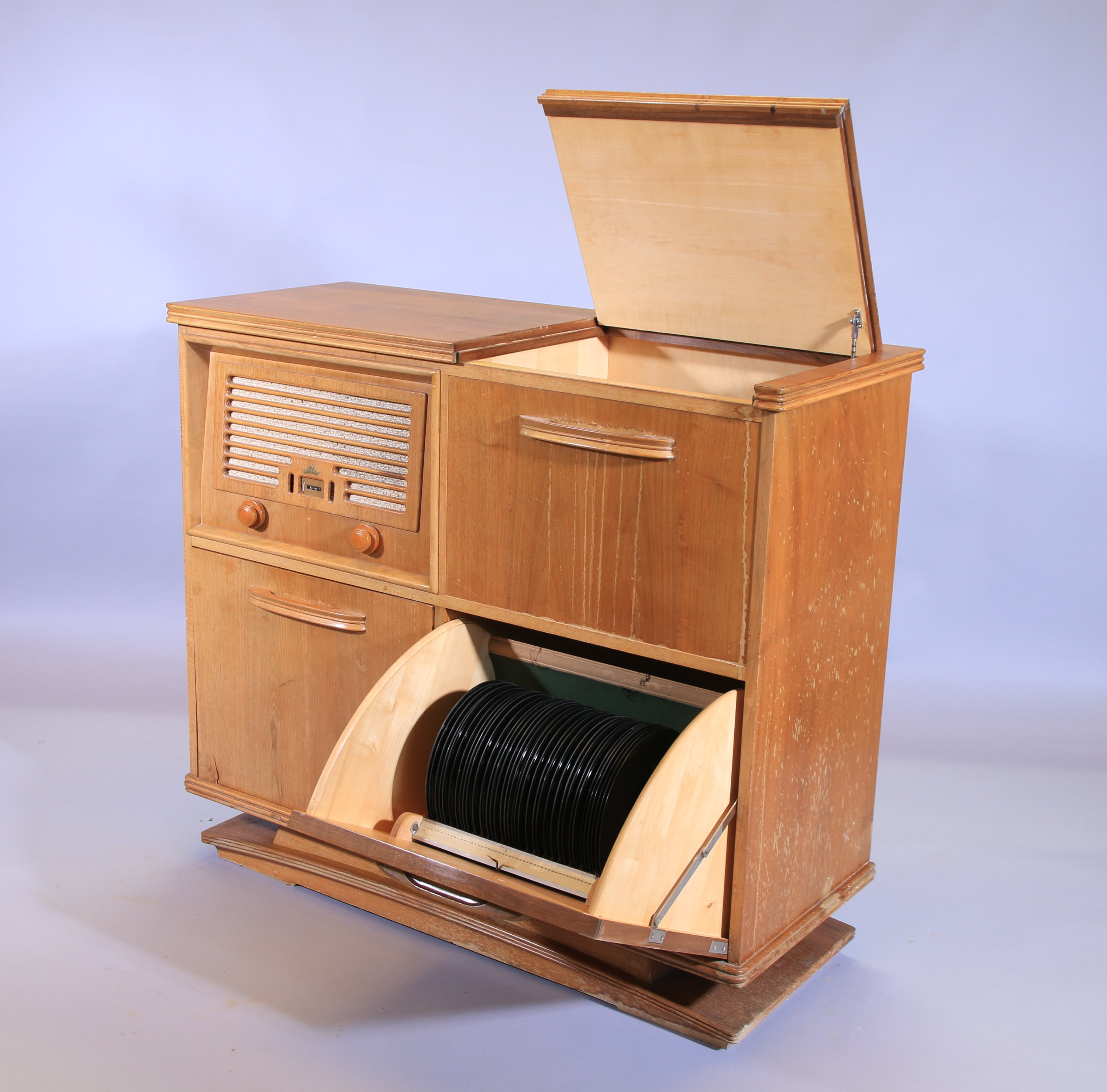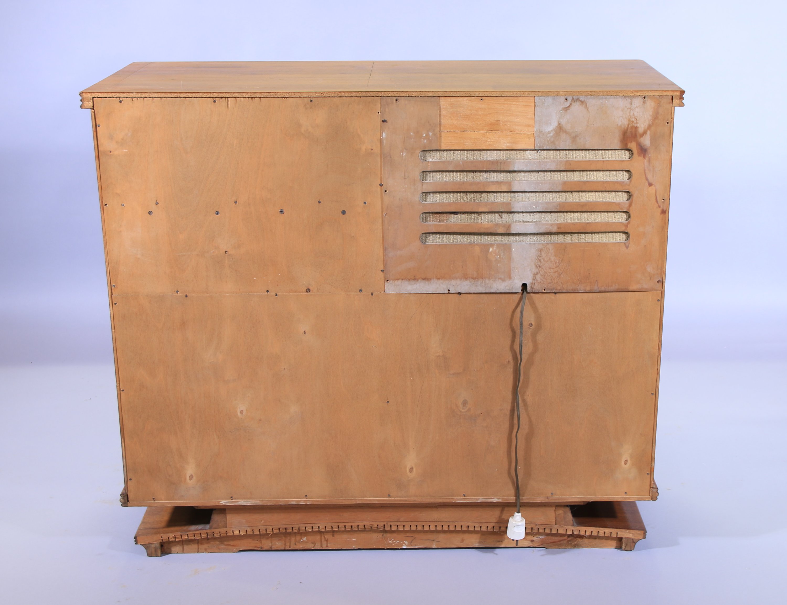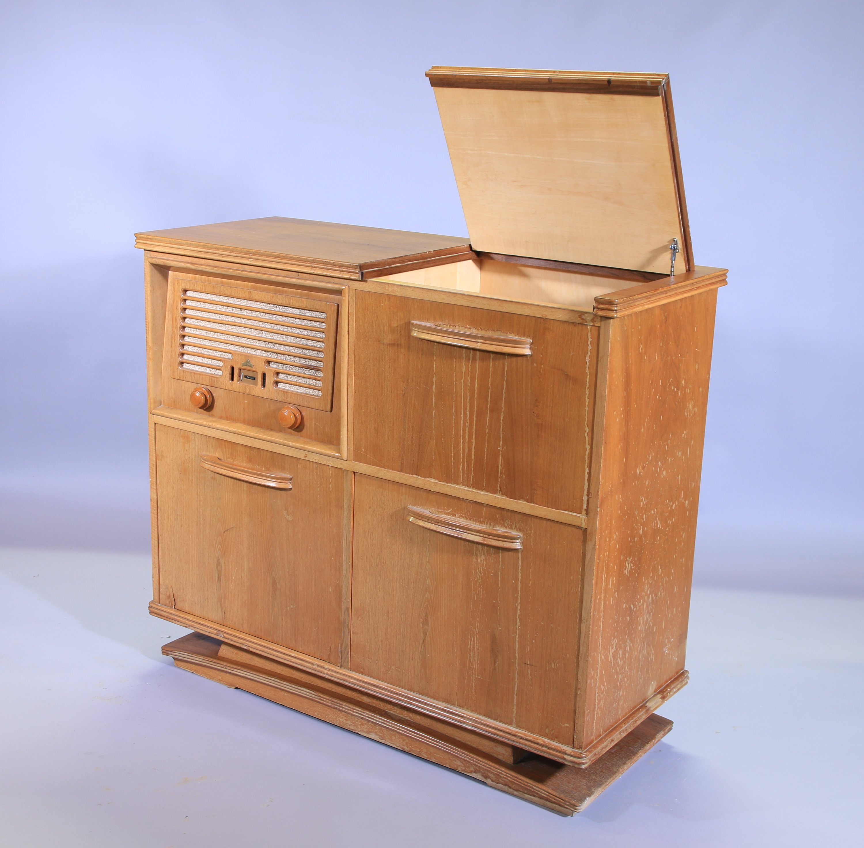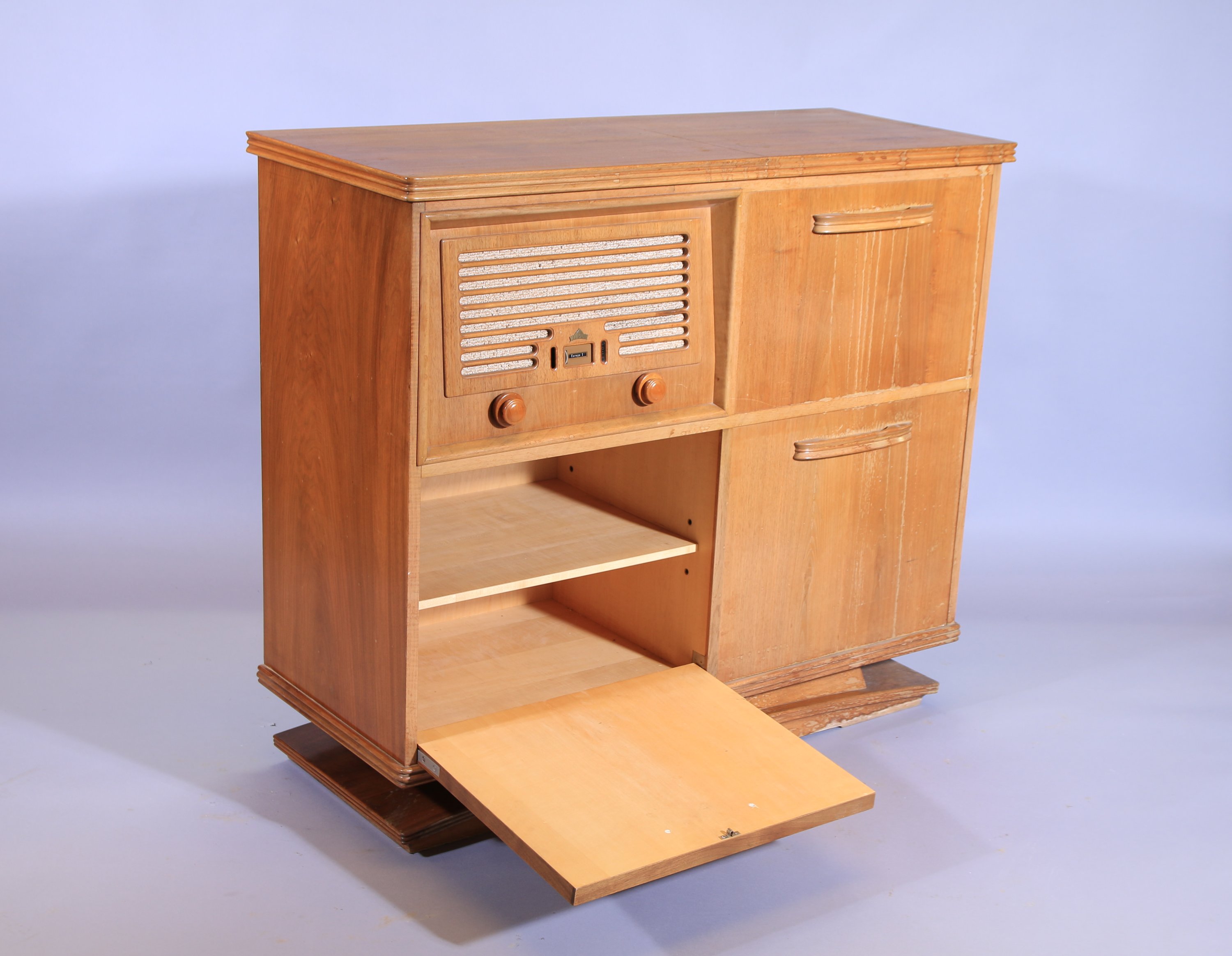 en placage de chêne. La partie supérieure s'ouvrant par un abbatant dévoilant un tourne disque pour vinyls en 33, 45 et 78 tours. La radio intégrée dans le corps du meuble. Partie inférieure à deux abattants dévoilants deux niveaux à quatres étagères. Elle repose sur une plinthe.