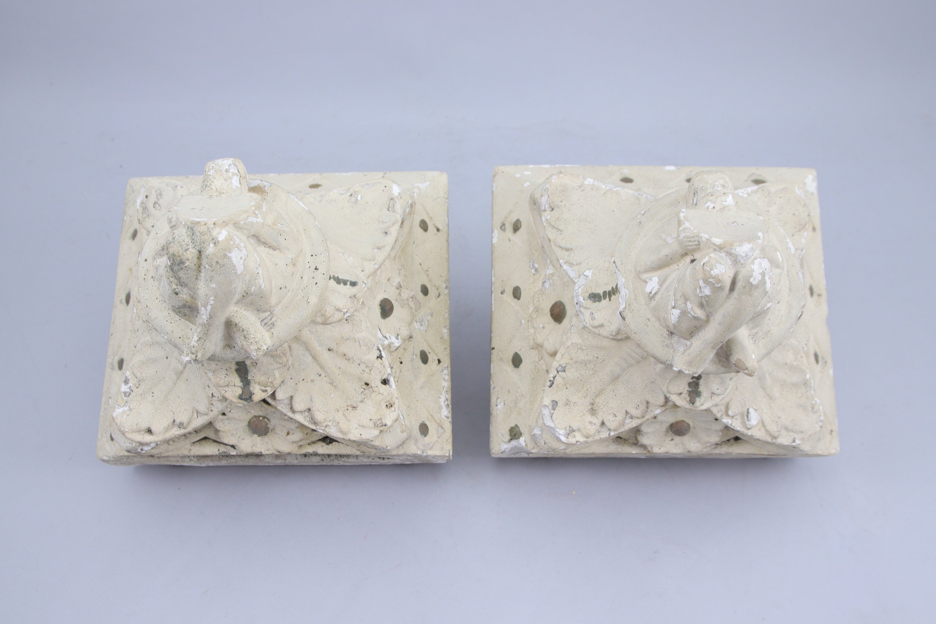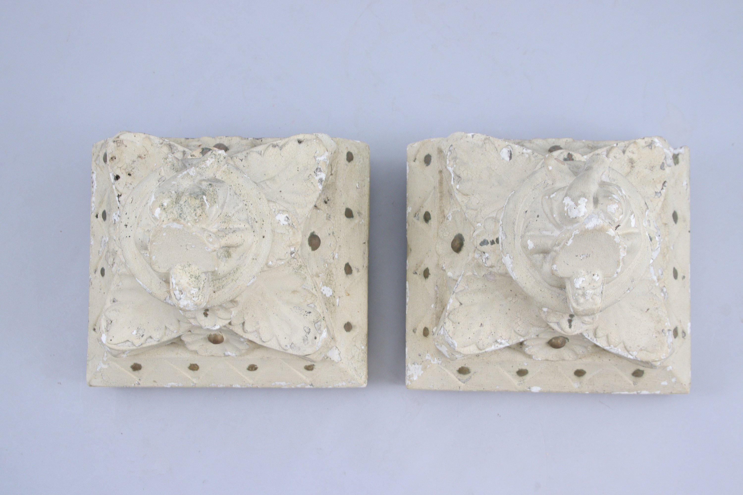Plâtre clouté, à décor de frises, de feuilles d'acanthe, de fleur et d'un personnage porteur d'écusson.