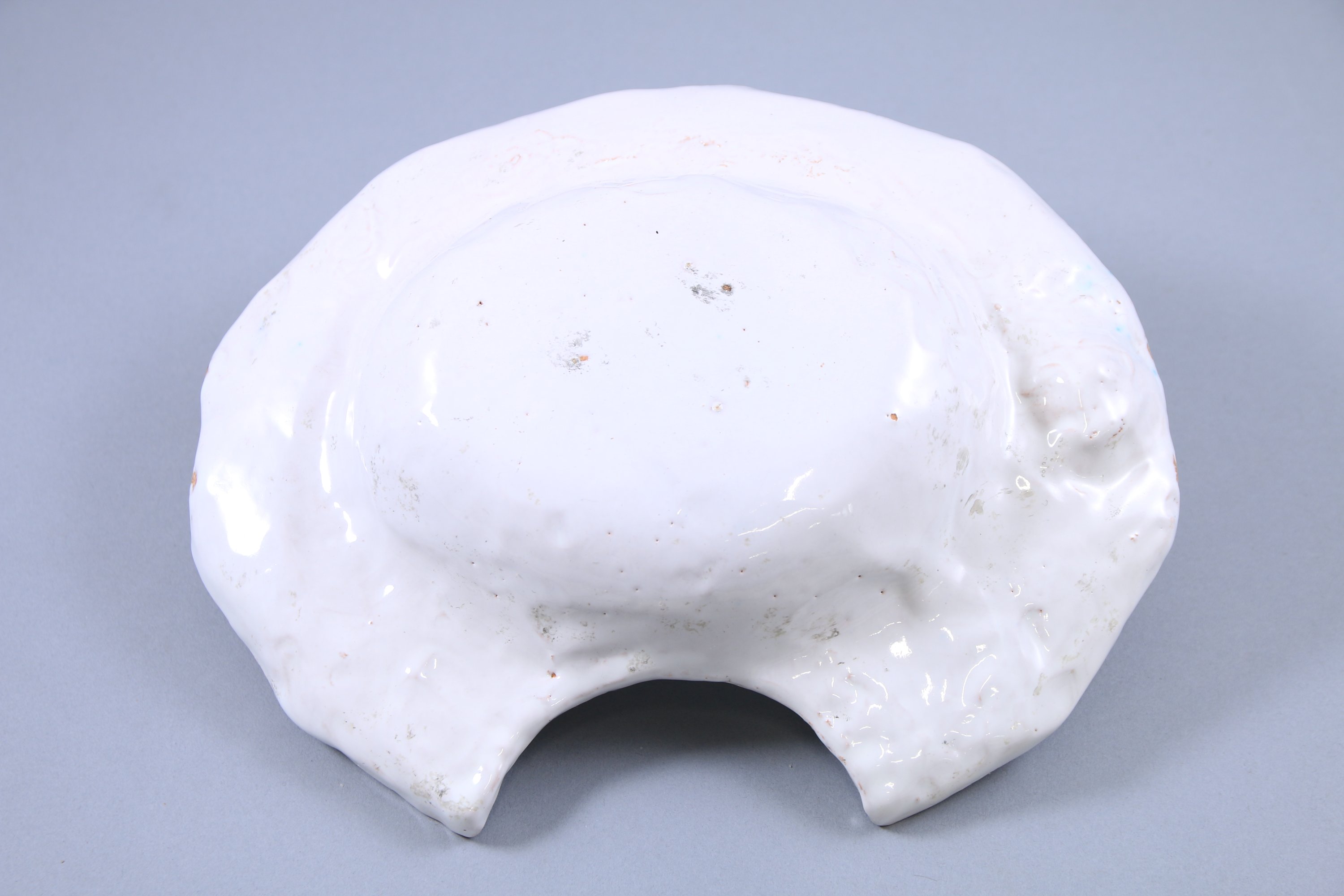 Faïence, décor central d'une couronne aux épée croisées dans un entourage enrubanné. Dans le creux la mention "Vis unita Fortior".