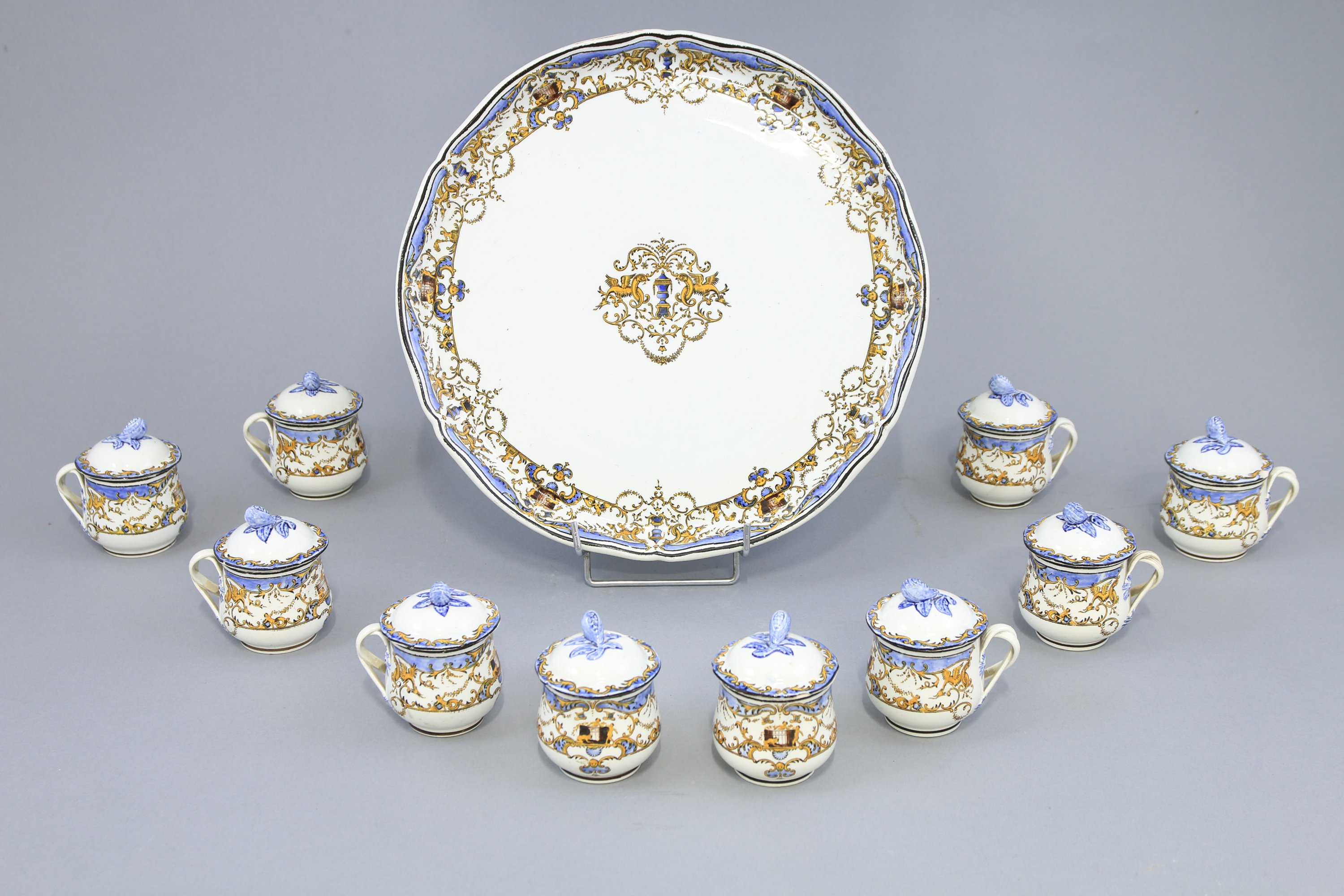 en faïence à décor polychrome comprenant un plateau et dix pots avec leurs couvercles.