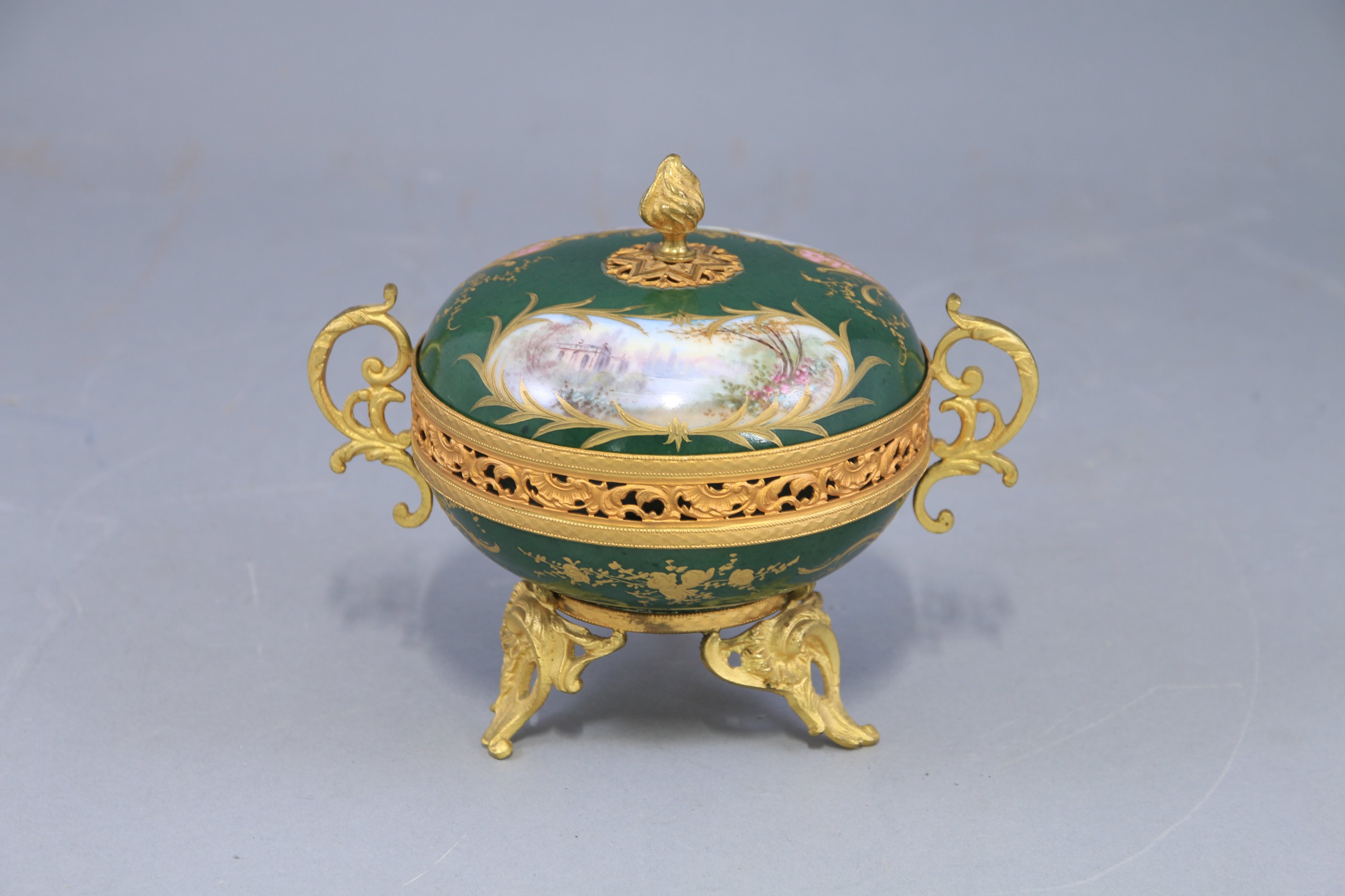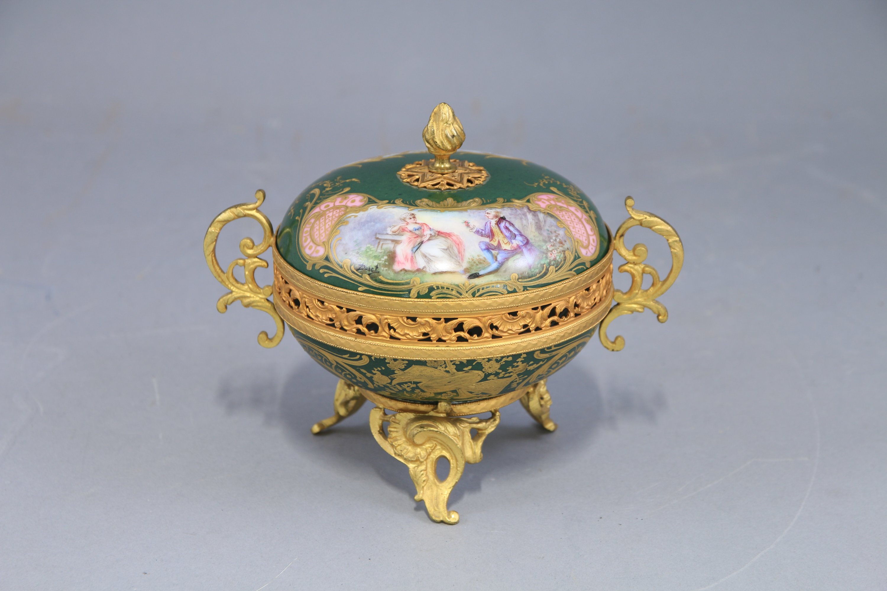 Porcelaine et bronze doré. Porcelaine montée à décor d'une scène galante et d'un bâtiment en bord de rivière en réserve sur fond vert. Fretel en forme de flamme, anses et pieds en enroulements feuillagés.