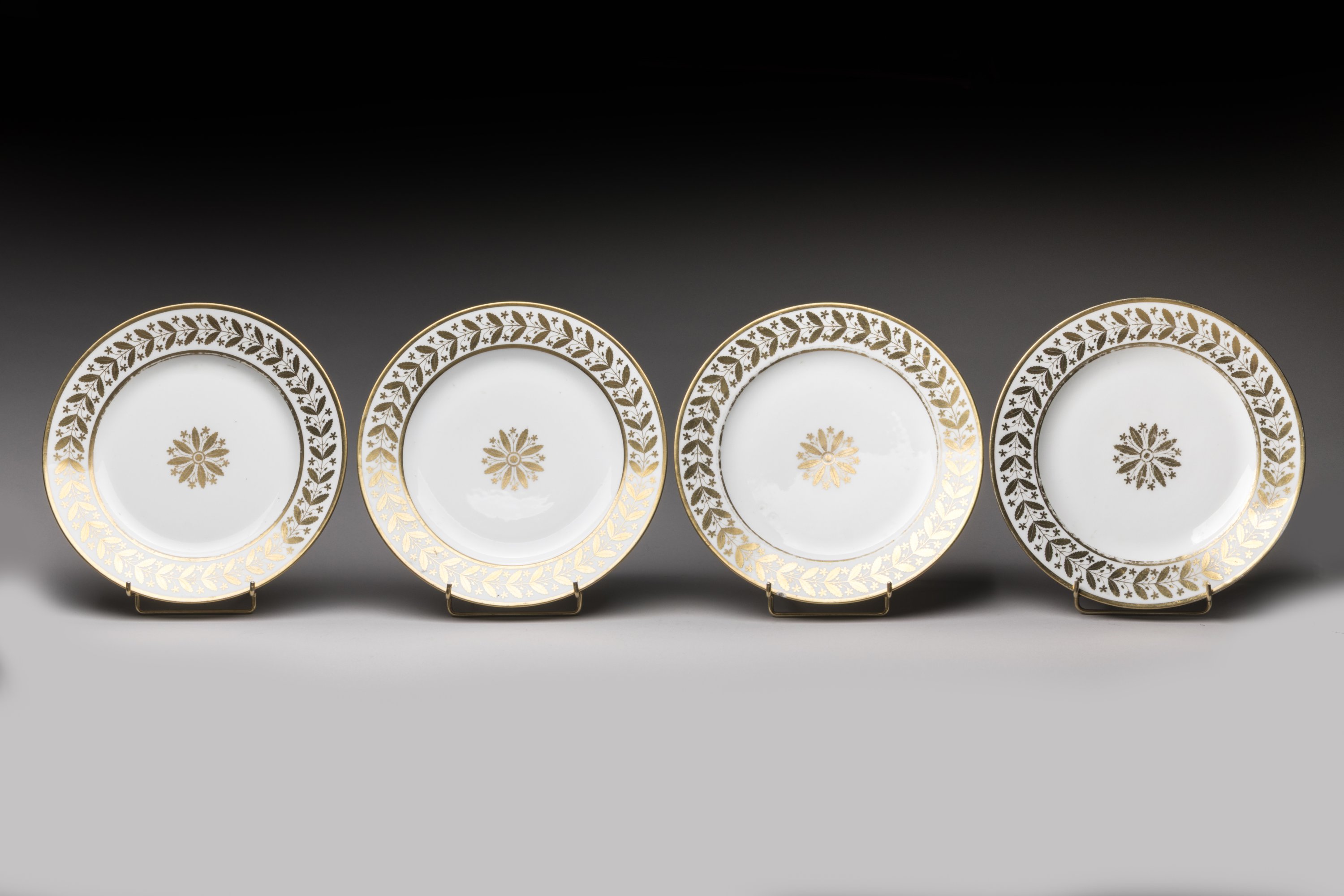 The Imperial Manufacture in Sèvres. An 1808 set of four plates for Emperor Napoleon I's personal service in Rambouillet. Empire Period.