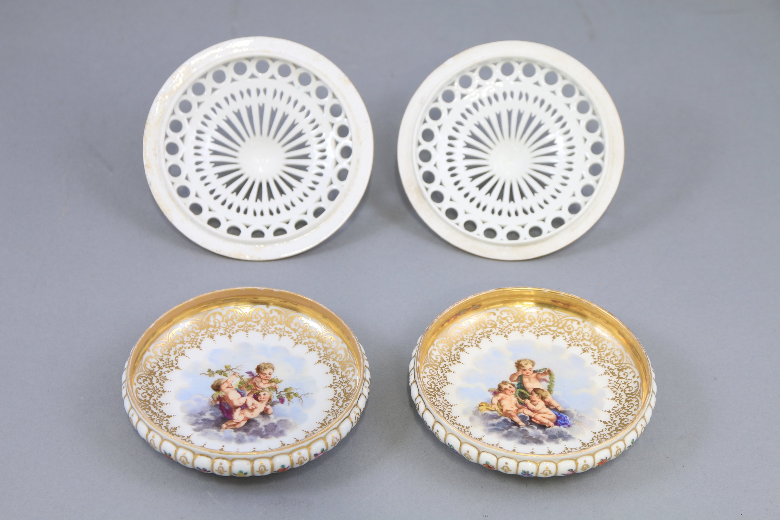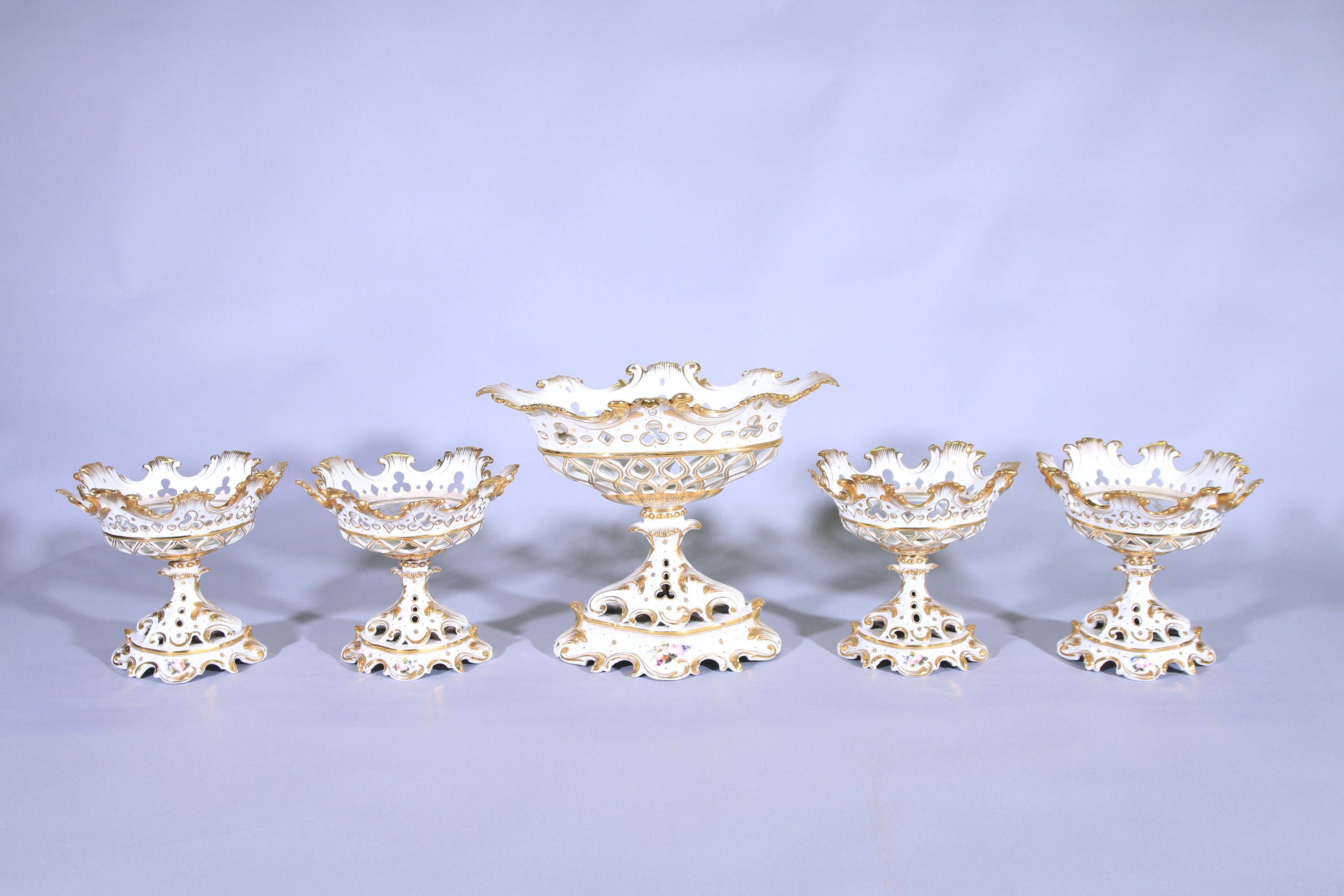 A décor ajouré blanc et rechampi doré, décor de bouquets de fleurs polychrome sur le pied. Une de forme navette, les autres circulaires.