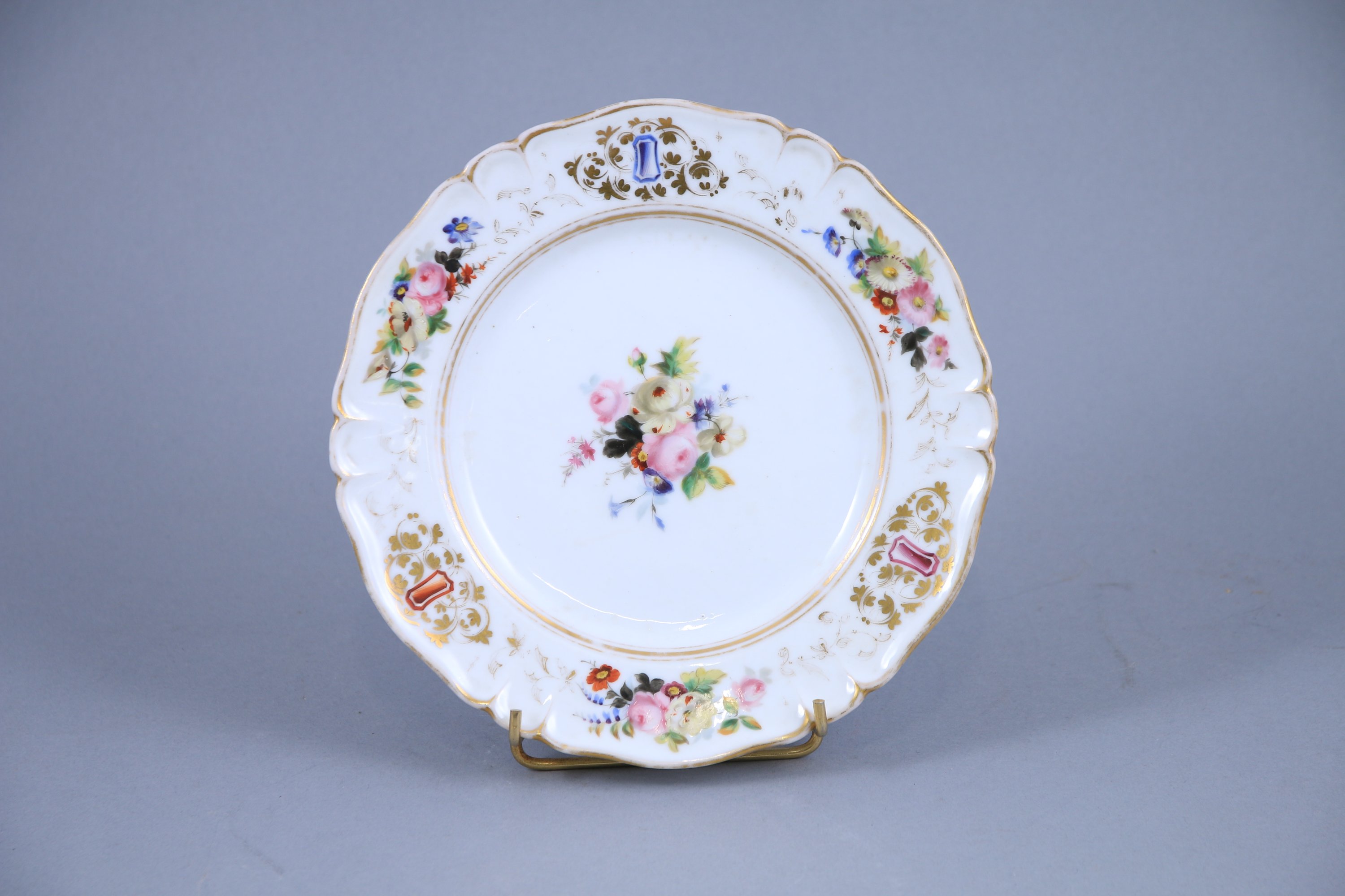 Joint : une assiette en porcelaine de Paris d'un modèle proche. Diam. 22 cm. (usures)