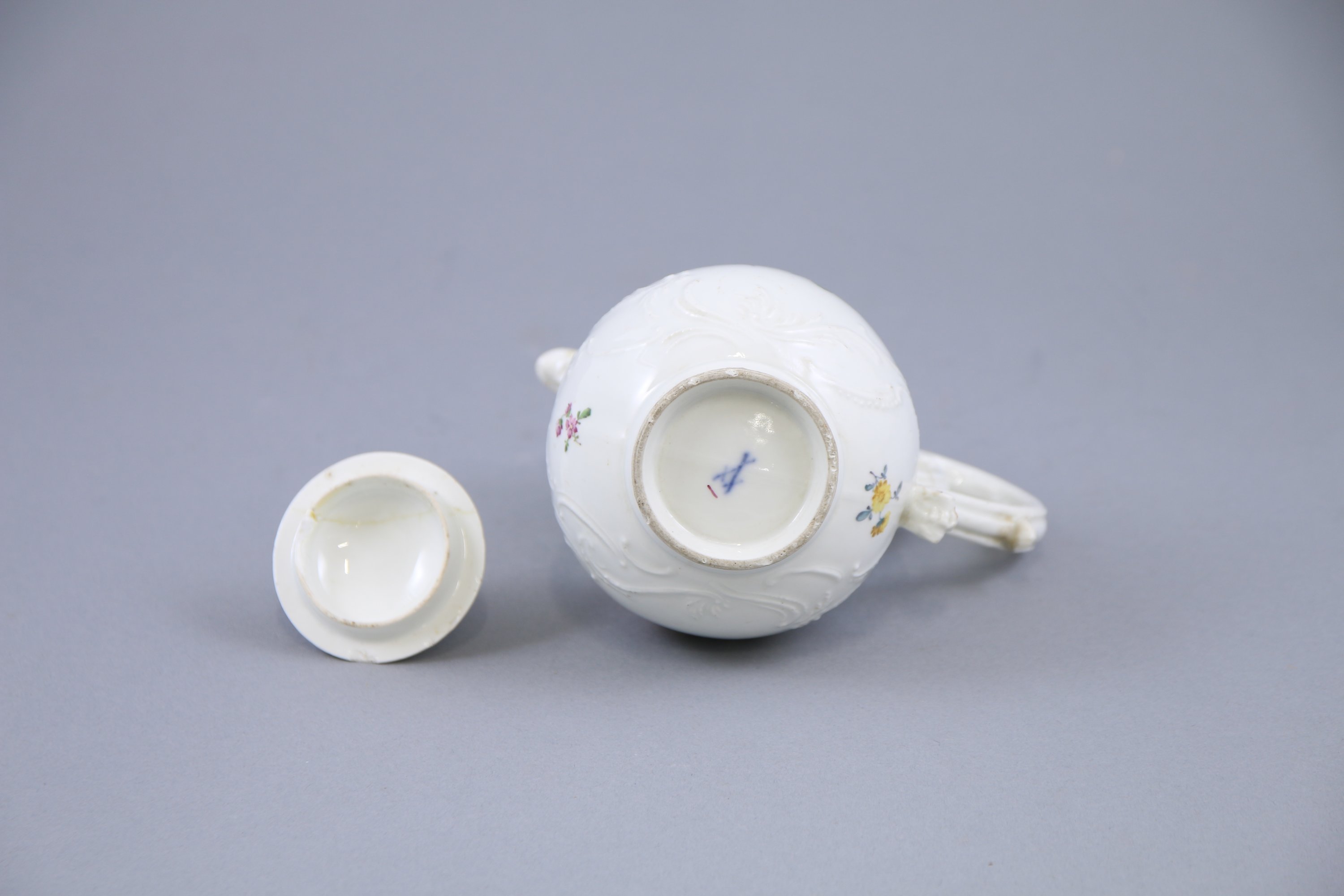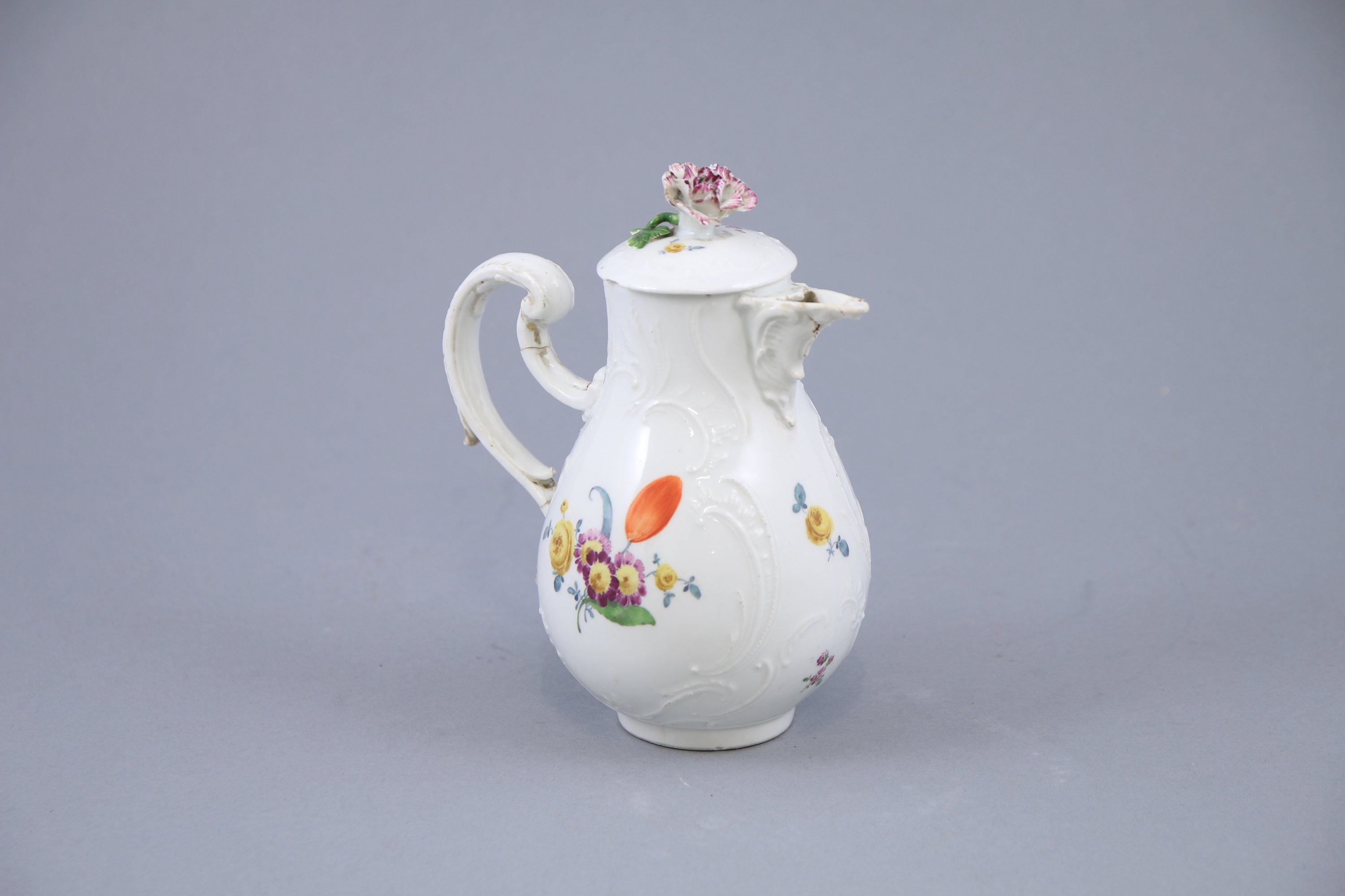 Joint : Verseuse égoïste en porcelaine blanche de Meissen à décor de fleurs polychromes et de rinceaux en méplat. Fin du XVIIIe siècle. Haut. 16,5 cm. (accidents, manques et restaurations)