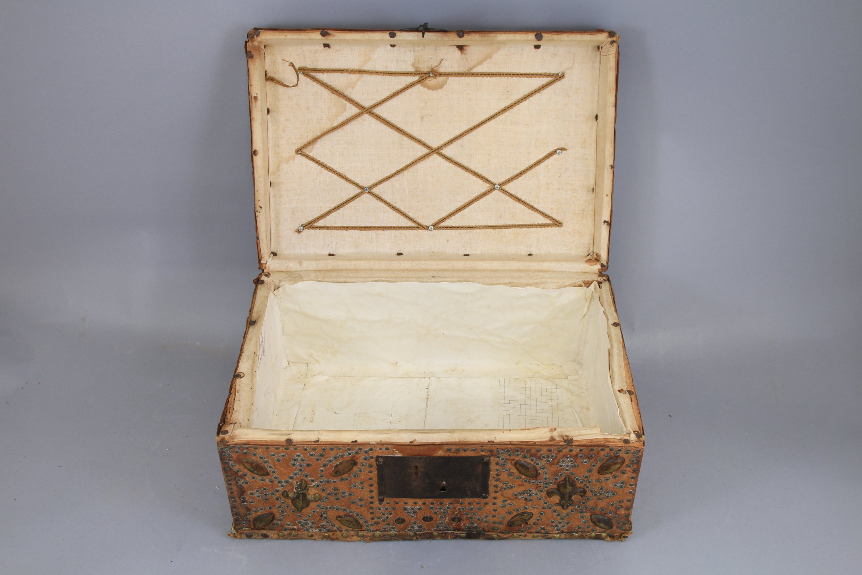 Ame en bois recouvert de cuir à décor clouté en façade dont deux figurant des fleurs de lys, poignée sommitale et moraillon en fer forgé.