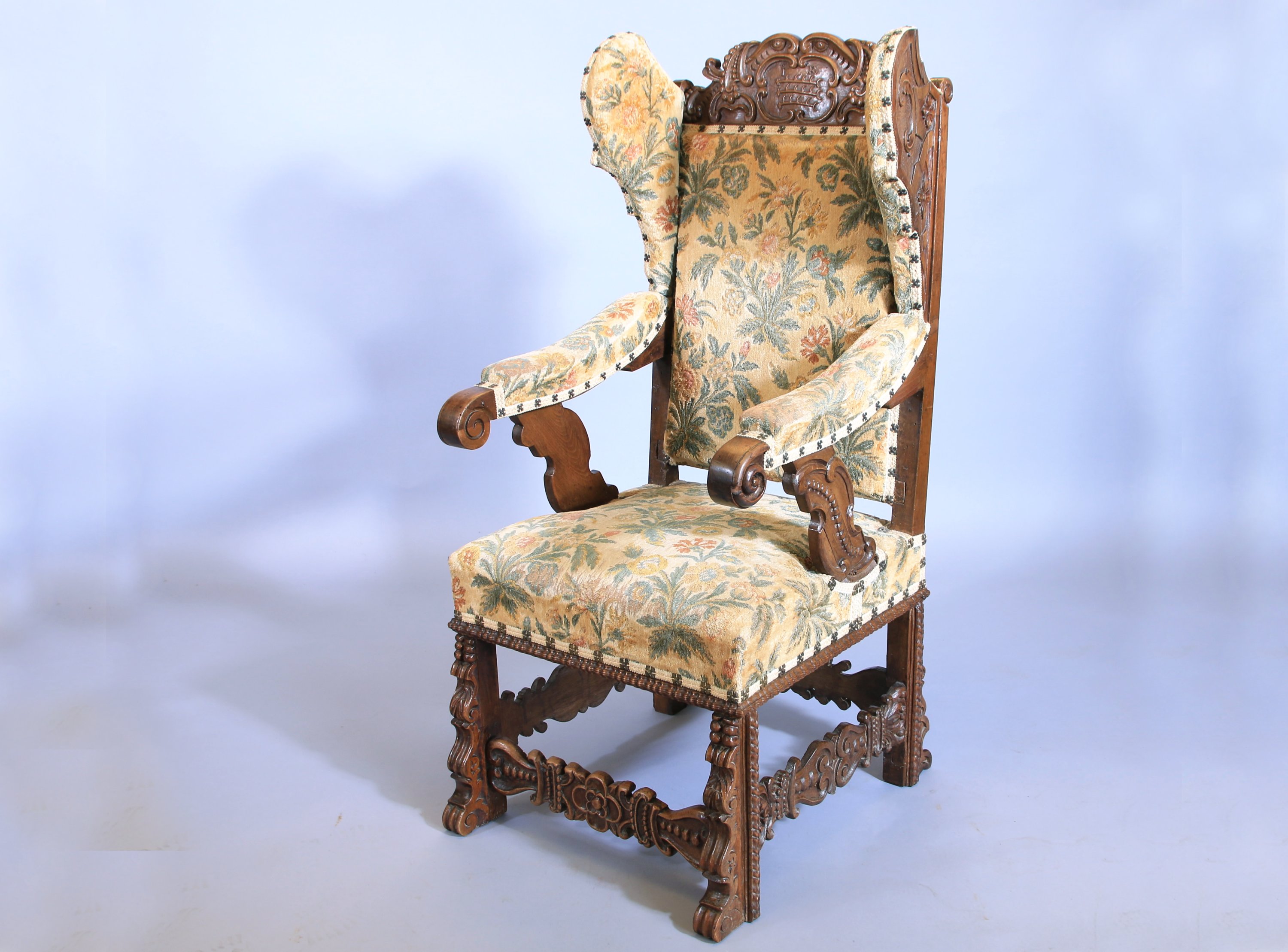 Sommet à décor d'une figure de chimère, accotoirs à manchettes terminés par des enroulements, pieds à décor de volutes, de végétaux et de perles, reliés par des barres d'entretoise richement décorés de volutes, frises de perles et fleurettes.