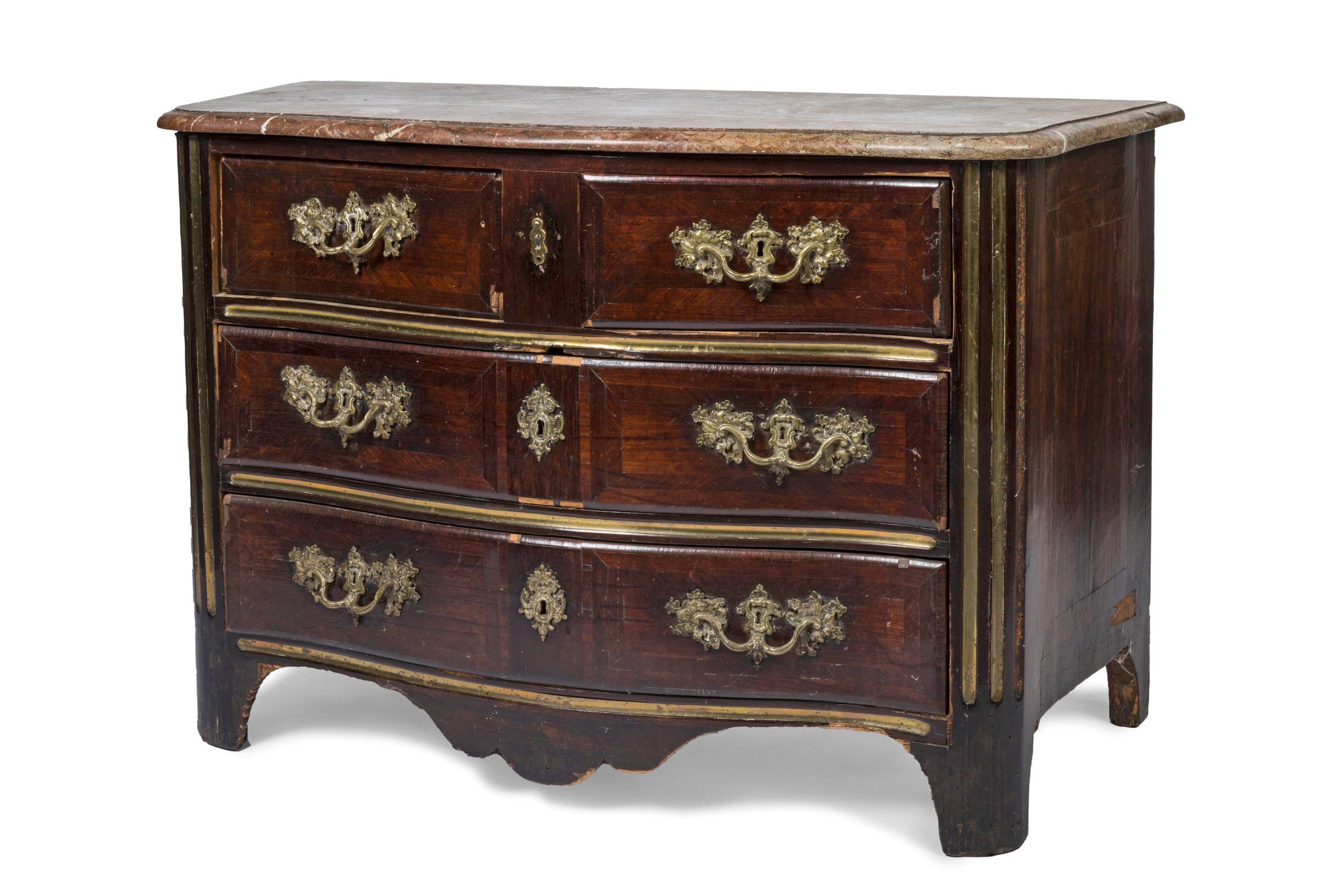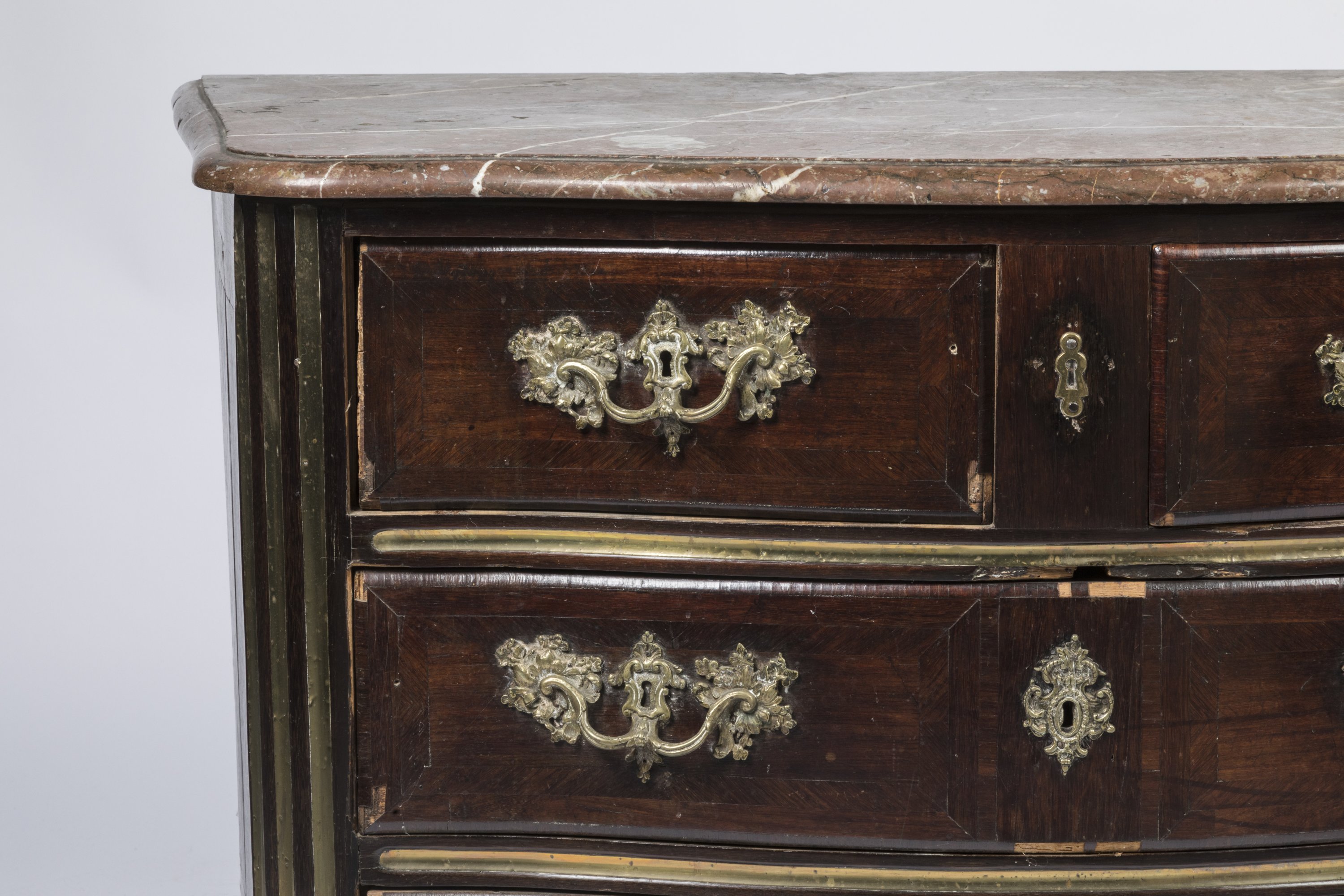 Elle ouvre par quatre tiroirs sur trois rangs séparés par des cannelures de laiton. Chacun est décoré de losanges et d'encadrements soulignés de filets en chevrons.