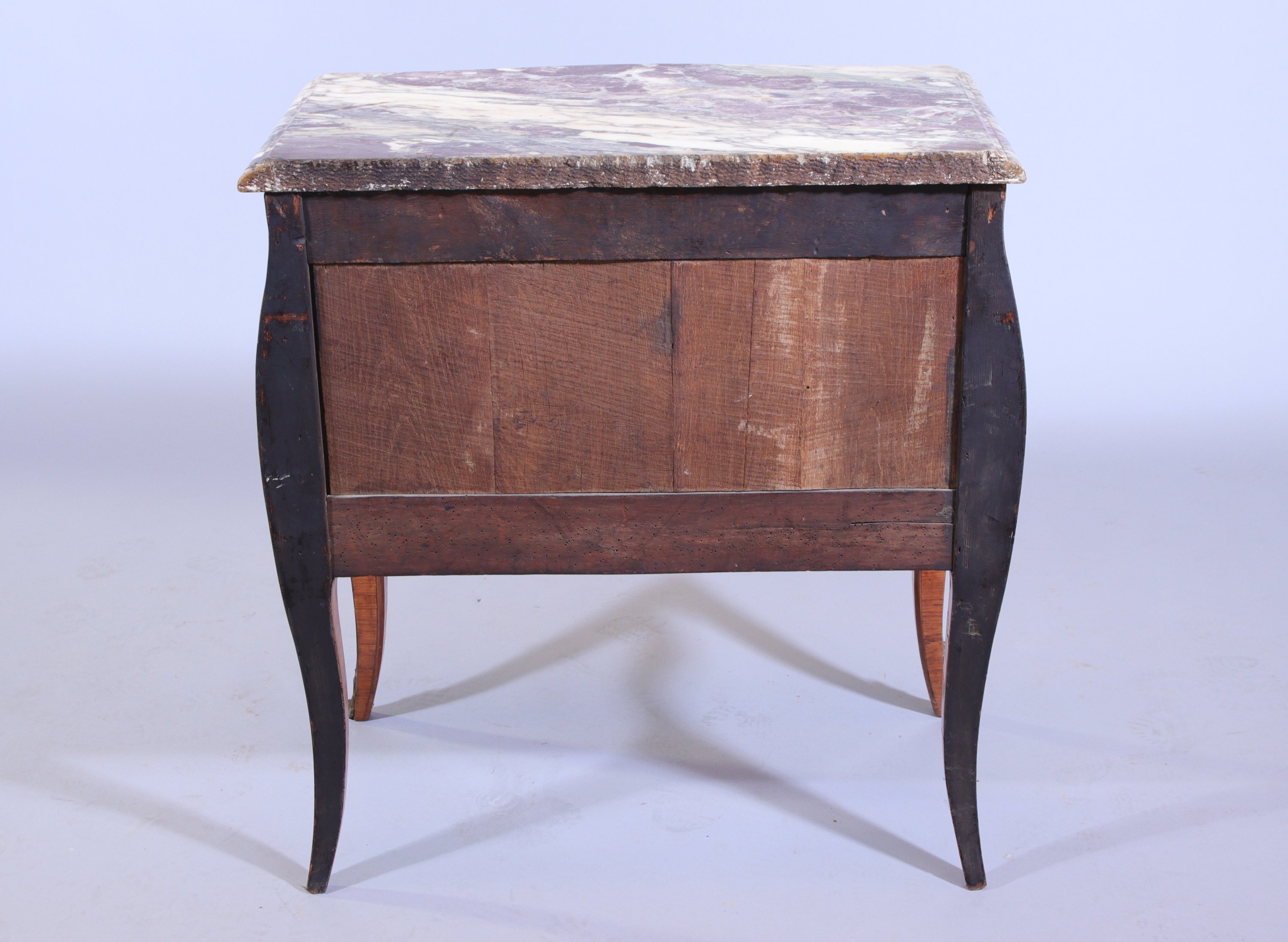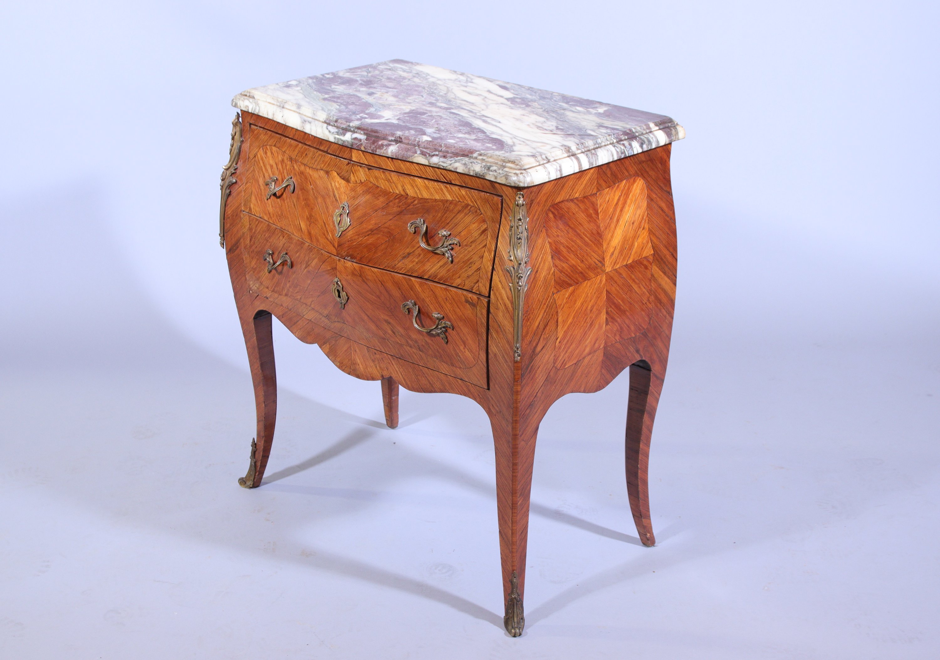 Elle ouvre par deux tiroirs sans traverse décorés d’une marqueterie en X. La ceinture chantournée, les montants pincés terminés par des pieds cambrés. Ornementation de bronzes comme entrées de serrures, poignées de tirage fixes, chutes et sabots.