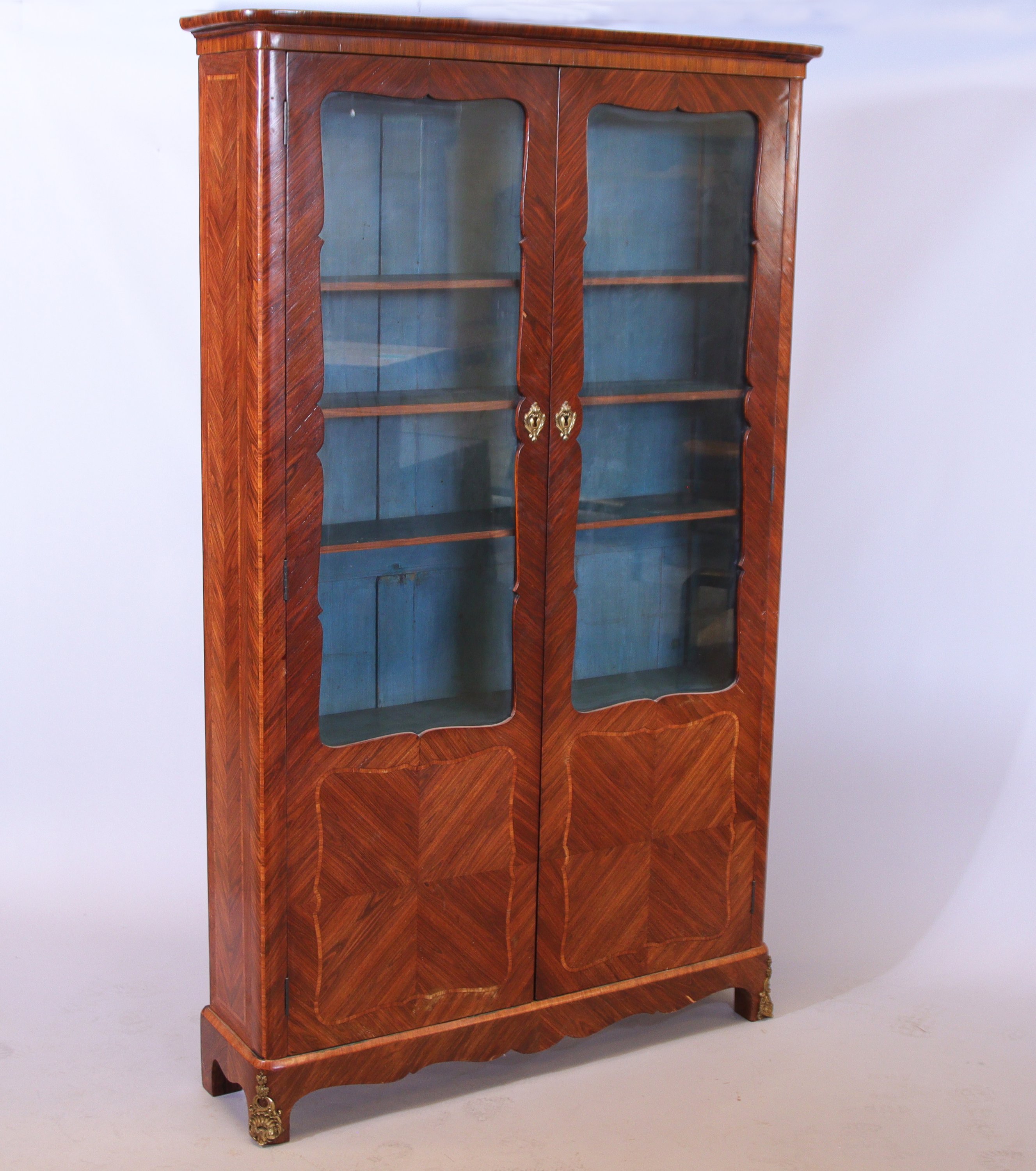 Coiffée d’une corniche et ouvrant par deux portes vitrées à entourage chantourné dont la partie inférieure est soulignée d’un filet. L’intérieur peint en bleu. Les côtés marquetés en chevrons, le tablier mouvementé. Quatre pieds.