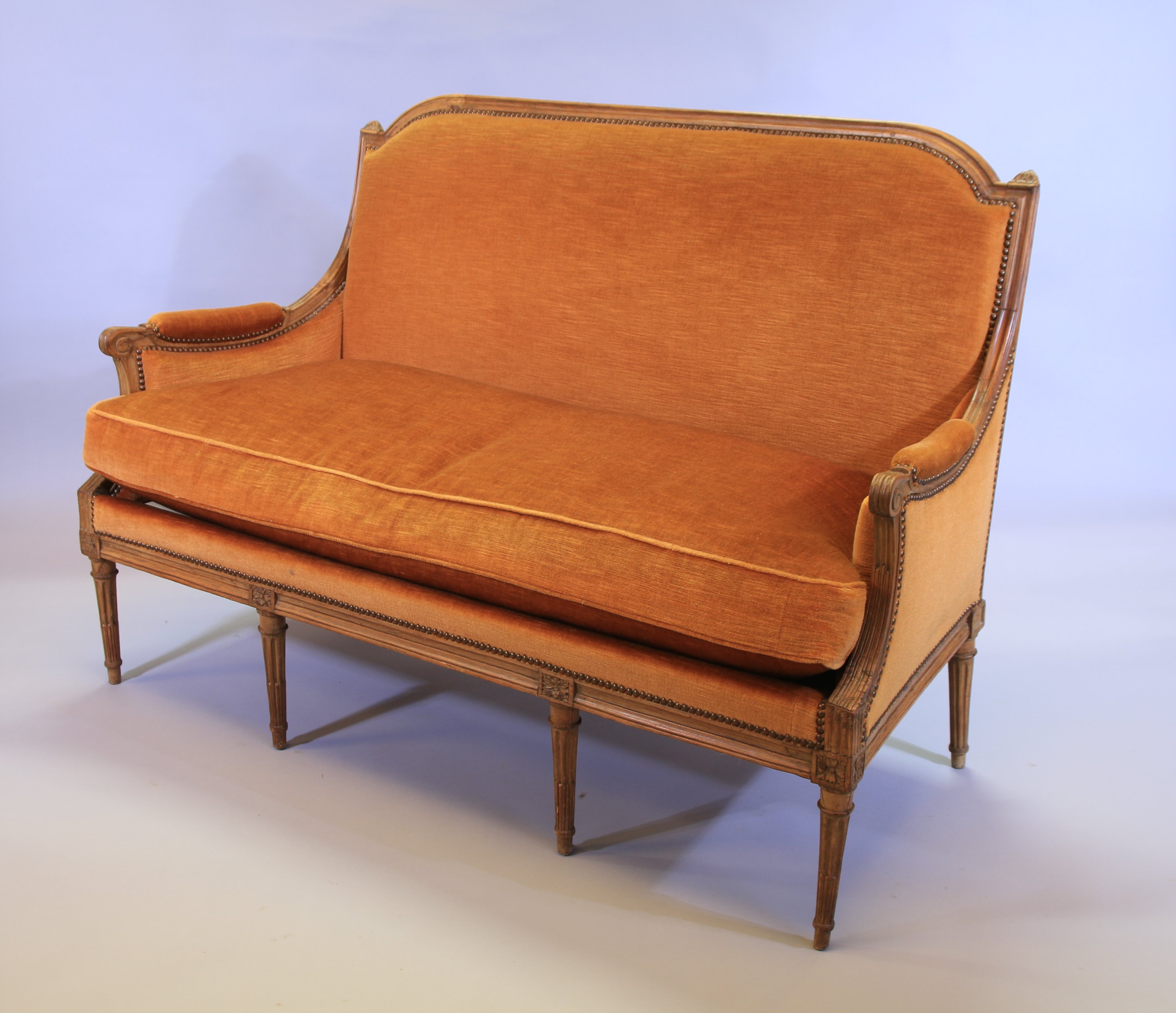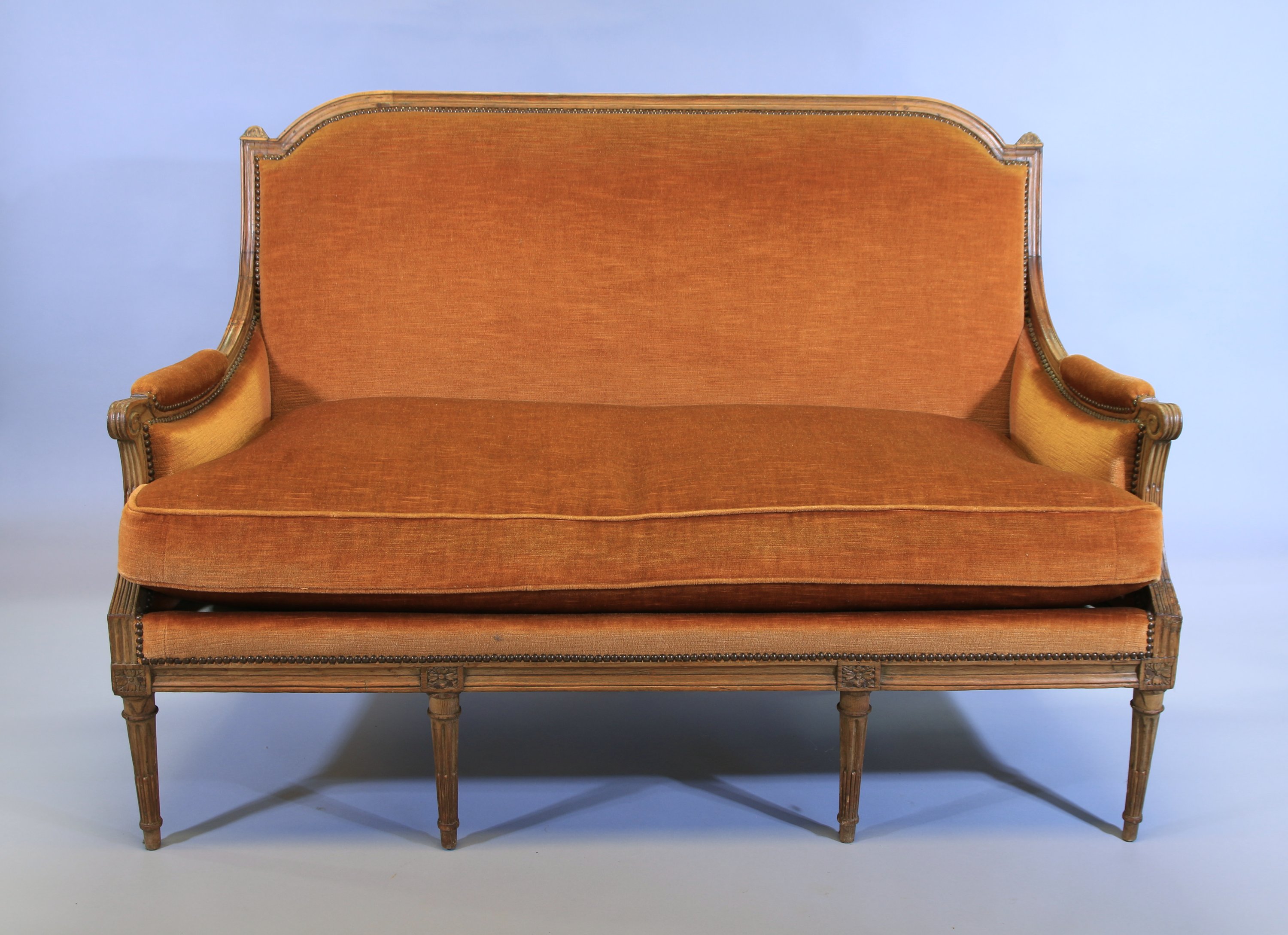 Dossier en chapeau de gendarme, accoudoirs à manchettes terminés par des enroulements, montants cannelés et rudentés. Ils reposent sur huit pieds fuselés, cannelés et rudentés, fleurettes aux dés de raccordement.
