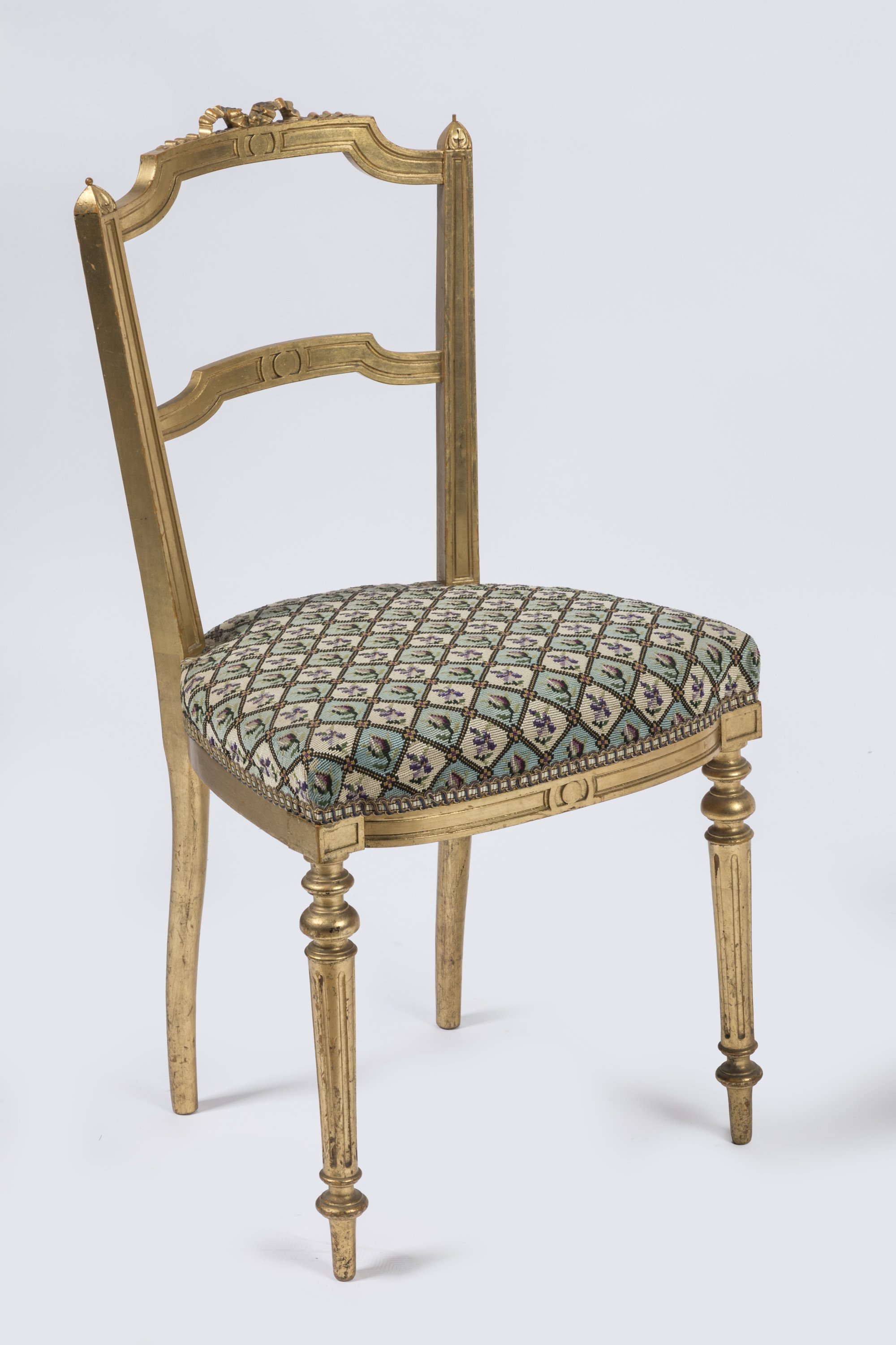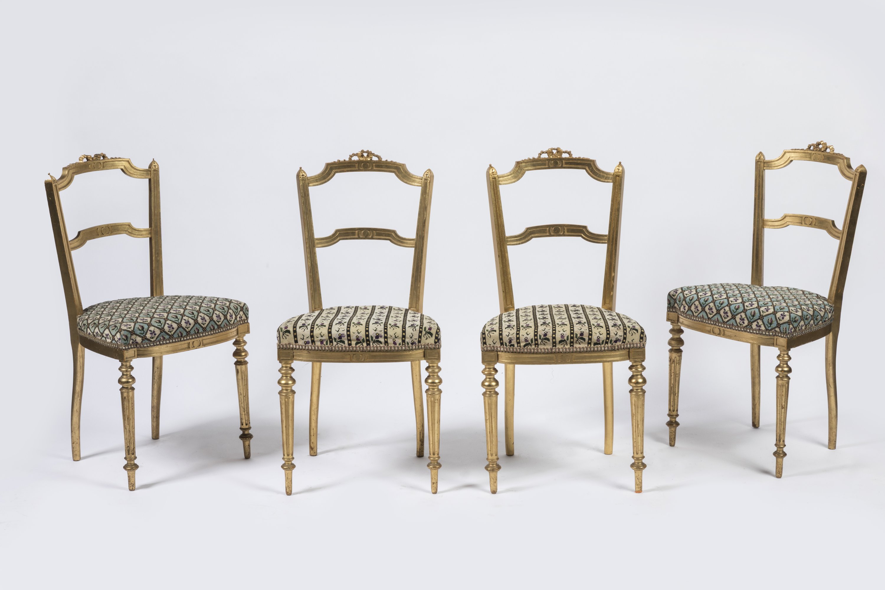 Pouvant former suite. Les dossiers ajourés en chapeau de gendarme sont surmontés de rubans noués et ajourés. Les assises mouvementées et moulurées, elles reposent sur quatre pieds fuselés, cannelés et baguées.