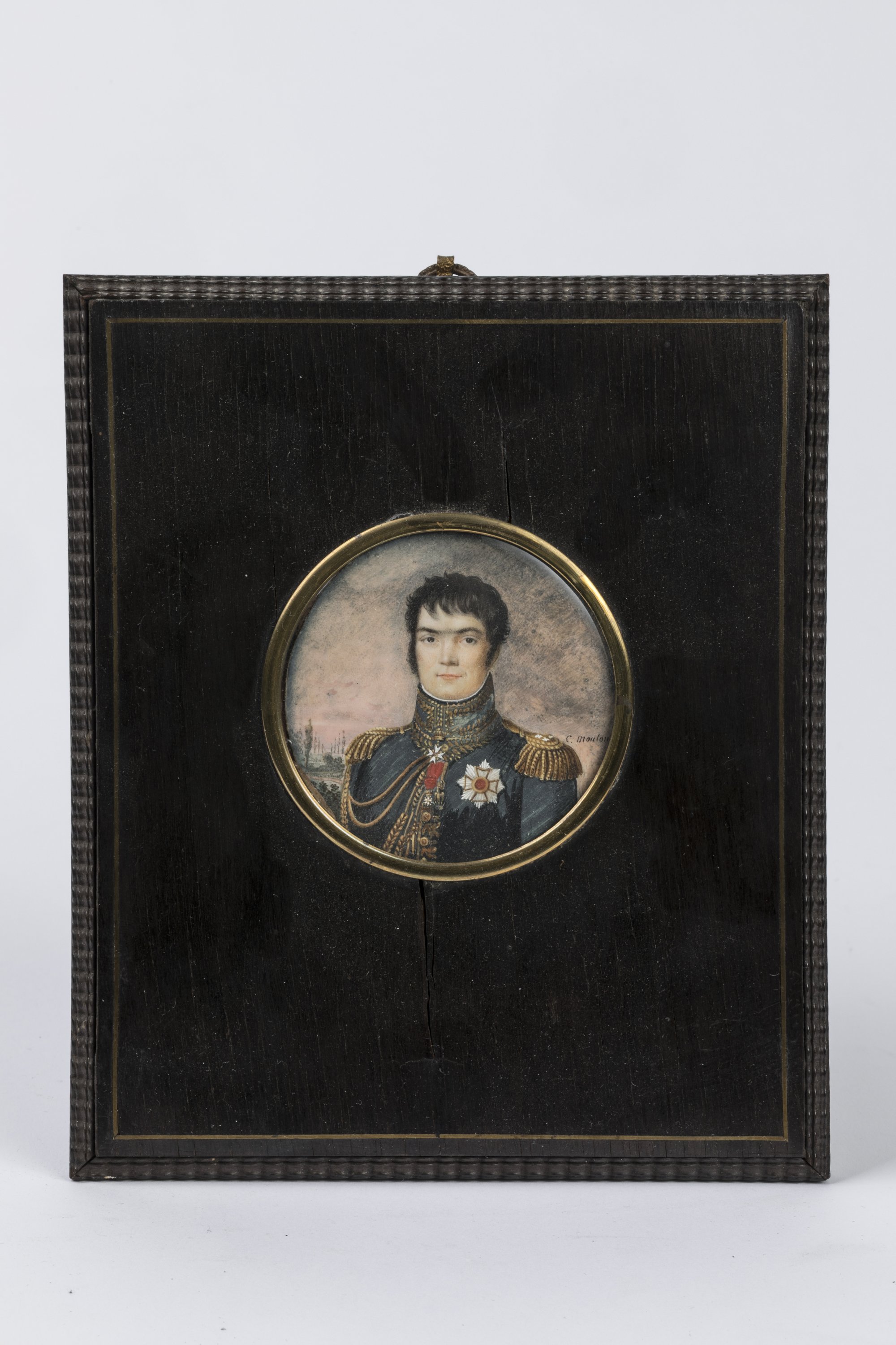 Notre homme porte ses décorations, certaines passées en vente ces dernières années, notamment son insigne de commandeur de la Couronne de fer et sa plaque de l’ordre de Saint Hubert de Bavière fabriquée par Biennais.