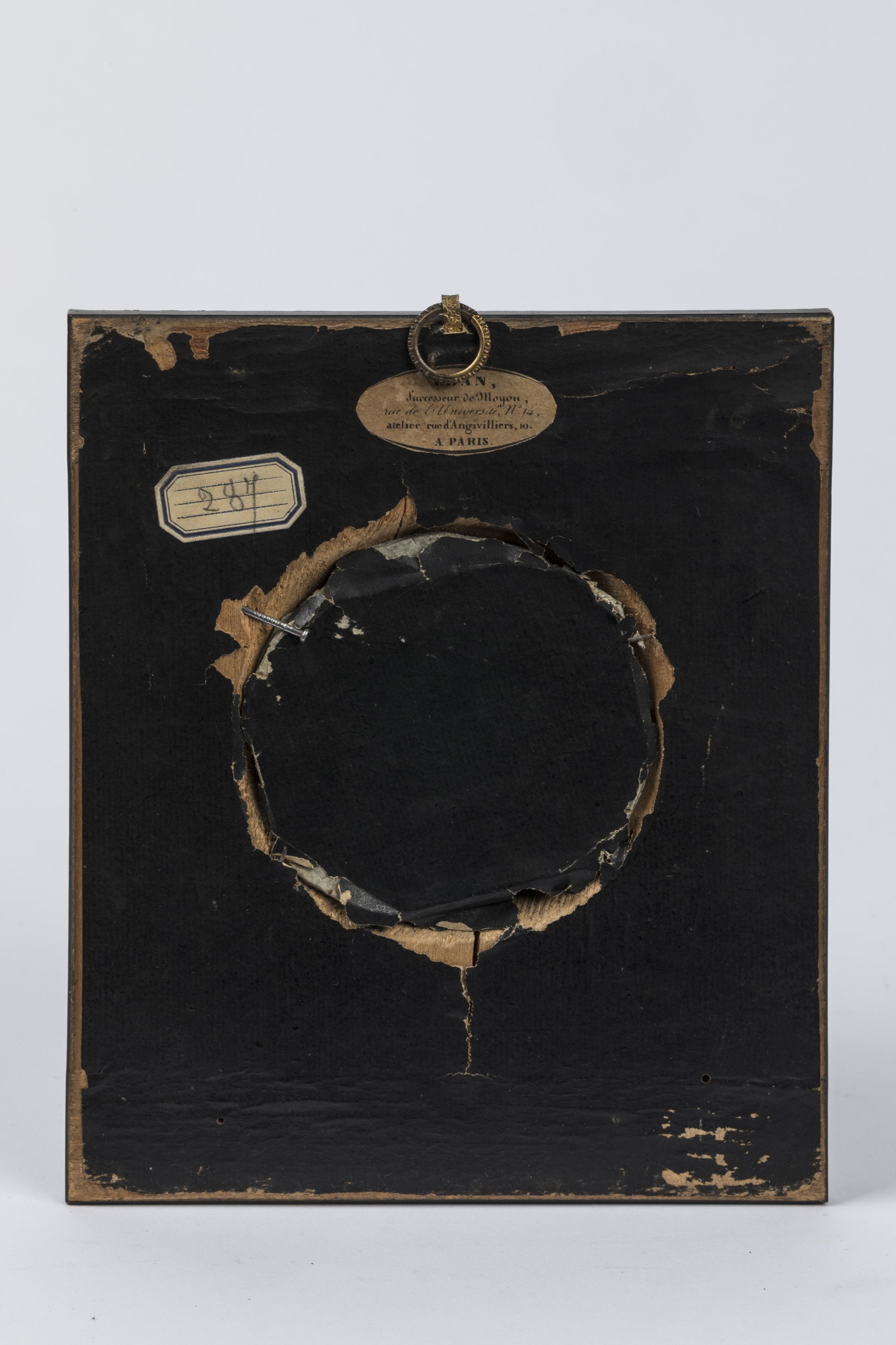 Dans un cadre à suspendre vers 1840-1850 en bois (fêles) décoré de filets de laiton avec étiquette au dos de « EDAN, successeur de MOYON rue de l’université n°14, atelier rue d’Angivilliers, 10 à Paris ». Présentée sous verre, cerclée de laiton. Haut. 18 Larg. 16 cm.