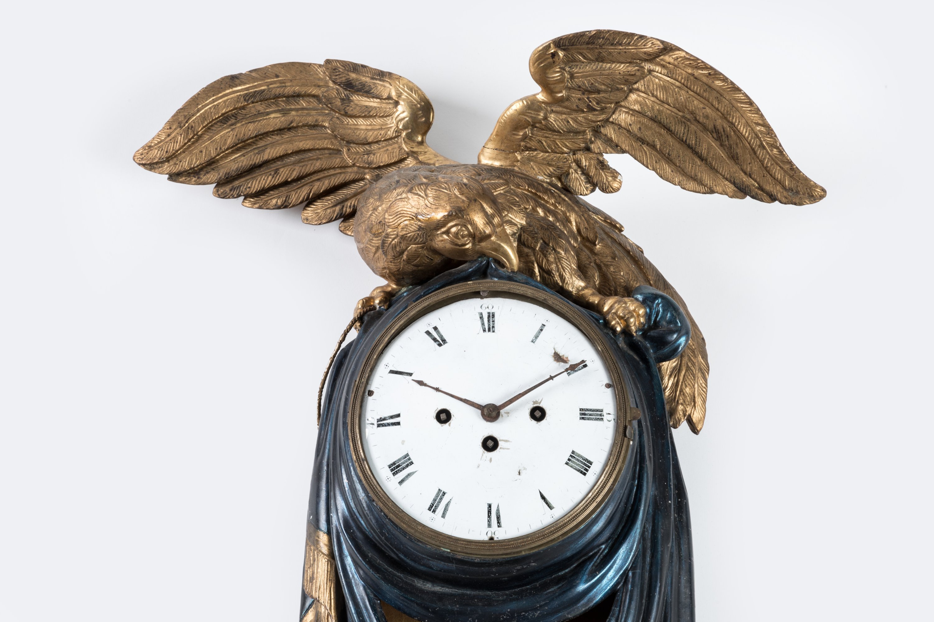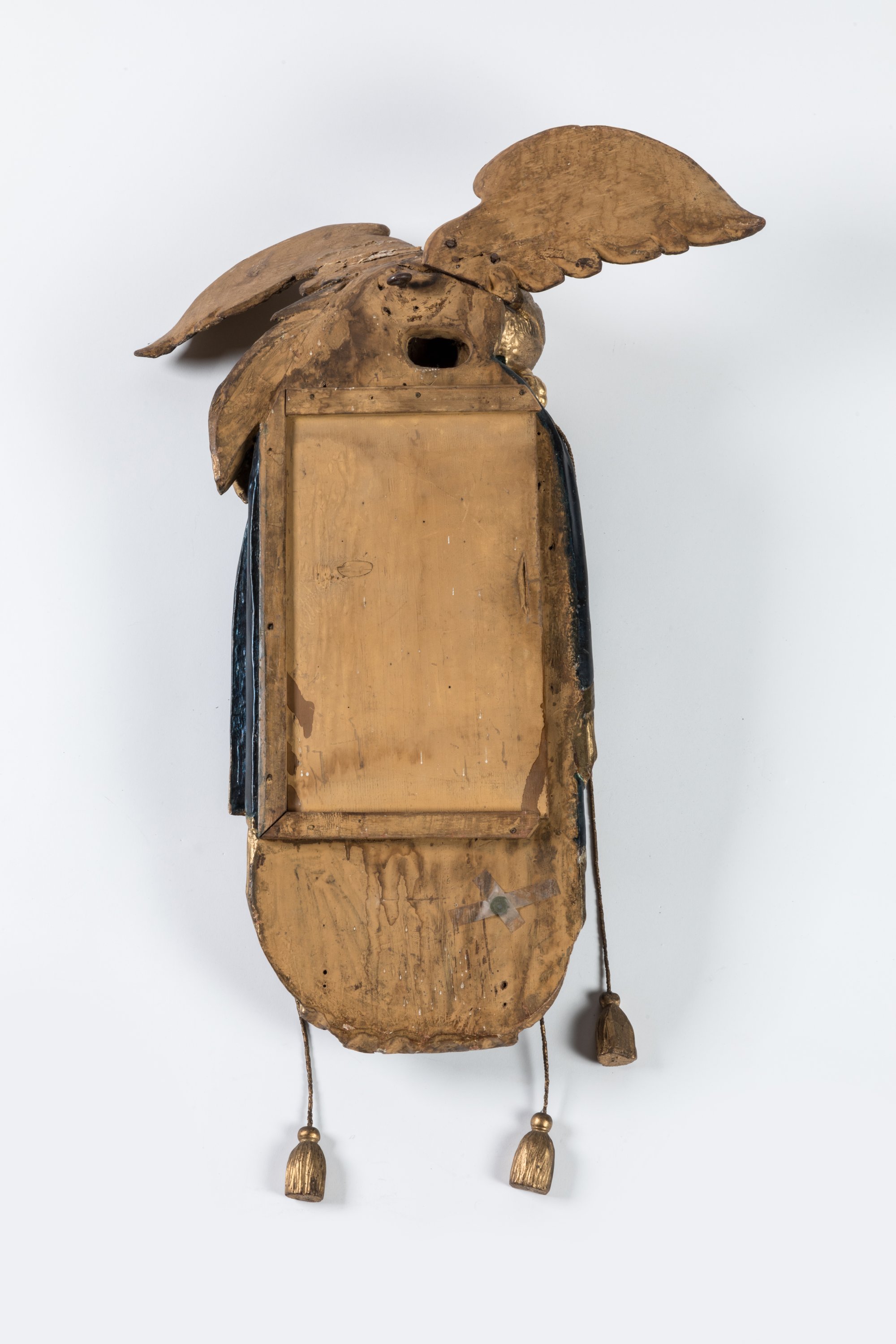 Bois sculpté polychrome et doré. Un aigle aux ailes déployées retient dans ses serres un cadran émaillé, les heures en chiffres arabes, sur un fond de draperies et passementerie.