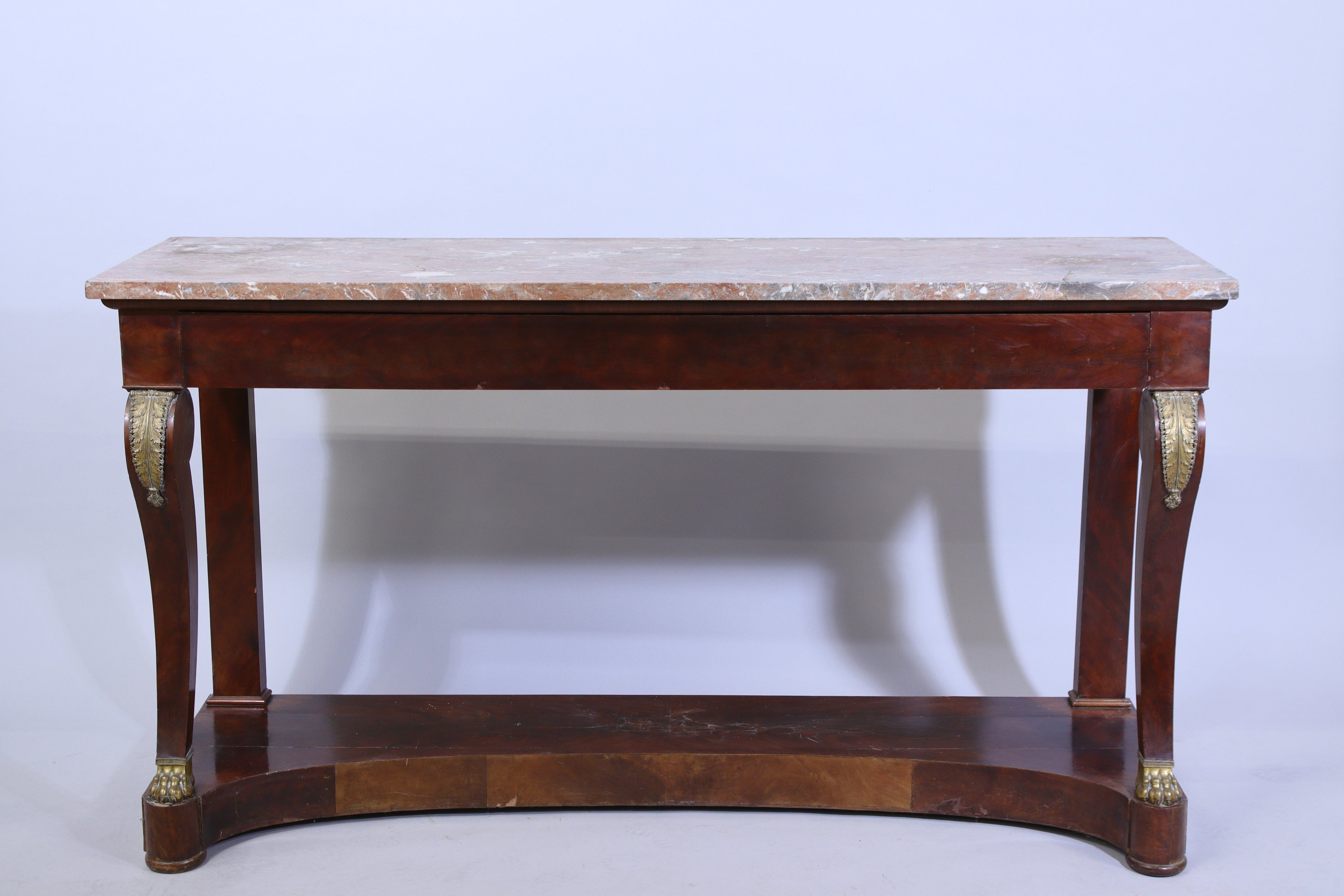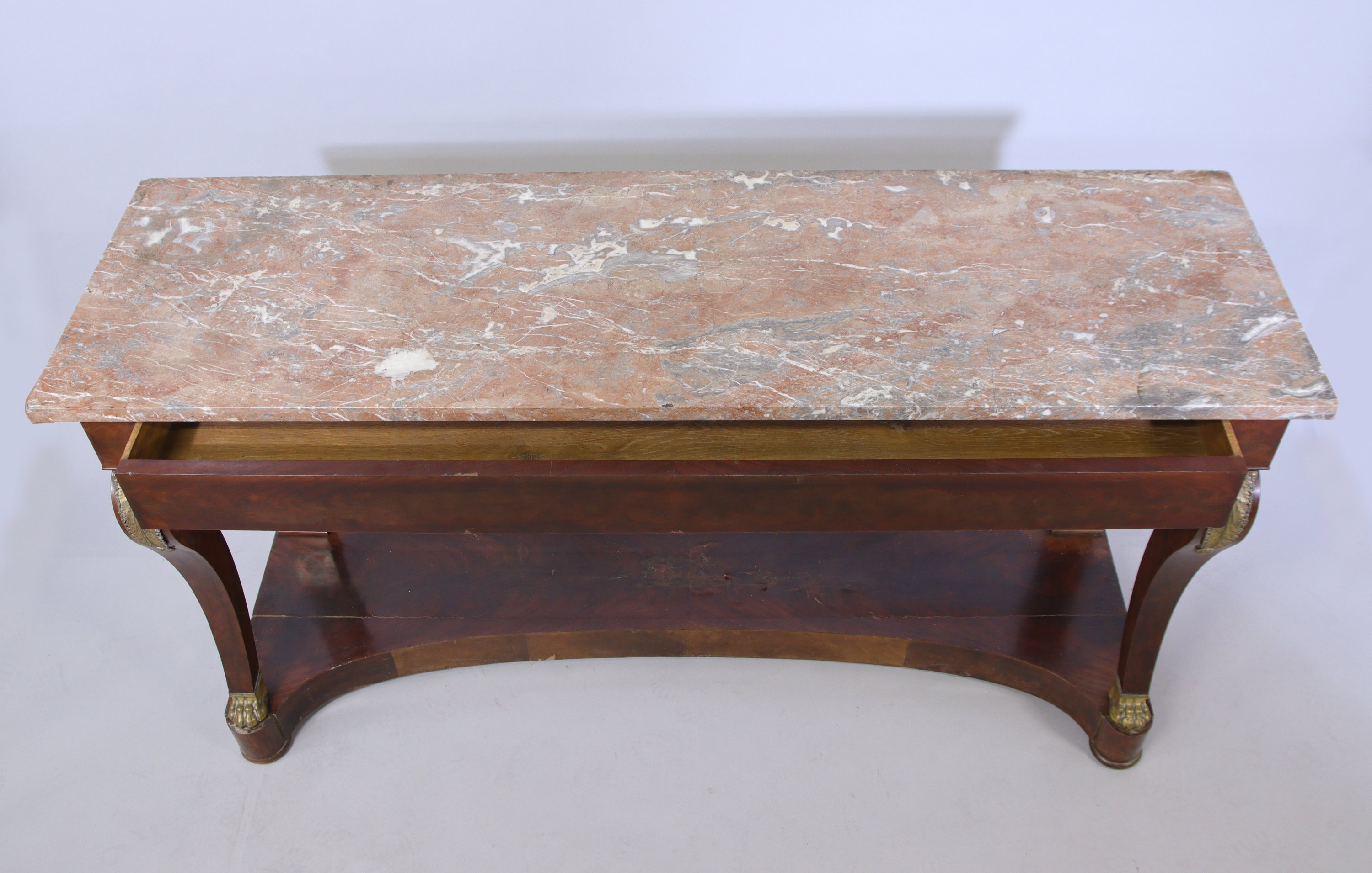 Elle ouvre par un tiroir en ceinture et repose sur deux pieds antérieurs en console décorés, en partie supérieure, d'une applique en bronze en forme de feuilles d'acanthe ceinturée d'une frise de fleurettes et terminés par des griffes de lion. Les pieds postérieurs sont en pilastre, la base en socle. Dessus de marbre brèche de Bohème.