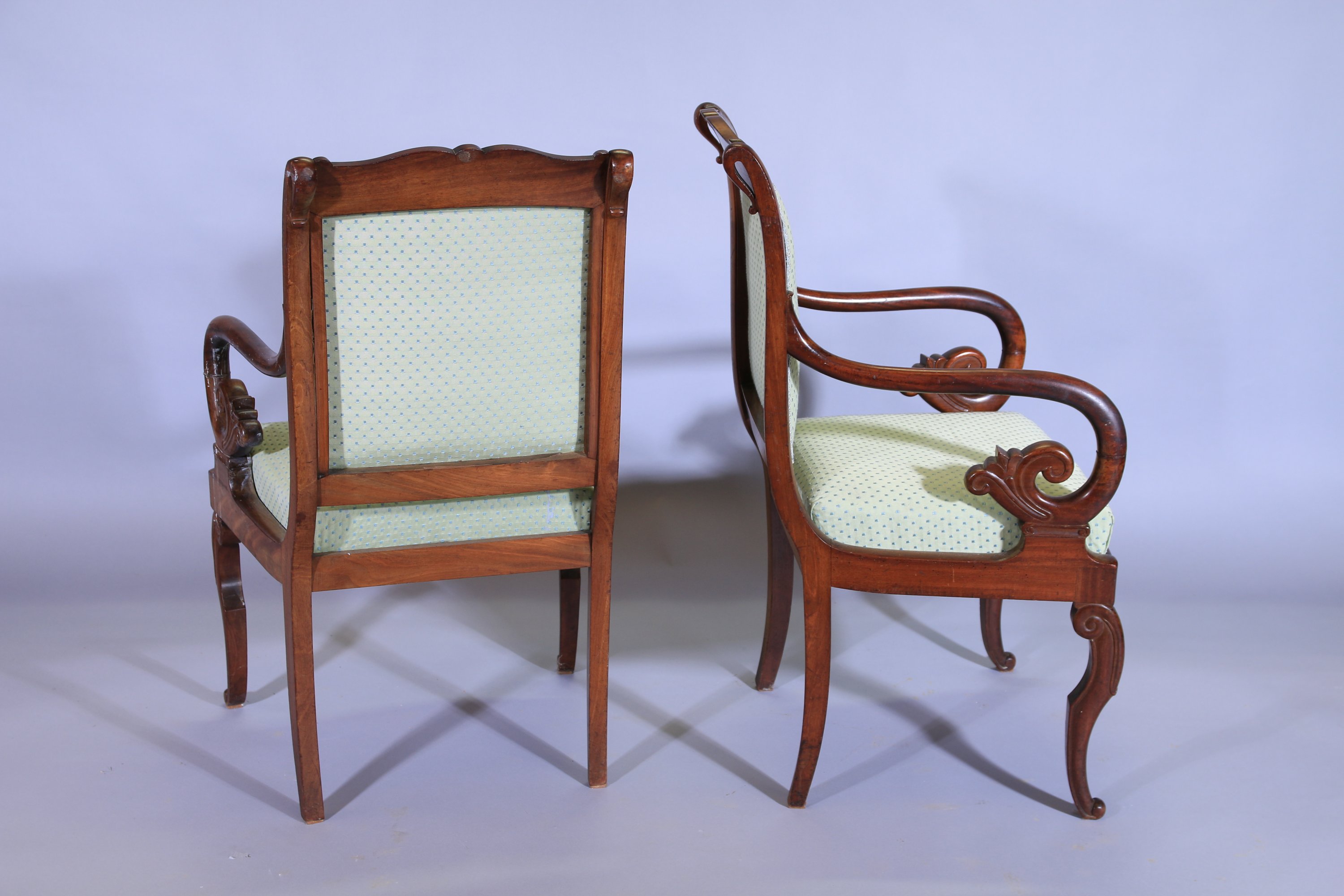 Le dossier légèrement renversé à décor de volutes, les accotoirs en crosse. Les pieds antérieurs en jarret.