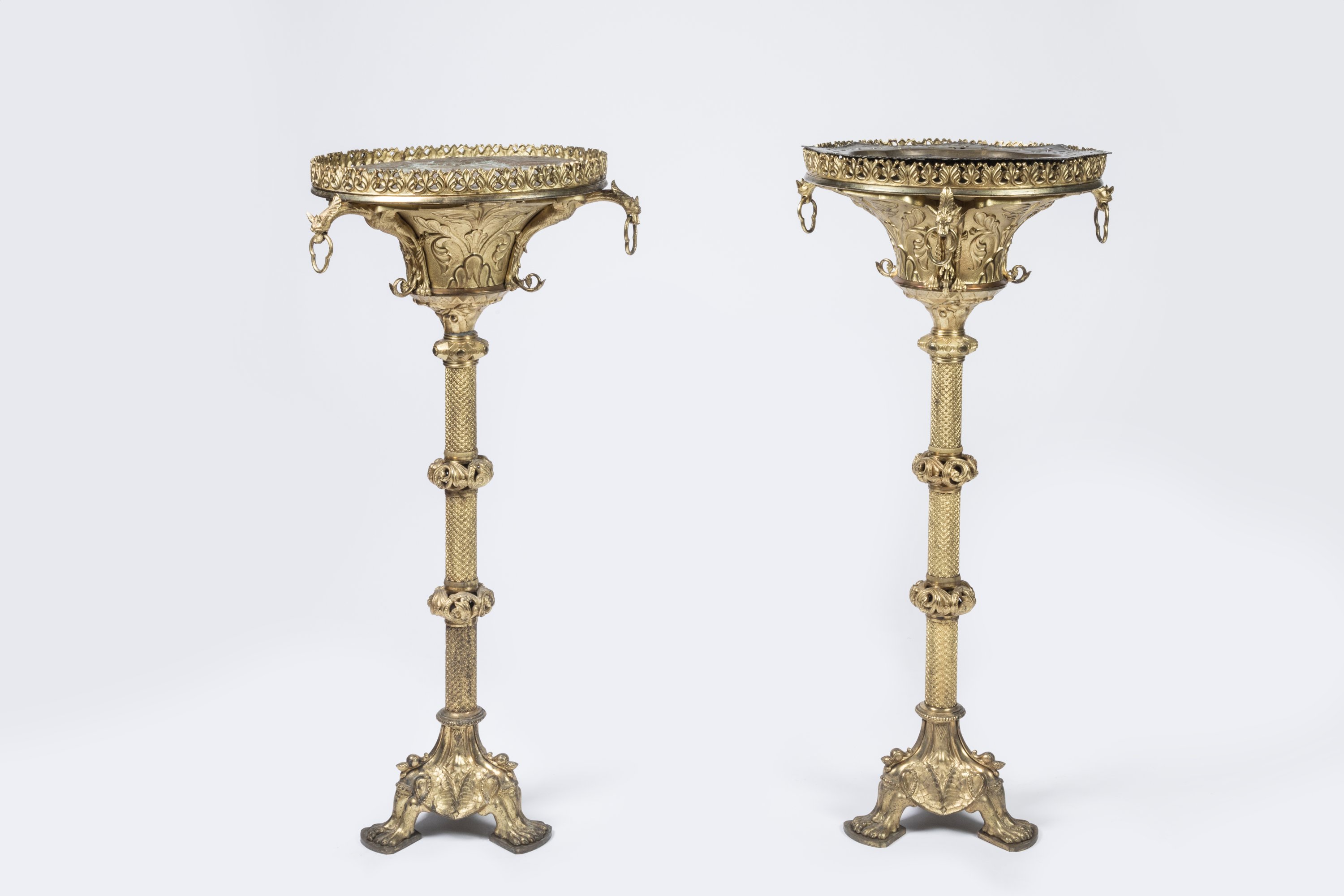 Surmontées d'un vase orientaliste repercé, ornées de trois têtes de dragons retenant des anneaux sur un fût central reposant sur trois pieds en griffes de lion.