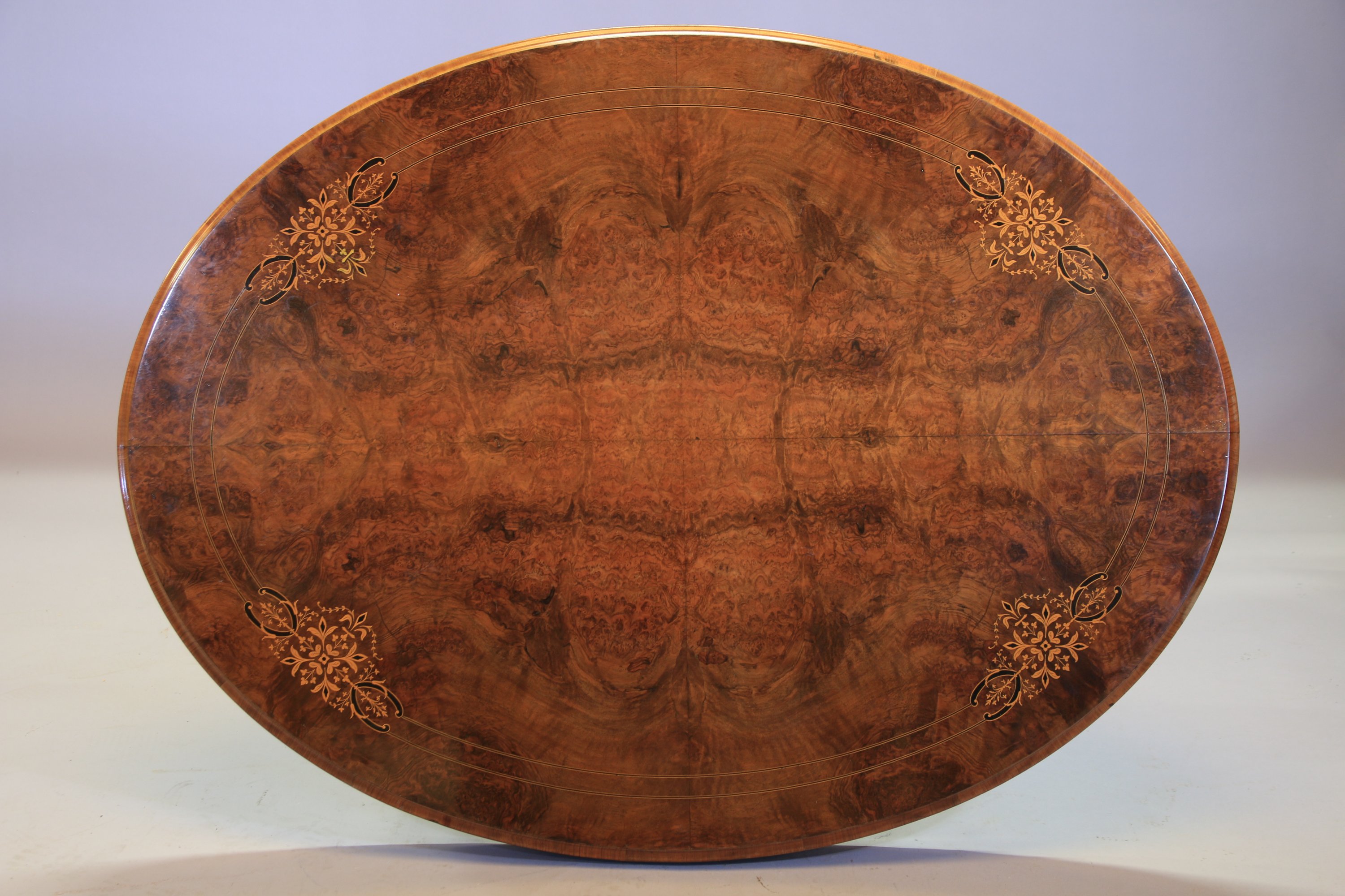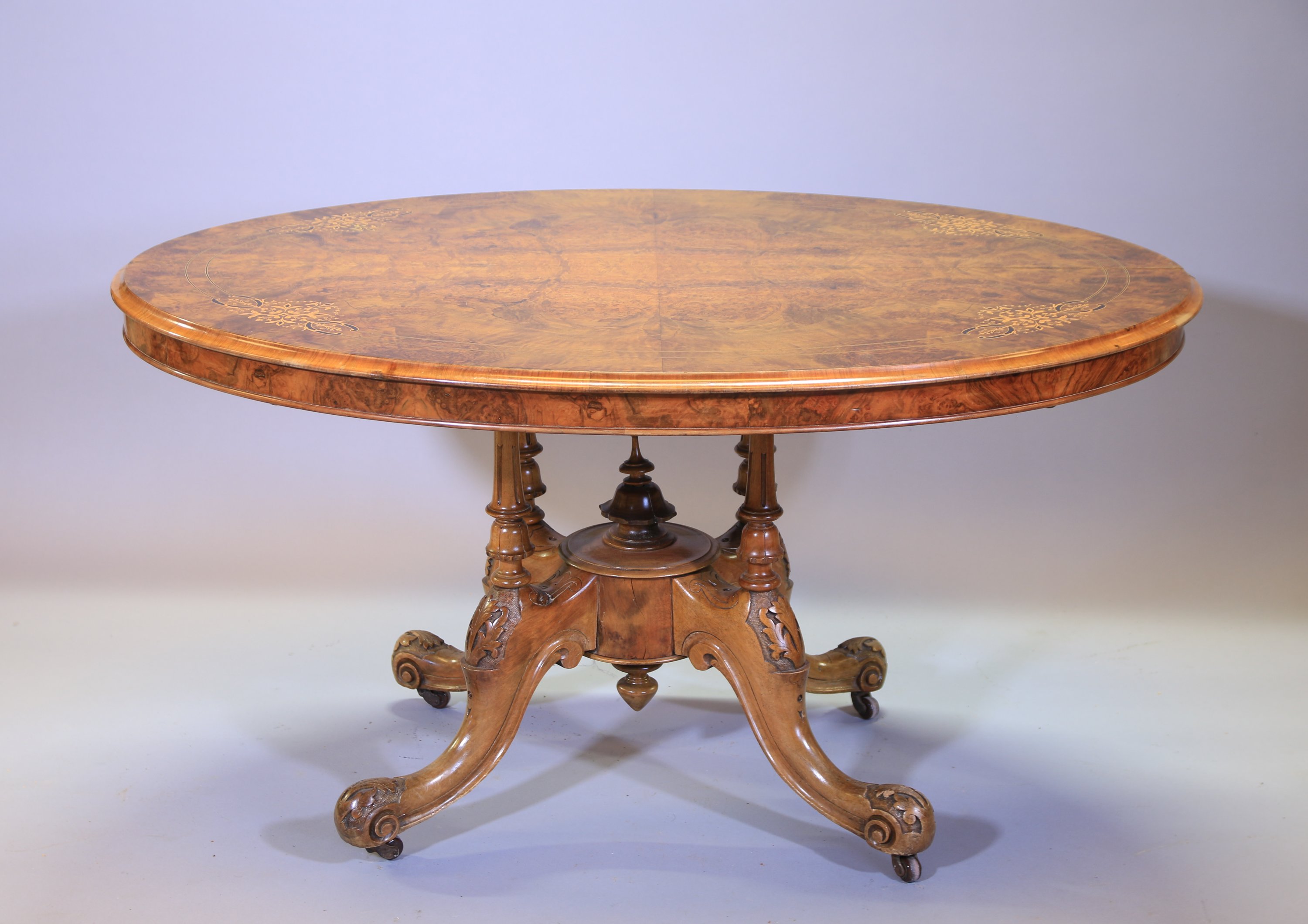 en loupe d'orme. Le plateau à décor floral en incrustation de bois clairs et bois foncés repose sur un piétement quadripode à colonnes et consoles renversées. Entretoise surmontée d'un motif décoratif en forme de toupie. Roulettes.
