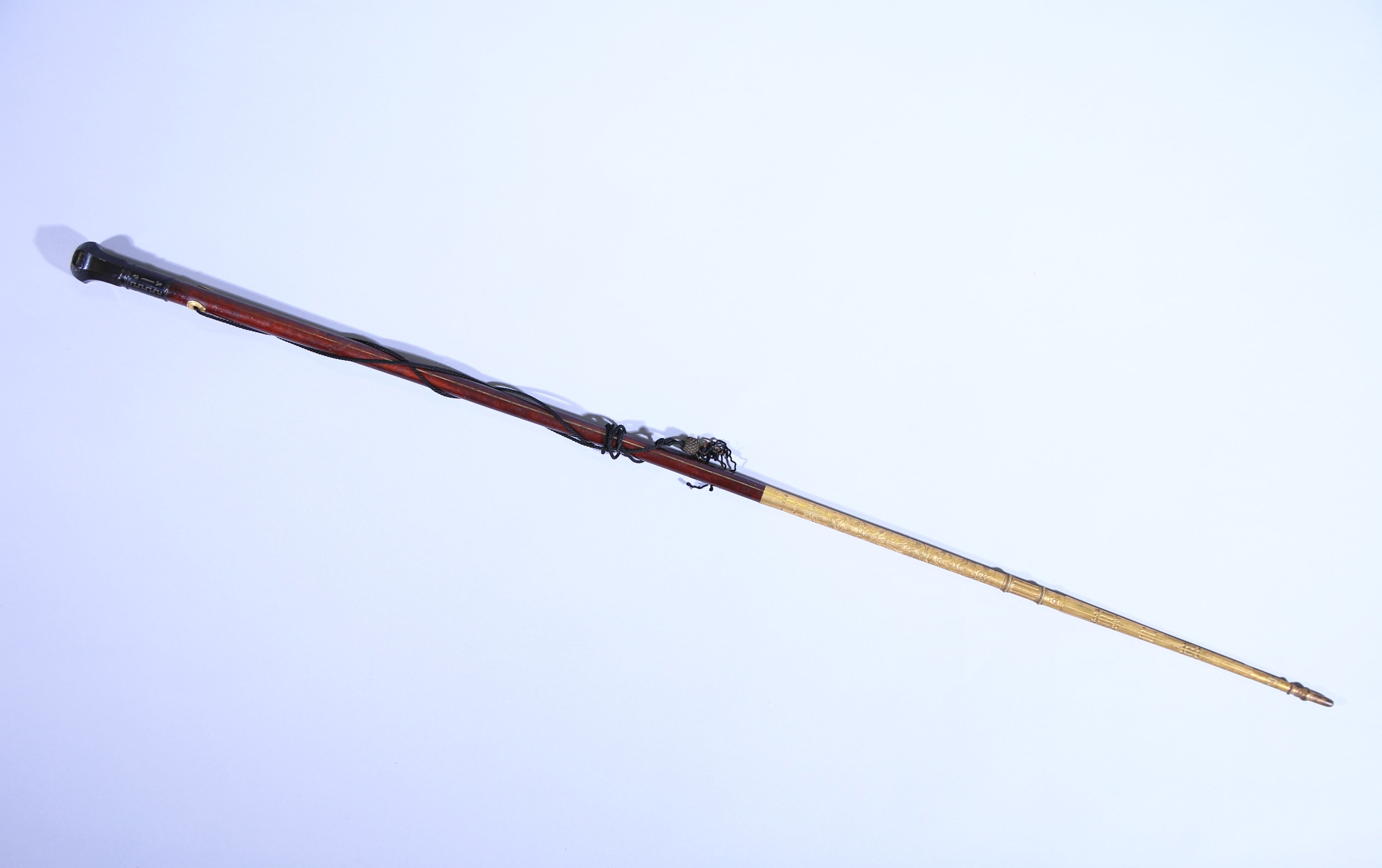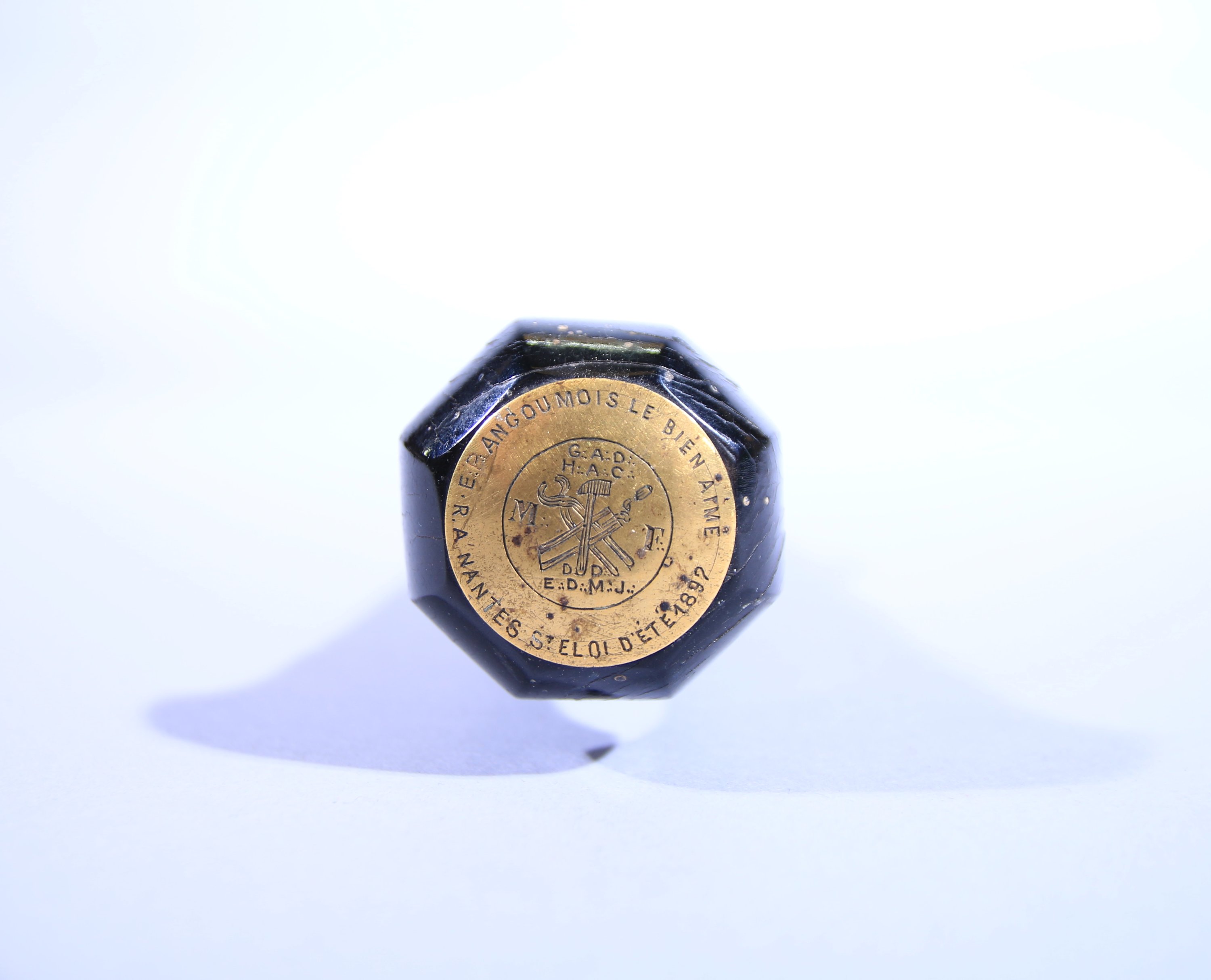 Pommeau octogonal en corne orné d'une pastille en laiton inscrite " E.R. Angoumois le Bien Aimé / R.A. Nantes St Eloi d'été 1897" ainsi que les lettres "G.A.D.H.A.C / D.D.E.D.M.J". férule en laiton dévissable à décor de symboles initiatiques portant une inscription "Lyon 1893 déposé /645".