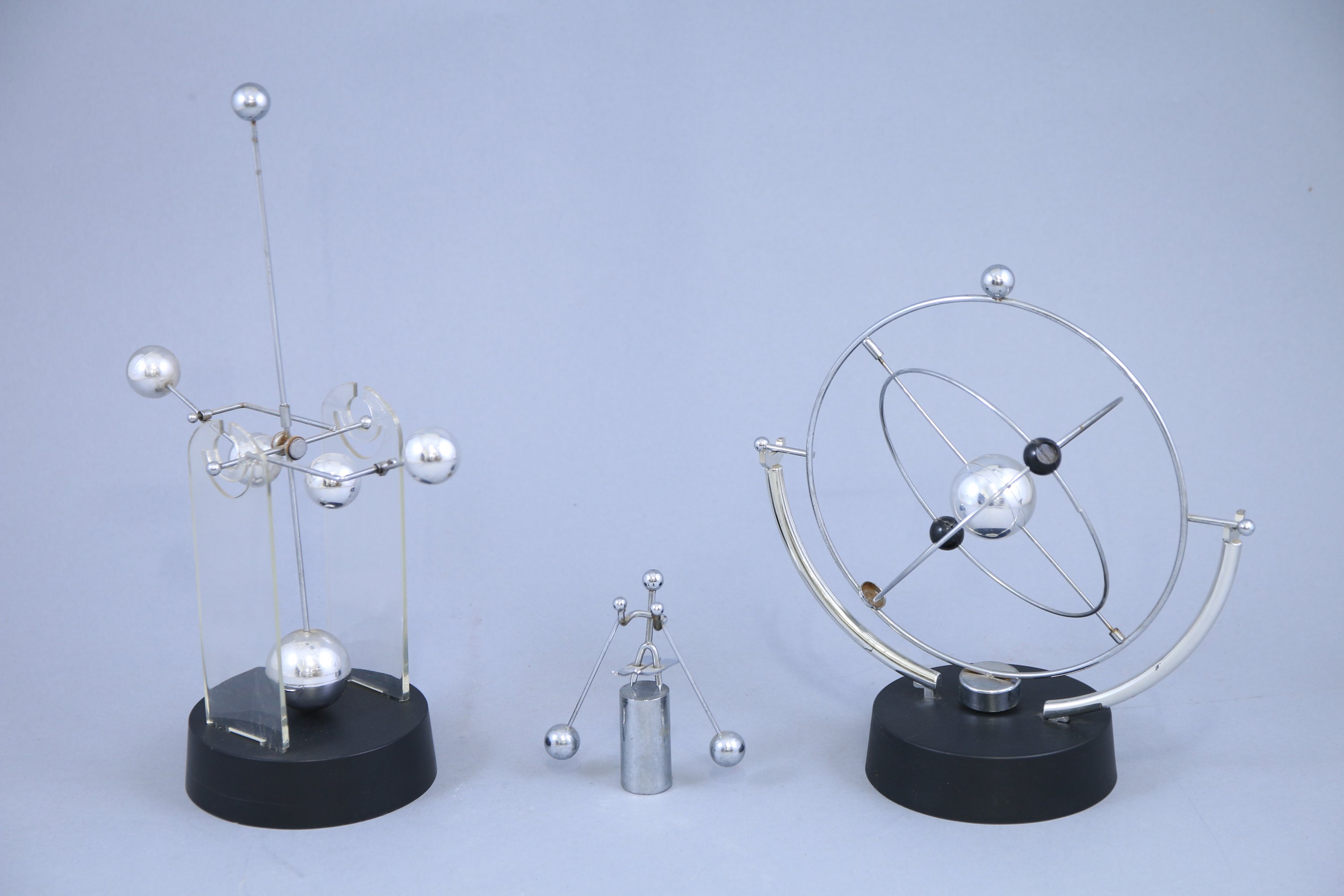 - Trois objets de décoration de style cinétique dont une sphère et un pendule.