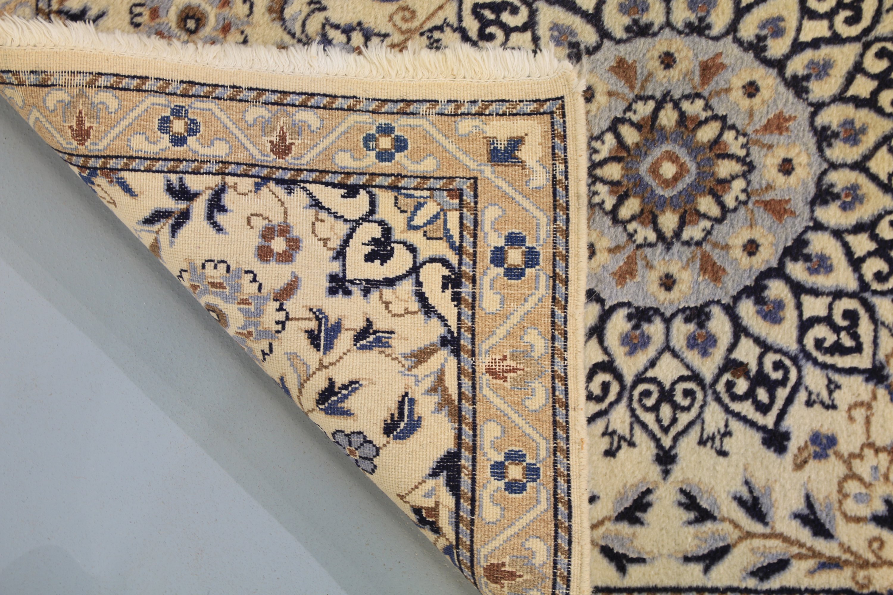 Fond crème, décor bleu de trois rosaces dans des tiges fleuries, bordure de fleurs dans des rinceaux.