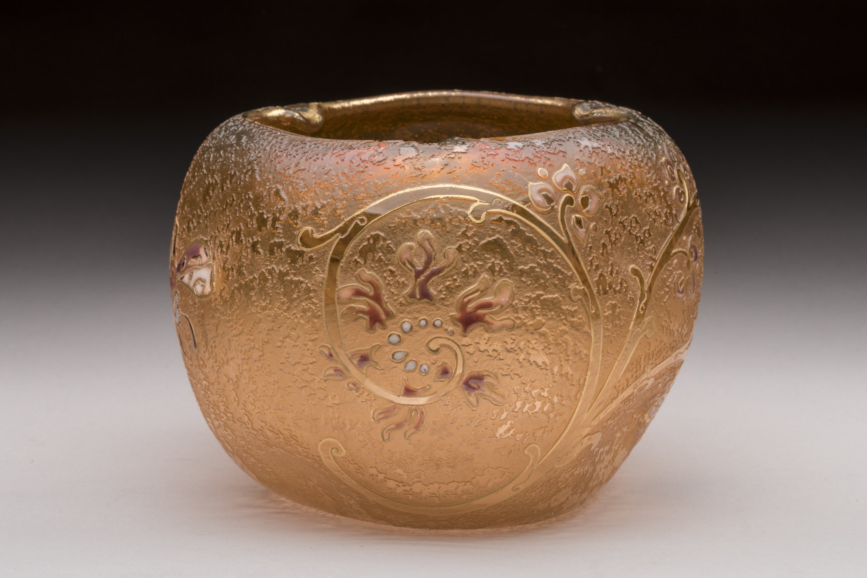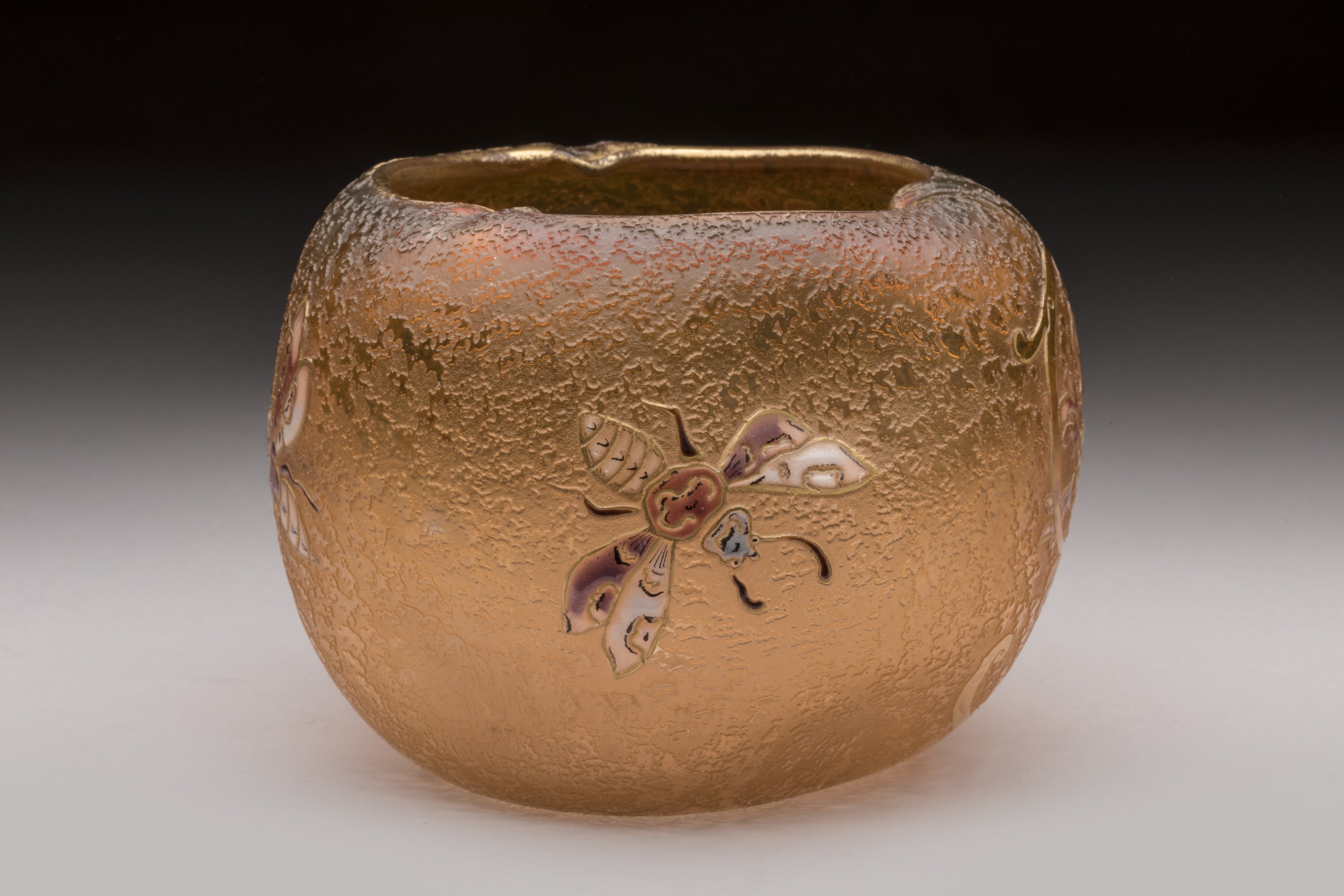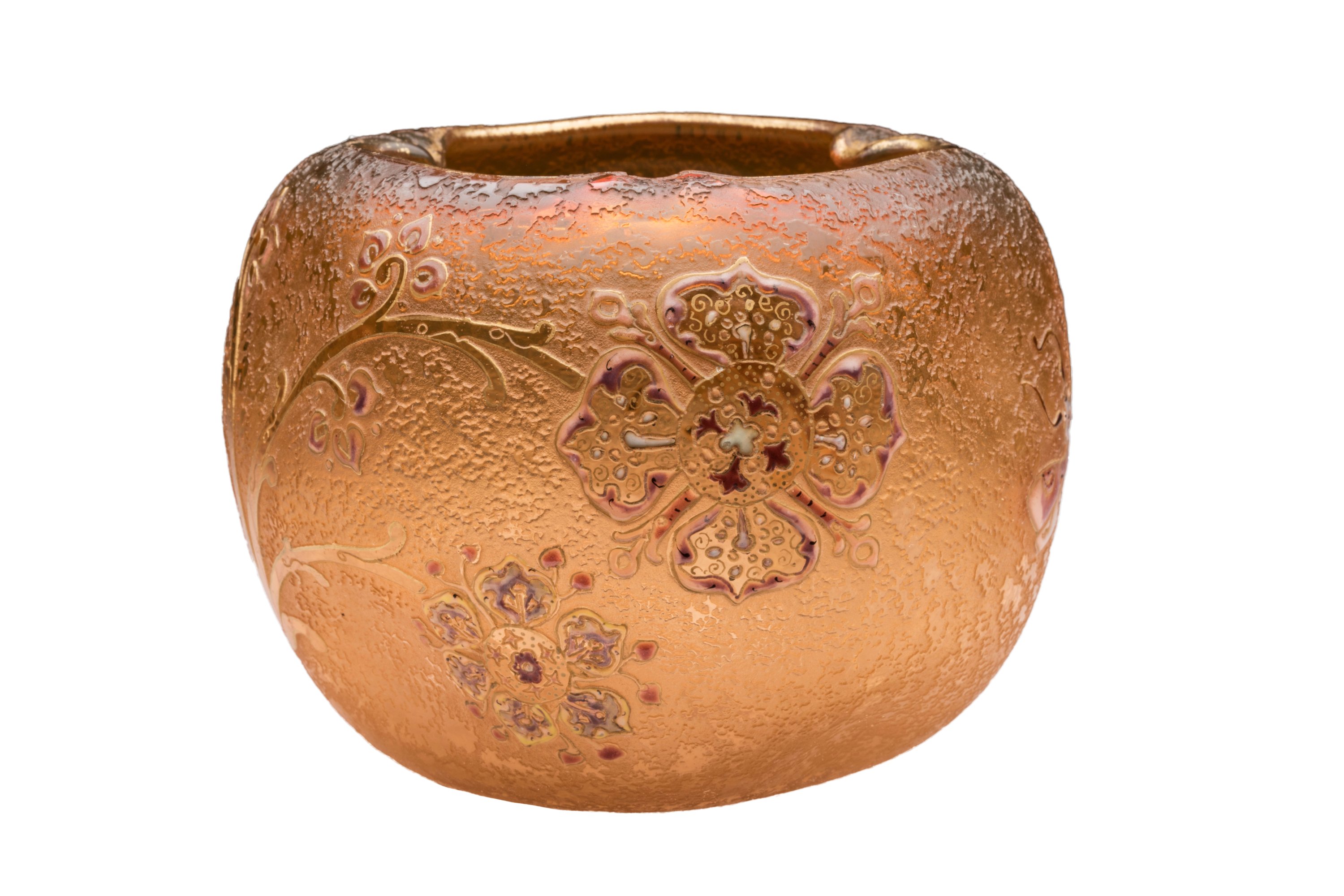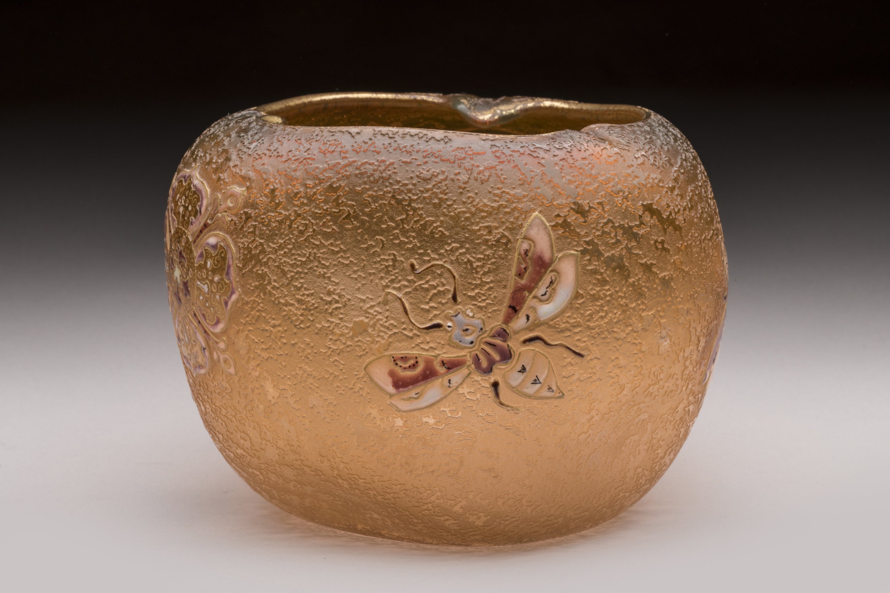 Verre givré orangé au décor dégagé à l’acide, gravé à la roue et émaillé de motifs de fleurs et d'abeilles.