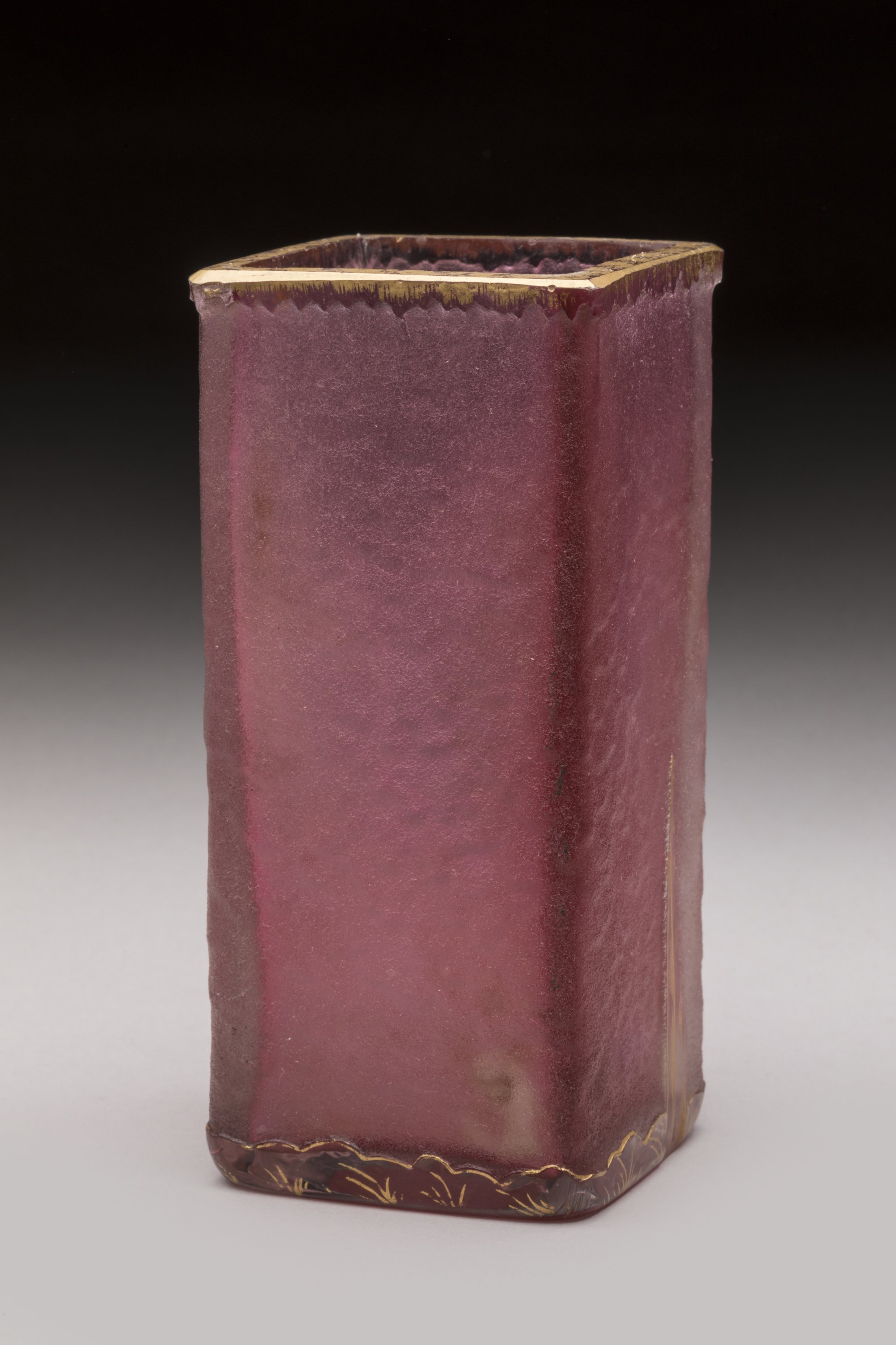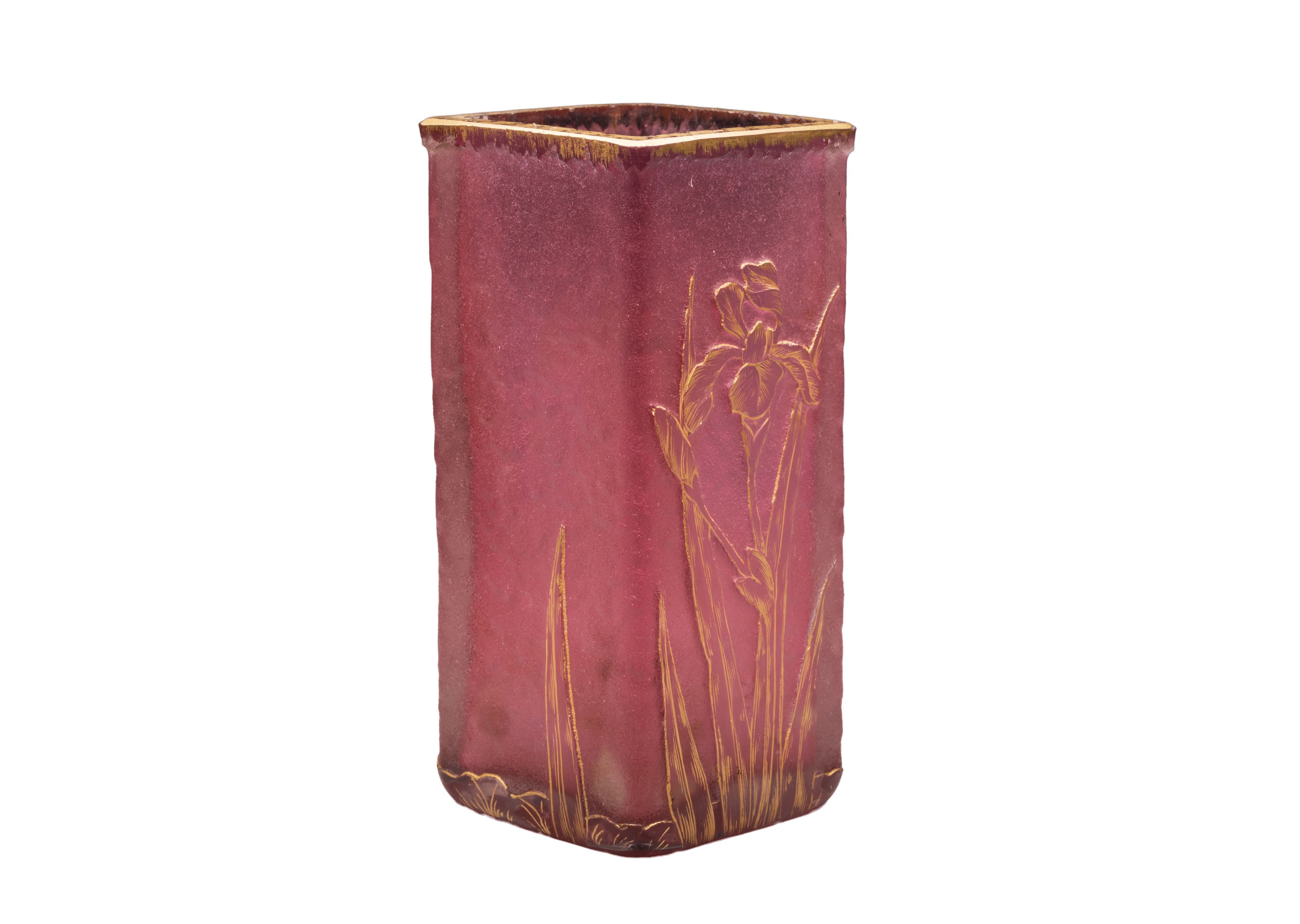 Verre grivé rose de section carrée au décor dégagé à l'acide et gravé à la roue d'iris.