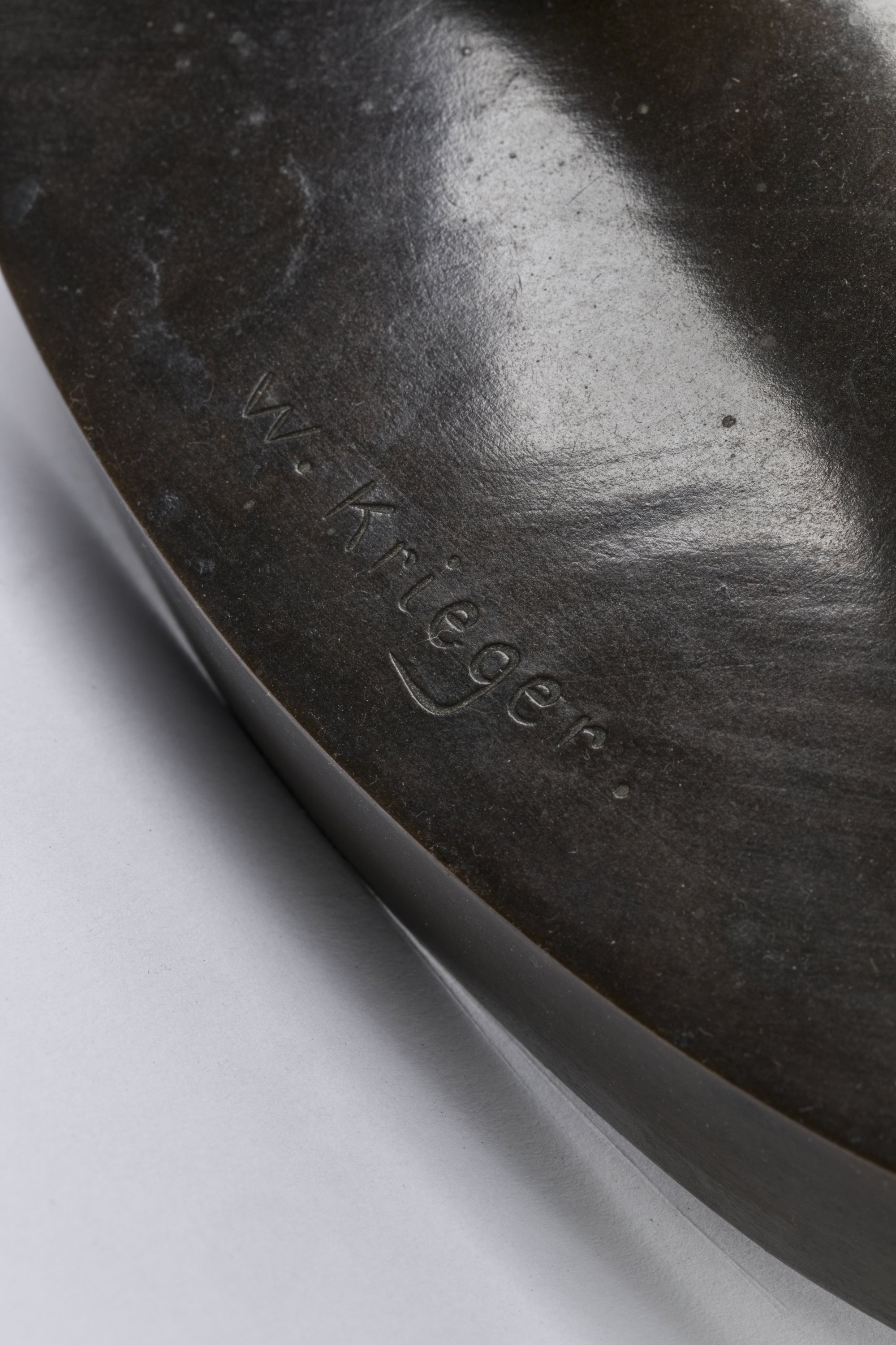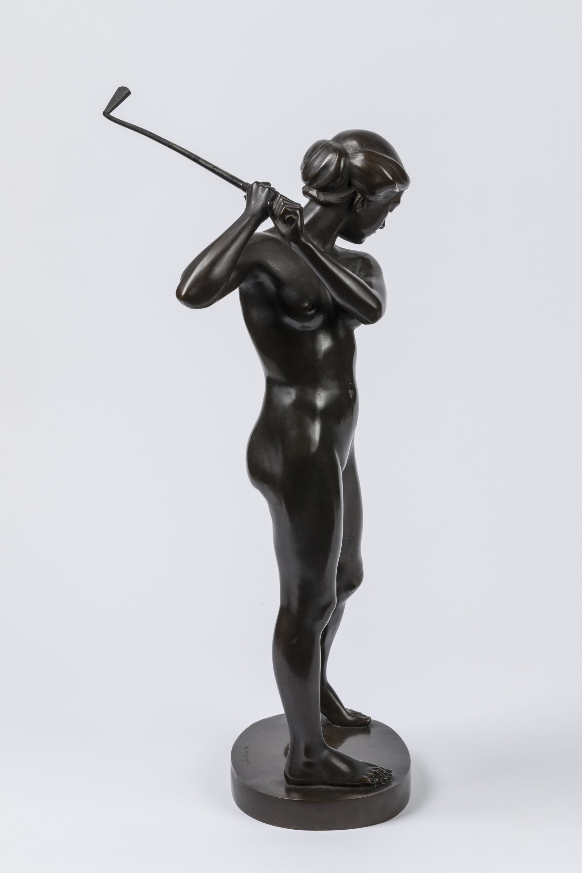 Sculpteur autodidacte, Krieger intègre à partir de 1907 la Sécession munichoise. Il est connu pour ses bronzes animaliers, notamment d'oiseaux, et sa collaboration avec la manufacture de porcelaine Hutschenreuther. Cette sculpture, précoce dans le travail de l'artiste, éclaire d'un jour nouveau l'oeuvre de l'un des plus grands naturalistes allemands du XXe siècle. Ses portraits familiaux référencés autour de 1910 sont en effet rares et portent cette même signature arrondie, telle celle figurant sur "Stehender Knabe", c. 1910 (vente Quittenbaum, Munich, 18/11/2015, n° 566). La coiffure typique du début des années 1900 est similaire à celle du "Bust of an Art Nouveau Lady", c. 1910 (vente Mehlis GmbH, Plauen, 27/05/2023, n°36517). En 1912, Krieger épouse Emilie Butters, céramiste, qui lui donne cinq enfants, dont le plus jeune d'entre eux, Hajo, est co-auteur du catalogue raisonné de l'oeuvre de son père. Ce bronze est ainsi décrit dans le répertoire de l'oeuvre : "Sportive nue tenant un club de golf derrière sa tête bien coiffée, prenant de l'élan pour frapper la balle. En appui sur sa jambe droite, la jambe gauche légèrement tournée vers l'extérieur".