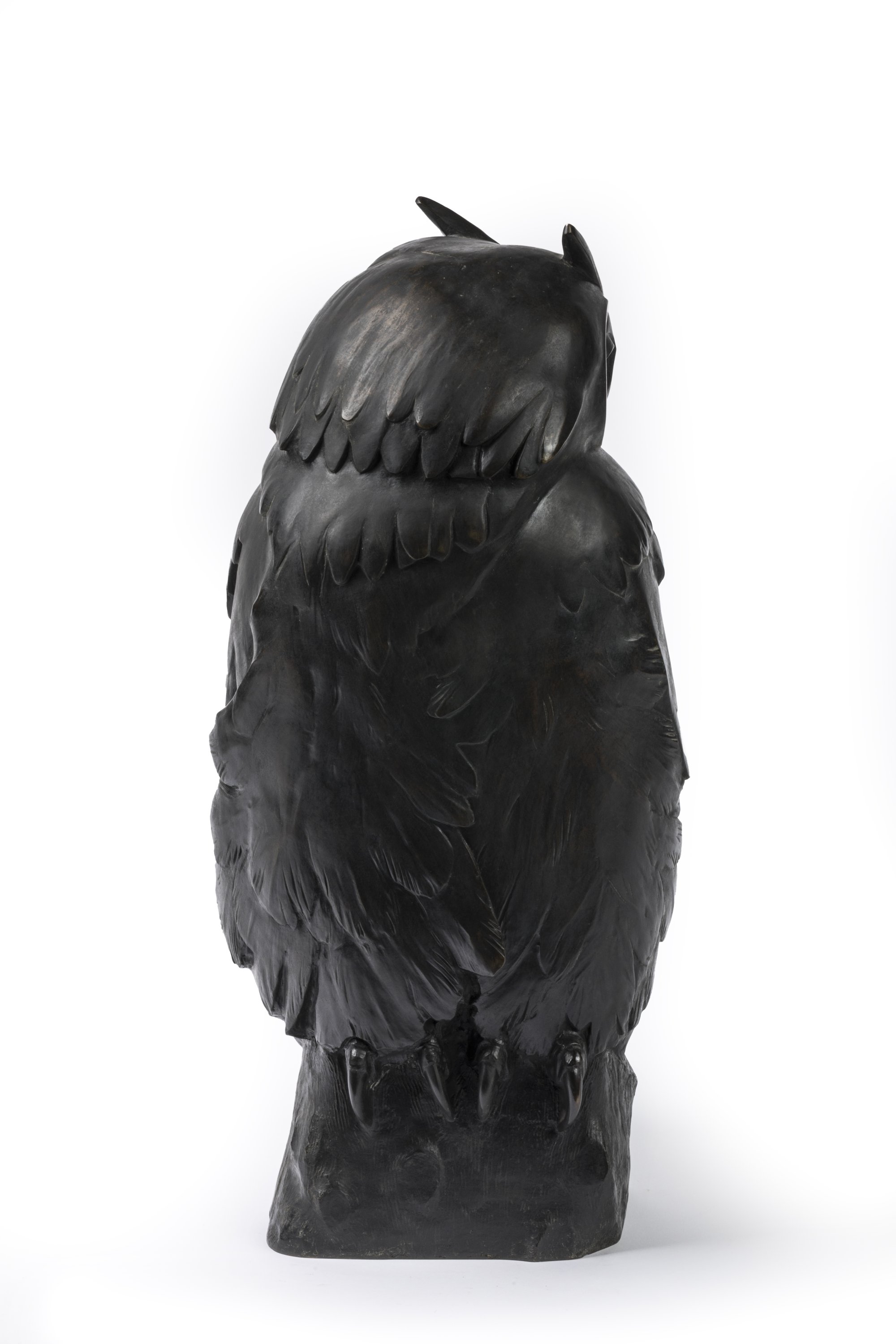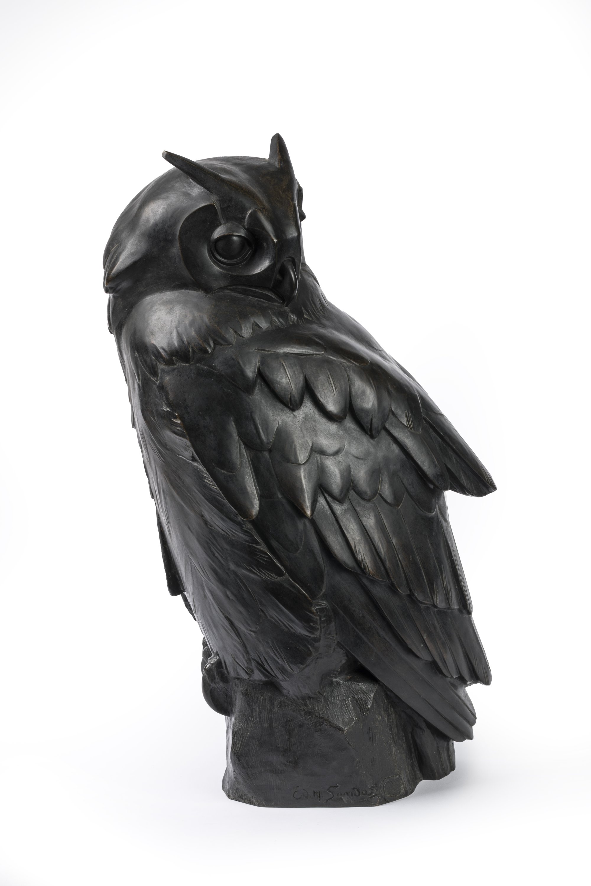 Le grand-duc est l’animal fétiche d’Edouard Marcel Sandoz, qui réalise son premier portrait d’animal en 1908, alors qu’il attrape un petit hibou lors d’un voyage en Sicile. Le rapace nocturne devient le sujet le plus représenté dans le corpus du sculpteur. Contrairement à d’autres artistes animaliers, hantant les zoos à la recherche de bêtes sauvages en captivité, Sandoz puise, lui, son répertoire dans l’observation d’animaux indigènes et pacifiques, dont il souligne la bizarrerie de la silhouette, la cocasserie de l’allure où, comme ici, la gravité de l’attitude.